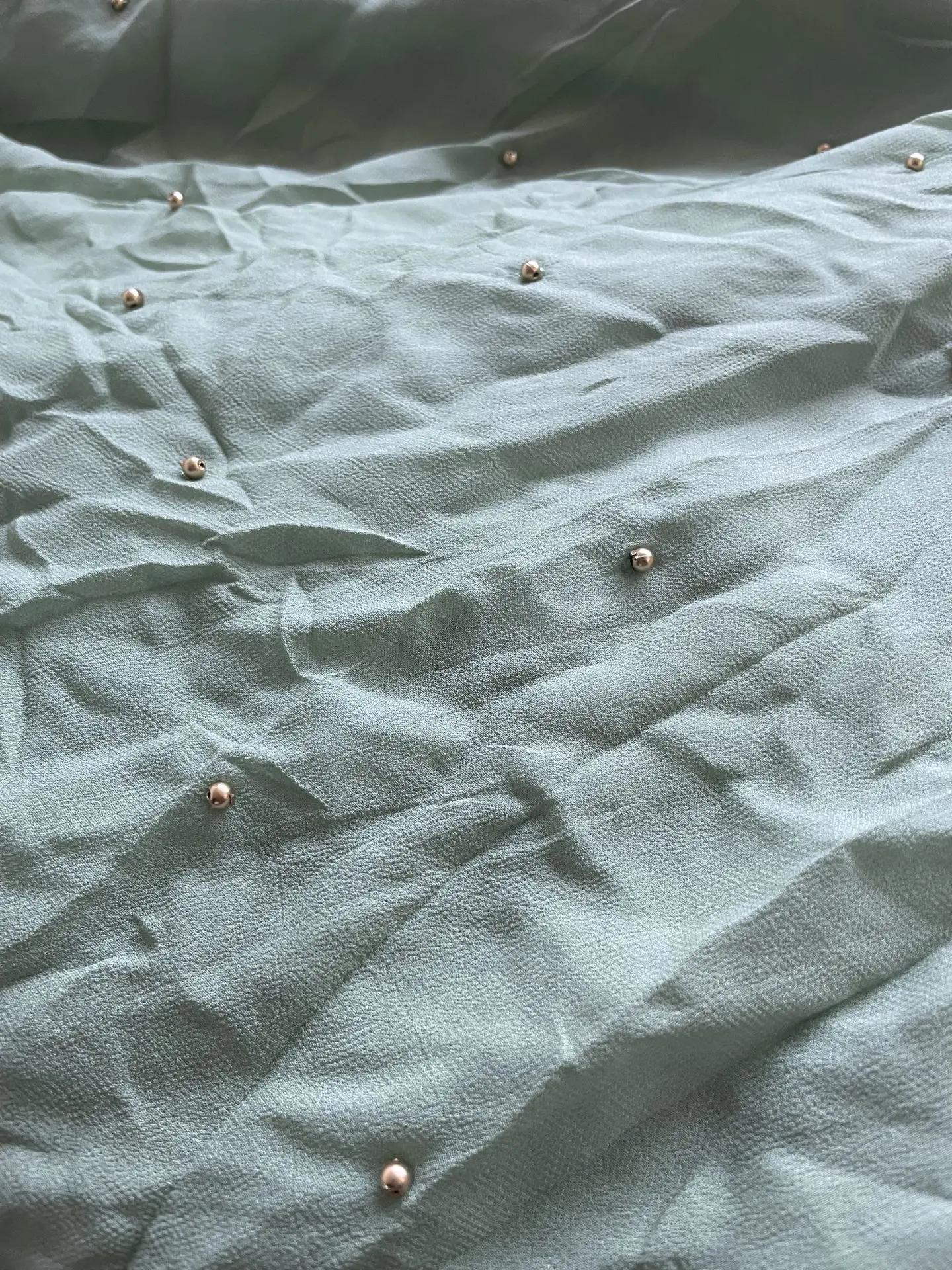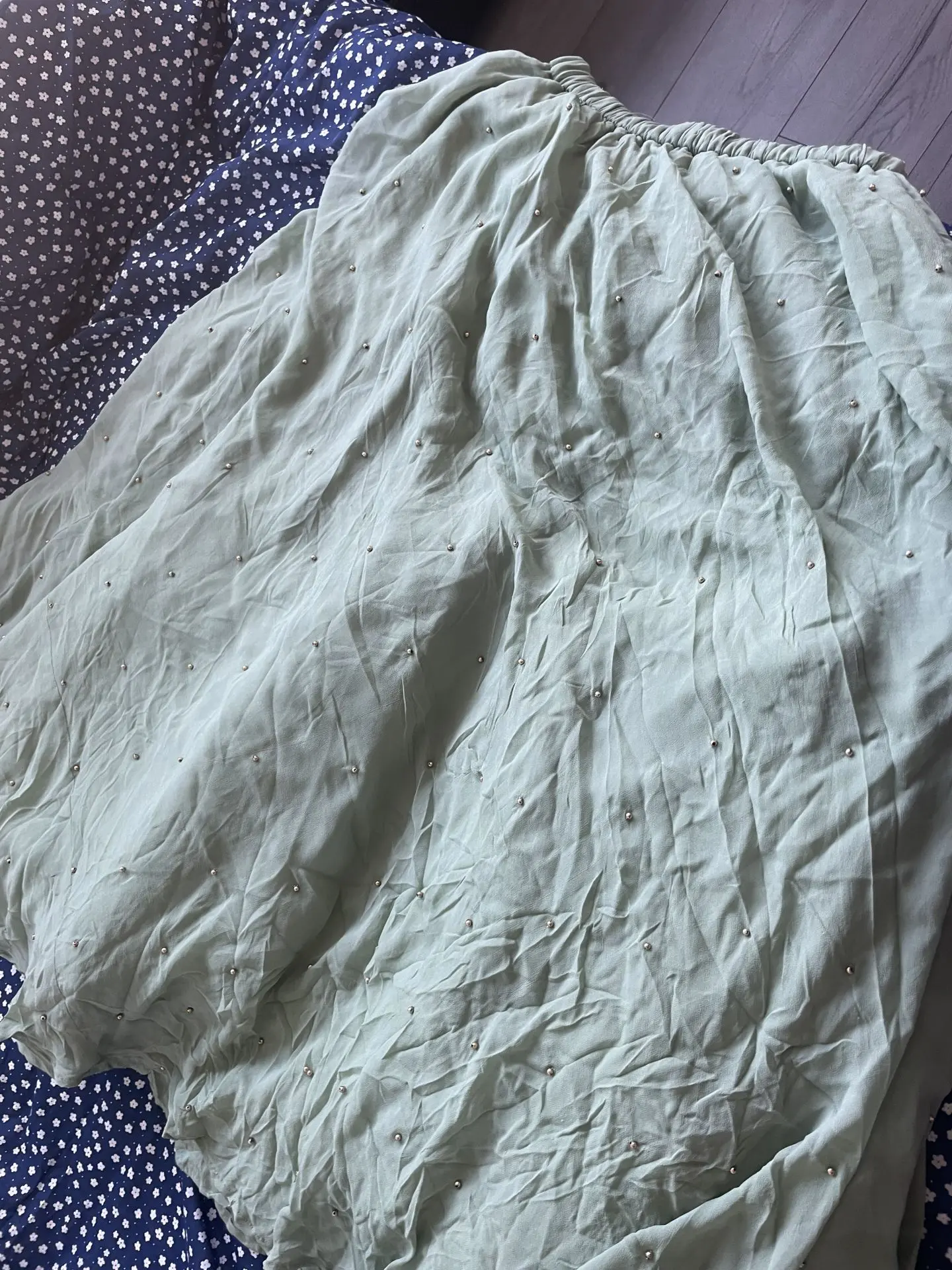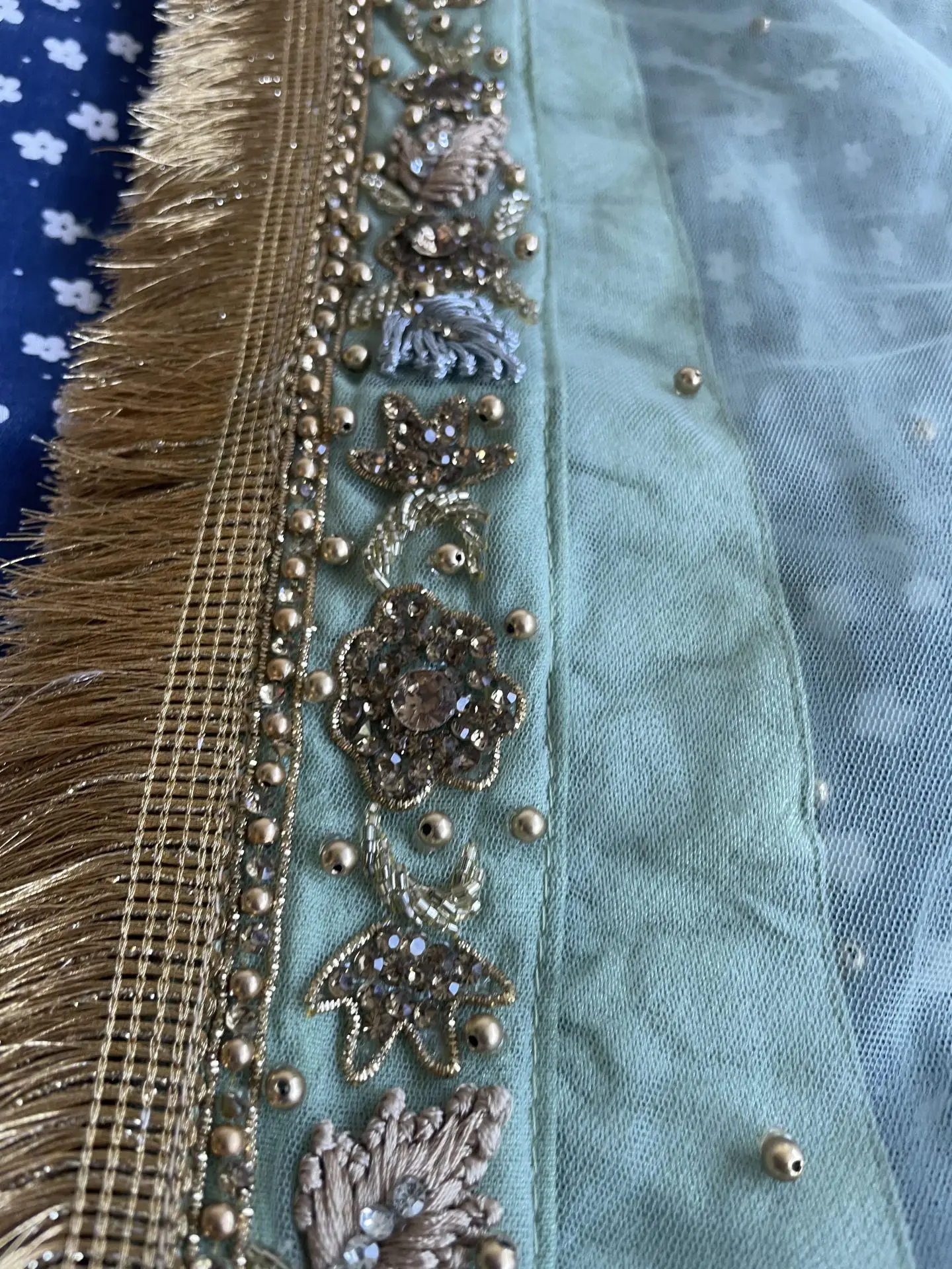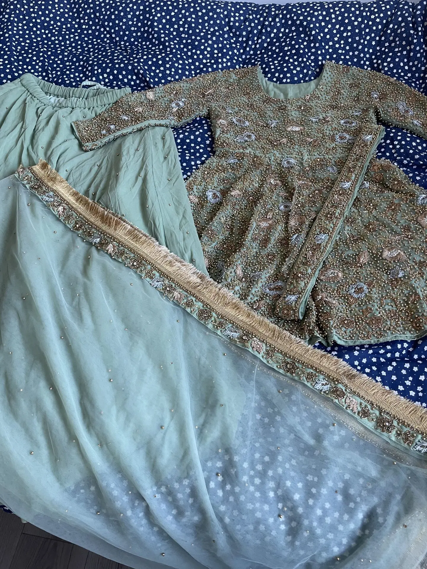 Gorgeous Peplum paired with a stylish silk lengha. Olive green/Khaki green colour with gold and silver embroidery on the top piece. Skirt is plain with gold pearl balls. Scarf is designed with border embroidered as seen on the top, tassels throughout edge of the scarf and also pearls! Comes with a belt for extra fitting as per your desire. Lengha is for size small/medium. Has only been worn ONCE and is in perfect condition/laundry washed!