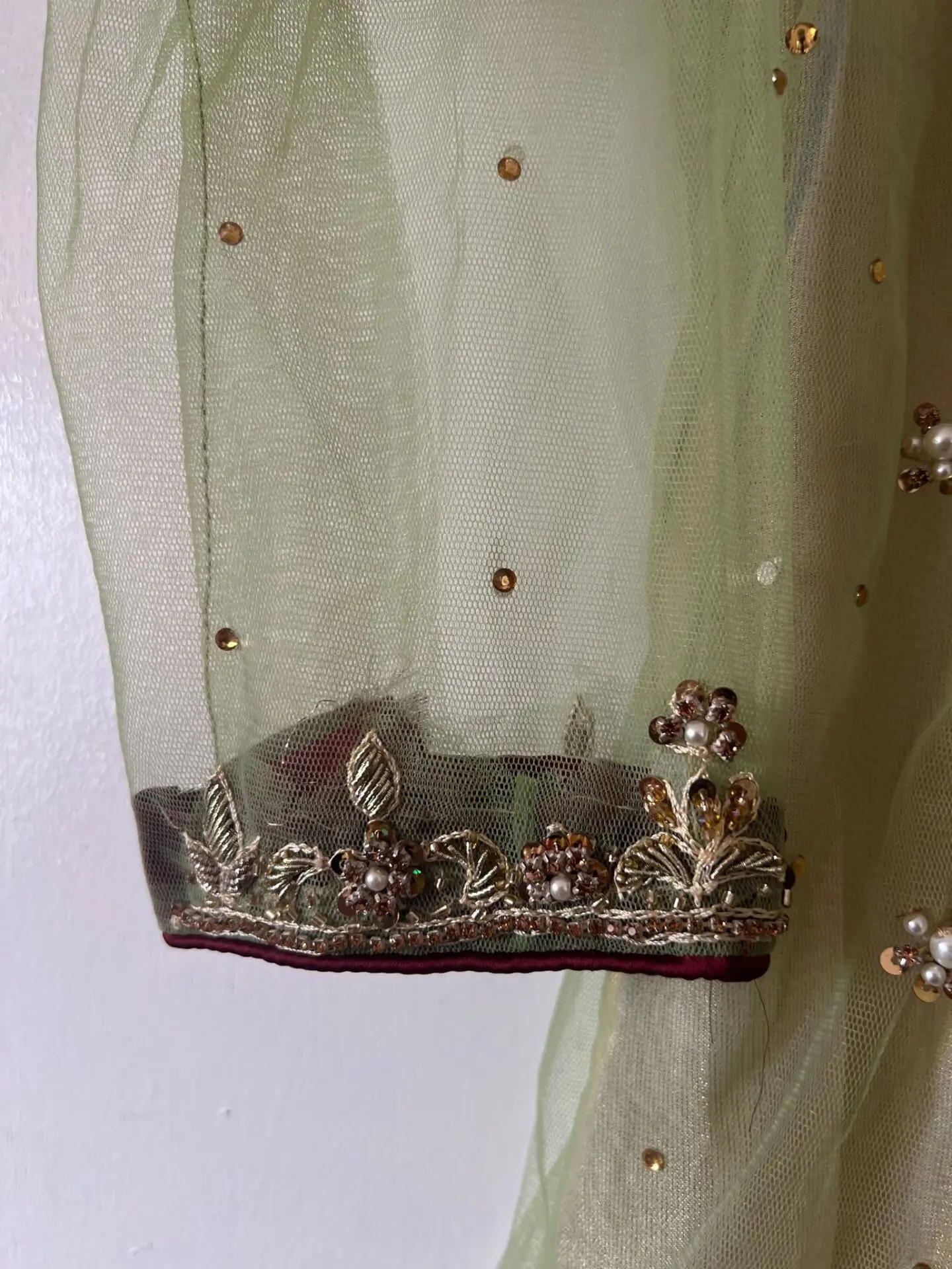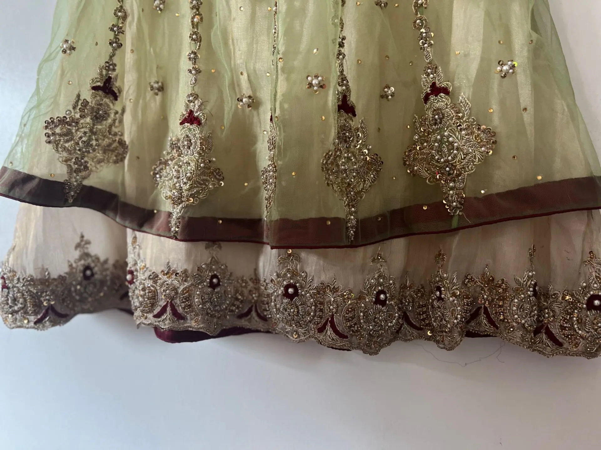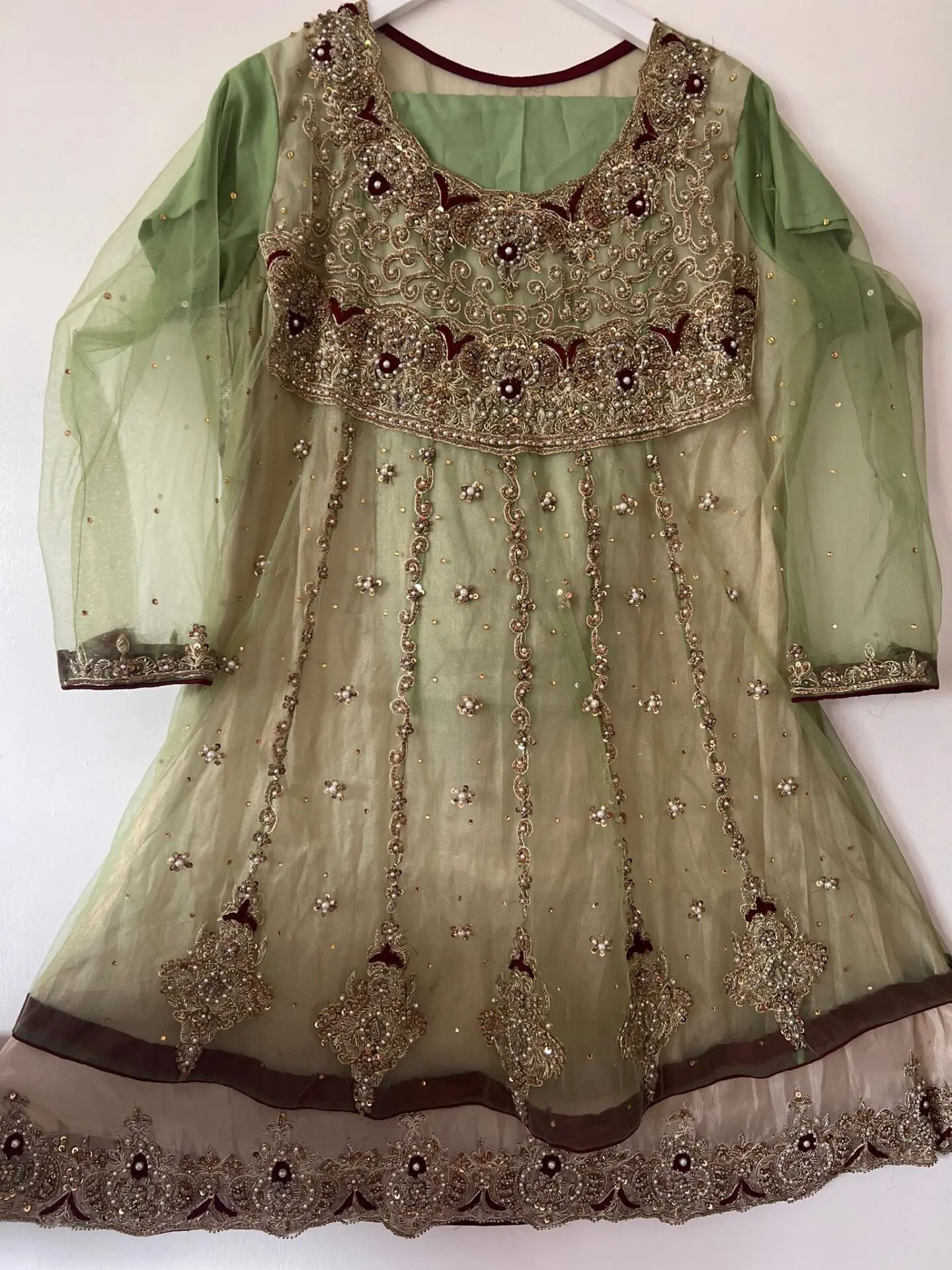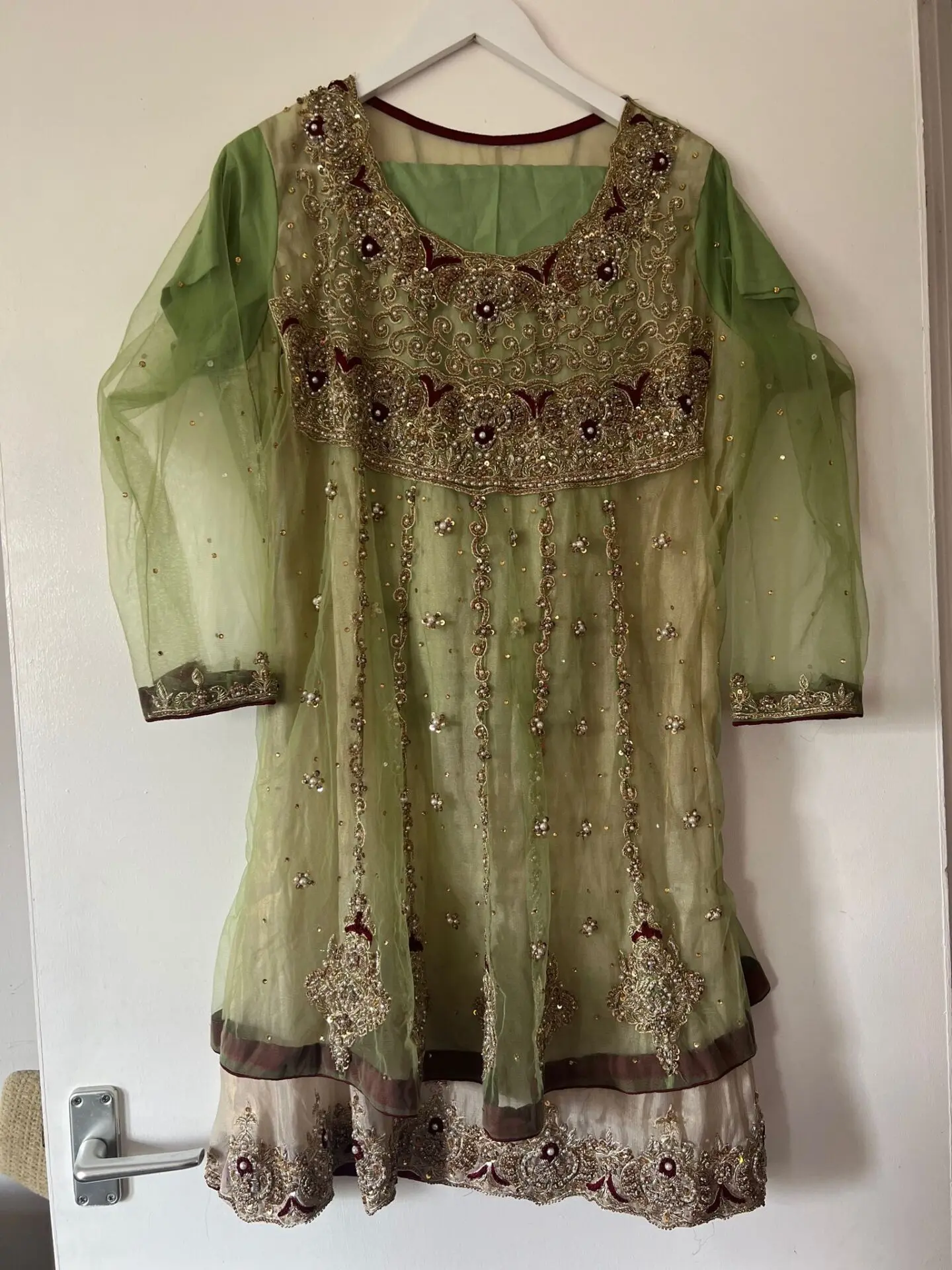 Heavy embroidered kameez and trousers. Kameez has full Kaam on it. Its a frock style kameez with straight trousers. Tailor made. Wrong size was made hence selling it now. Its size L. Worn once
