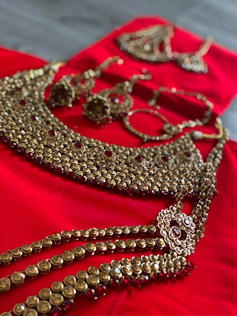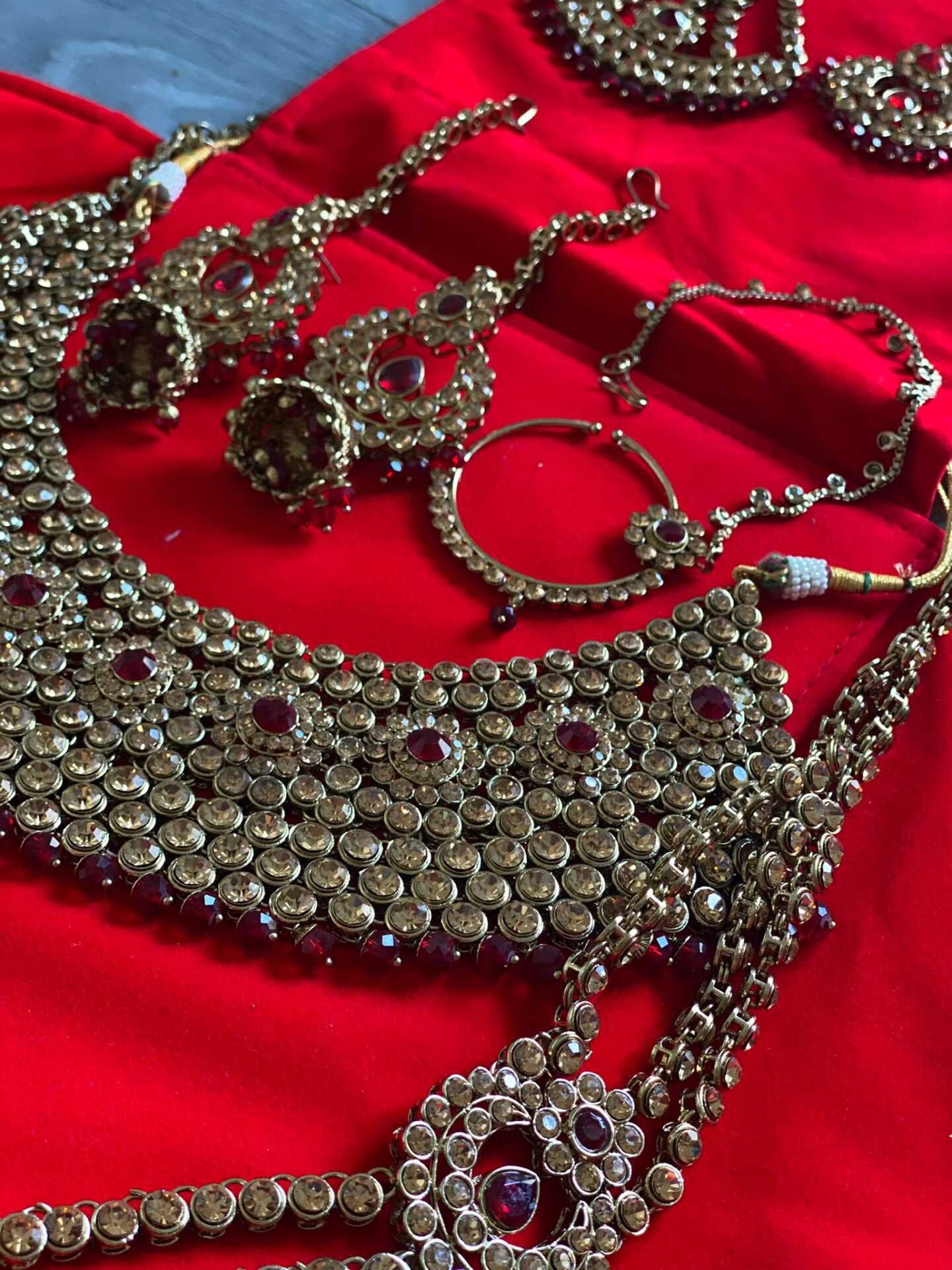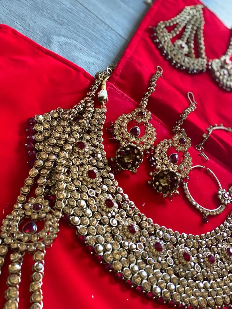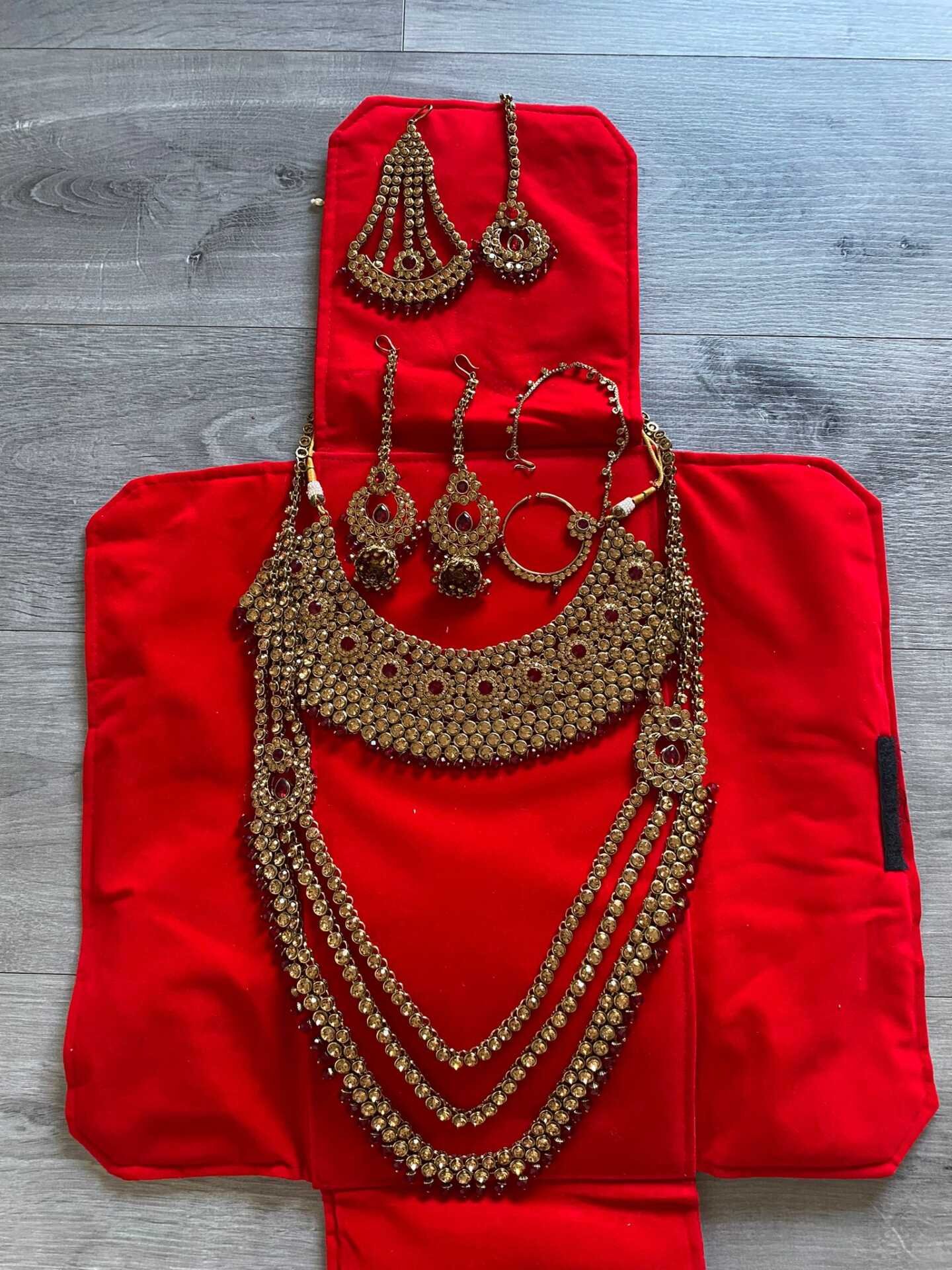 The following Asian bridal jewellery set includes, 2 necklace sets, side head piece, earrings, tikka and nose ring.