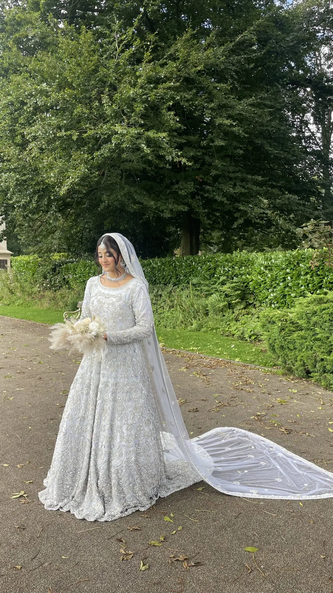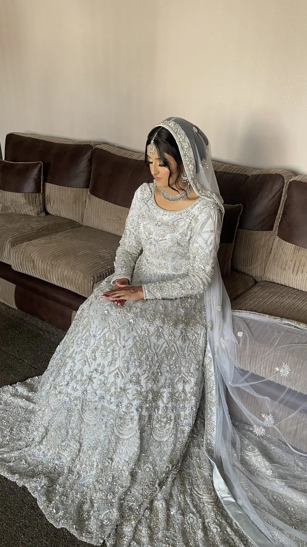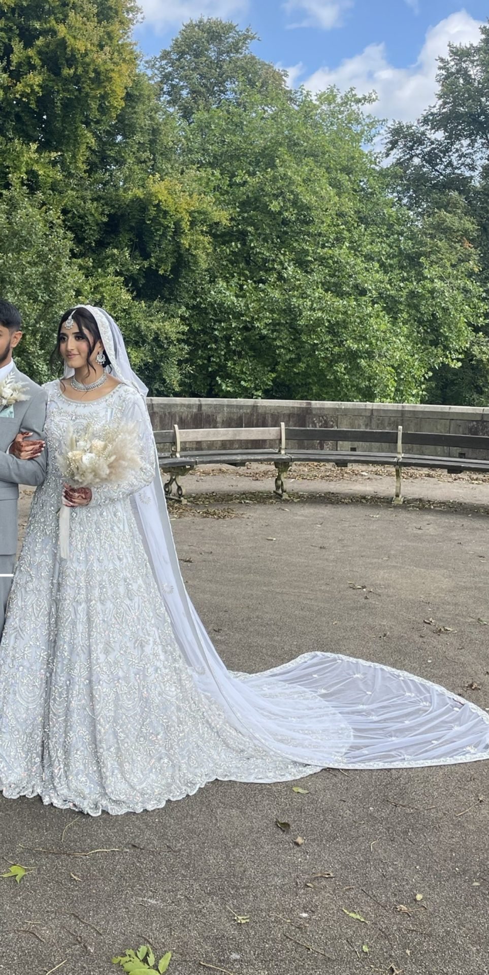Light Silver Embroidered Asian Wedding dress with trail. See images as can look white in the light.