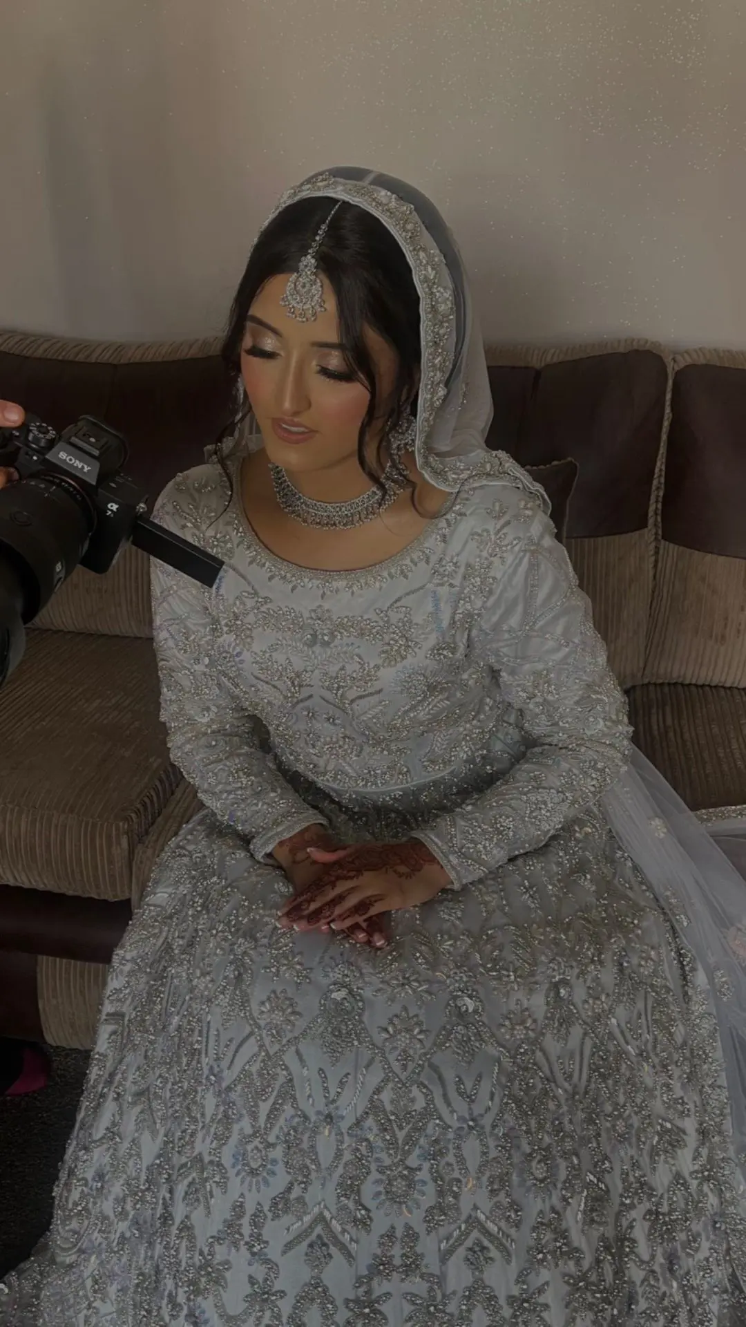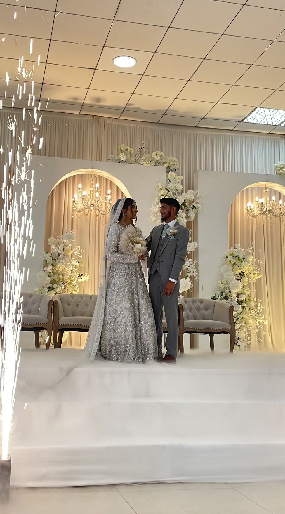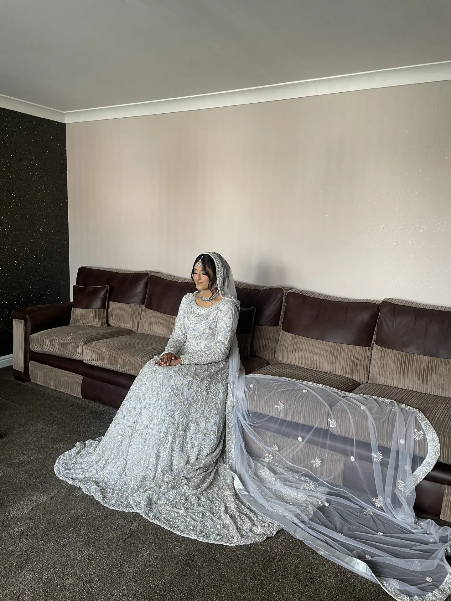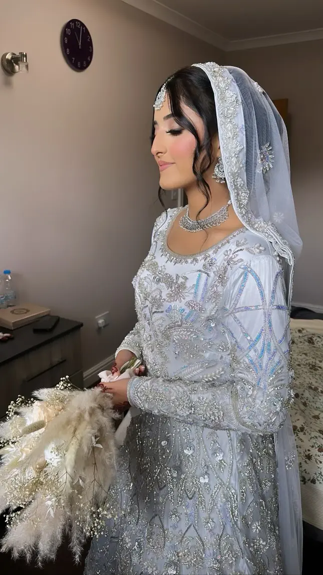 Light Silver Embroidered Asian Wedding dress with trail. See images as can look white in the light.