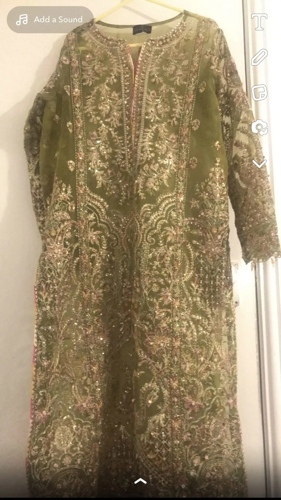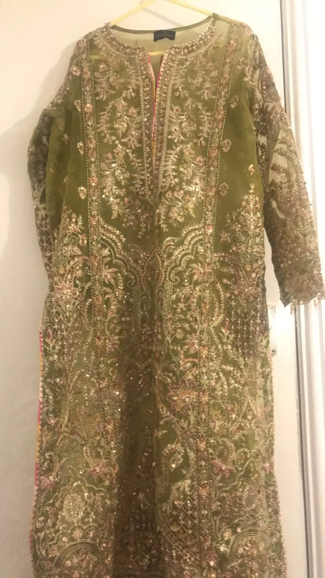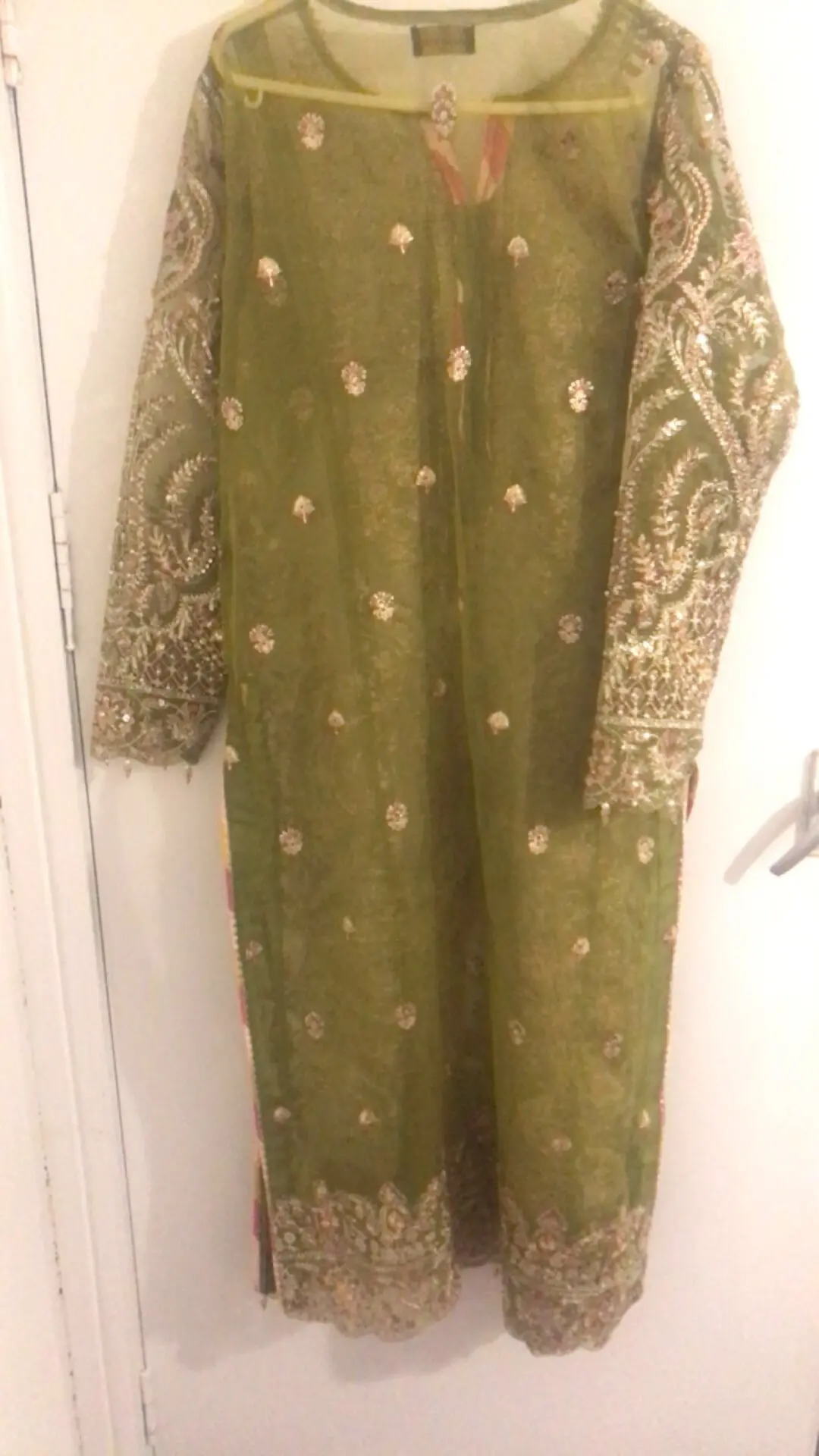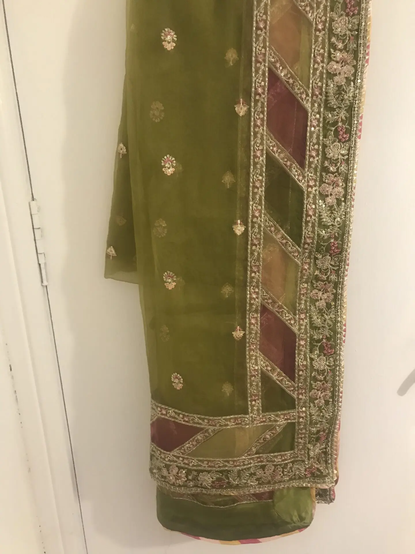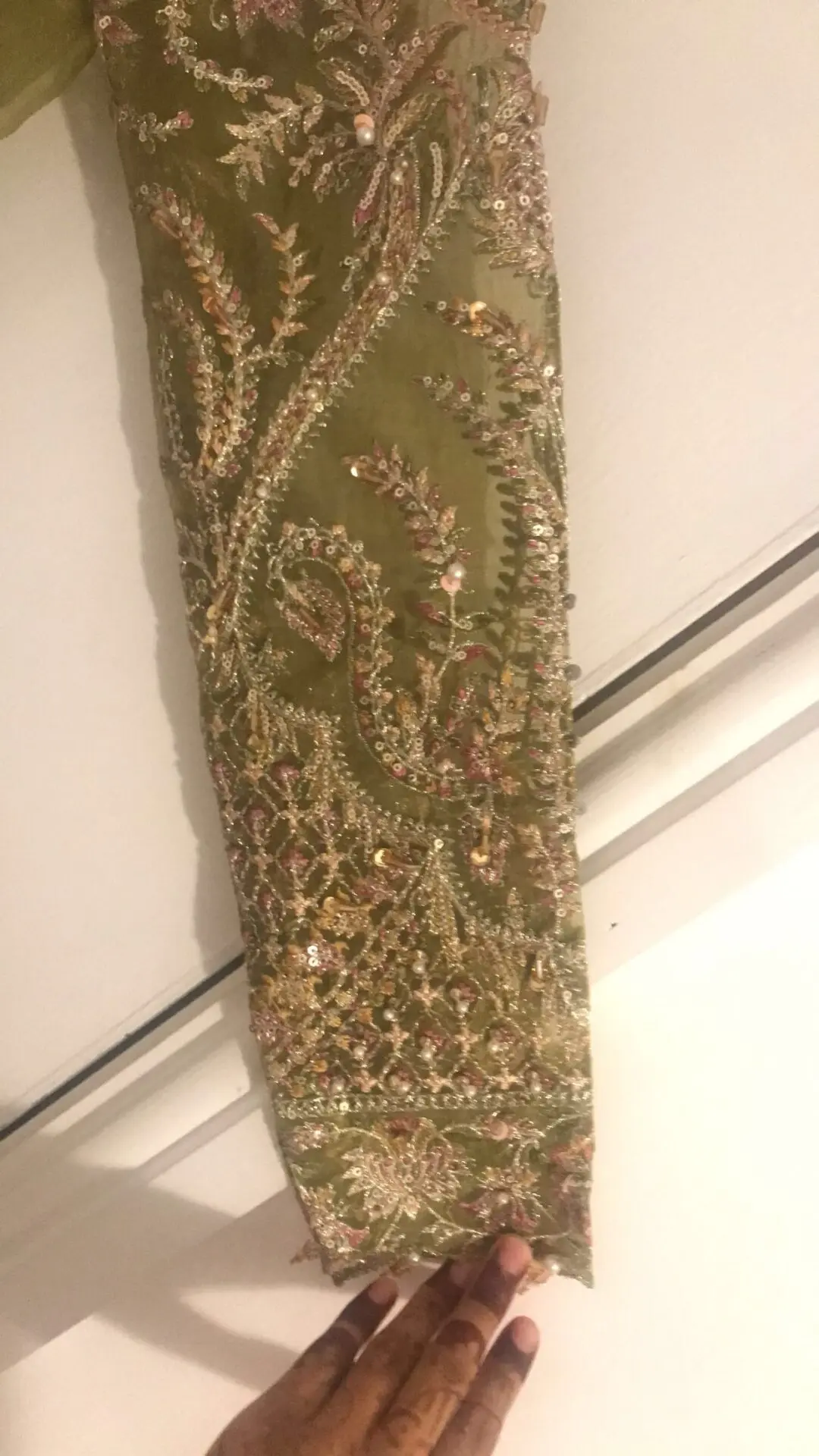 - A gorgeous light green kameez embroidered with multiple sequences and beads to give a versatile touch of elegance. A long scarf with beautiful multi colours inside it perfect to match the henna look.