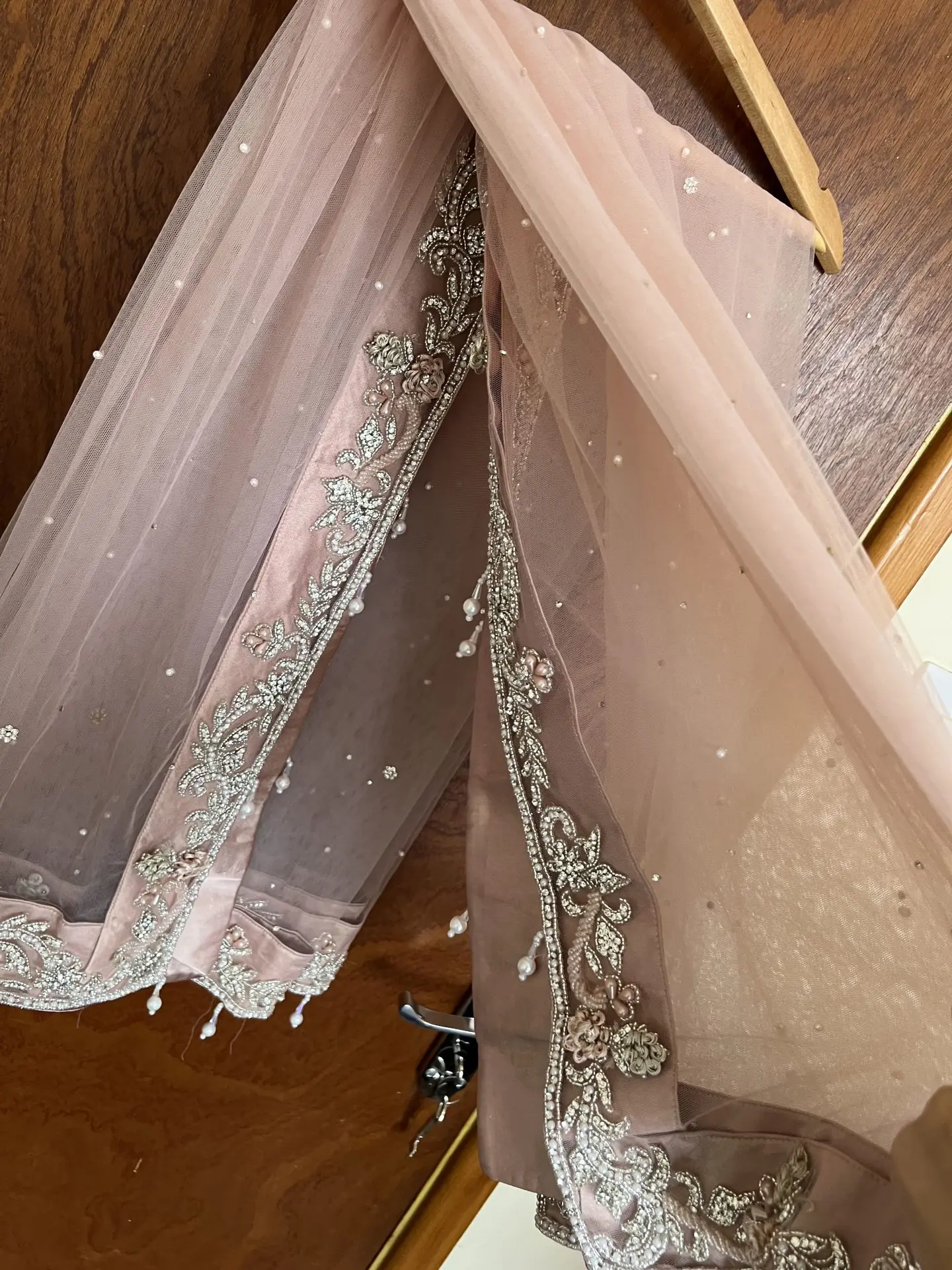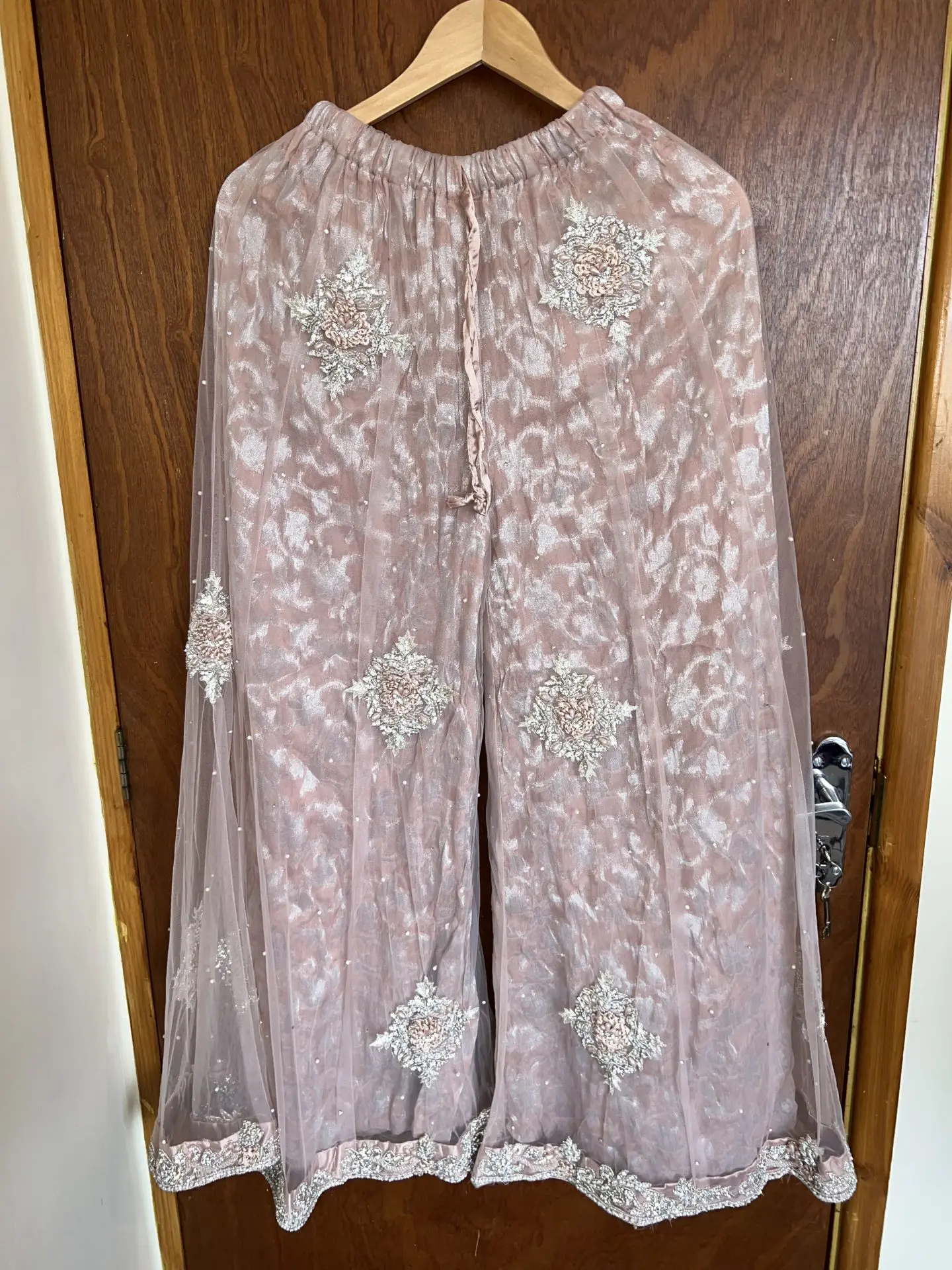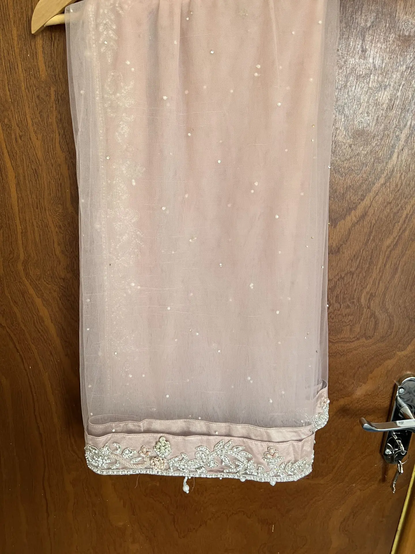 Pakistani light peachy pink sharara and peplum dress with net dupatta. Heavy work, diamonds and pearl work on sharara and the midi dress, also on the dupatta. Have been worn once for couple hours. I am open to offers. Please message me for more details. Size- Small