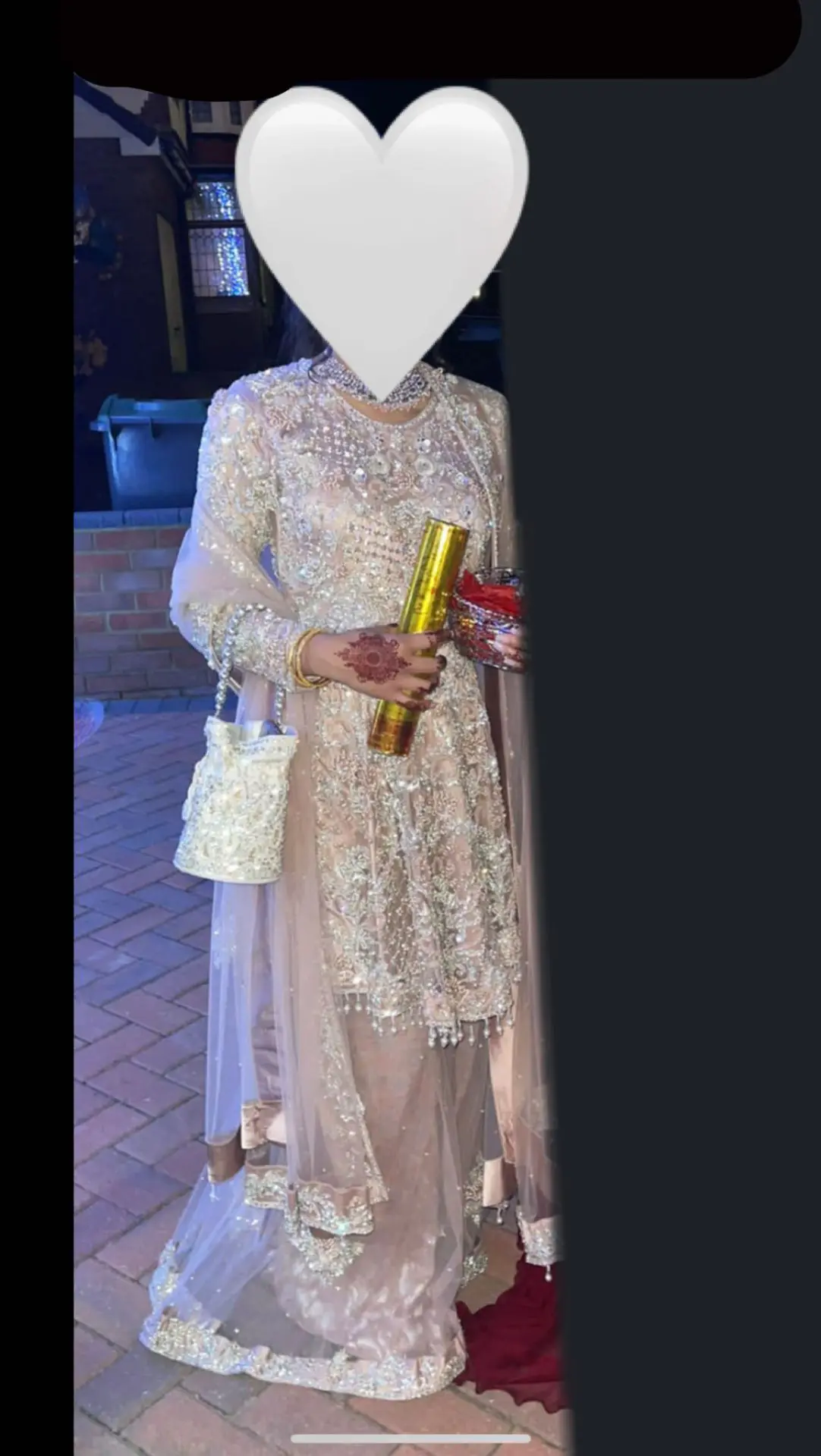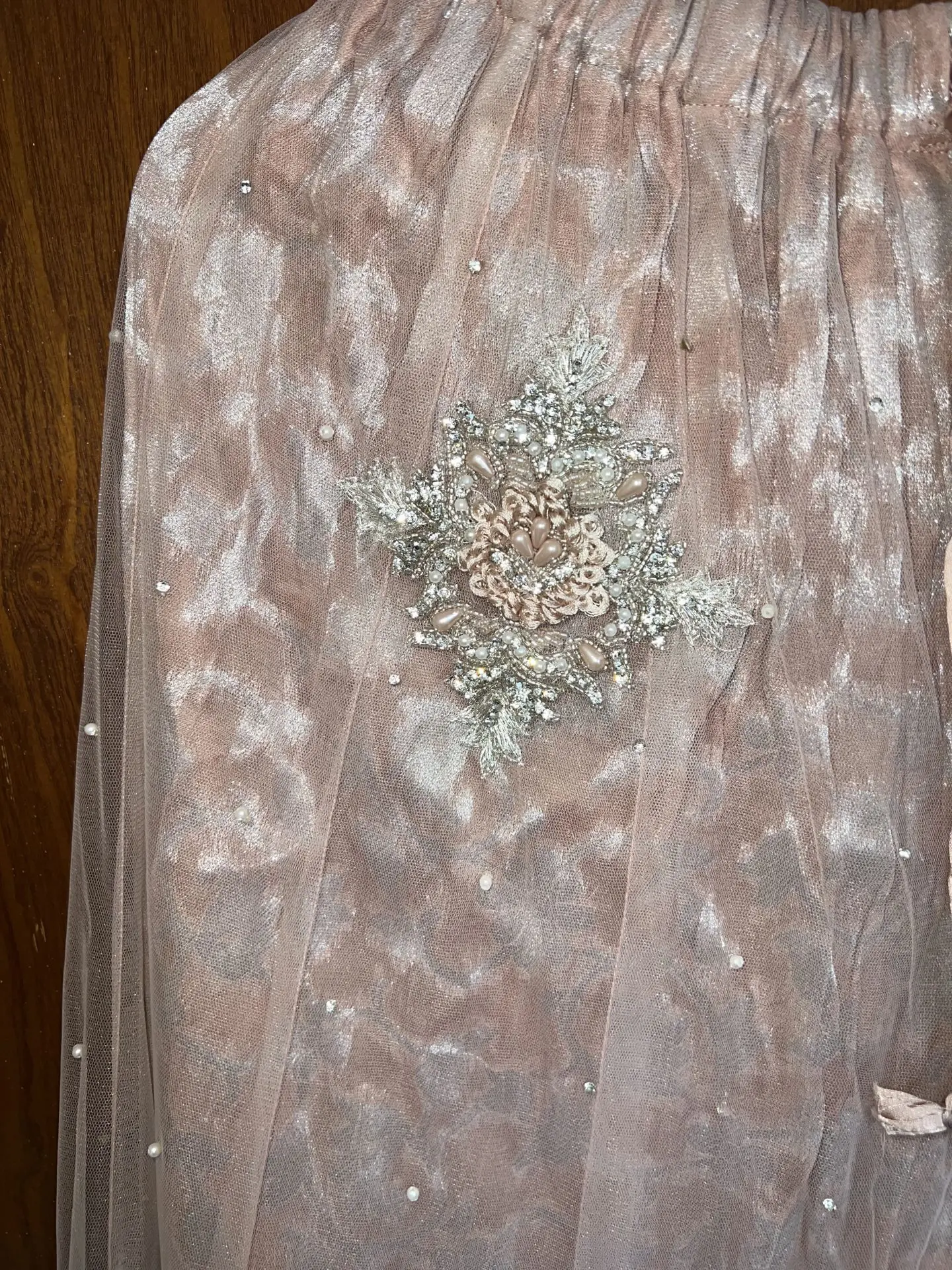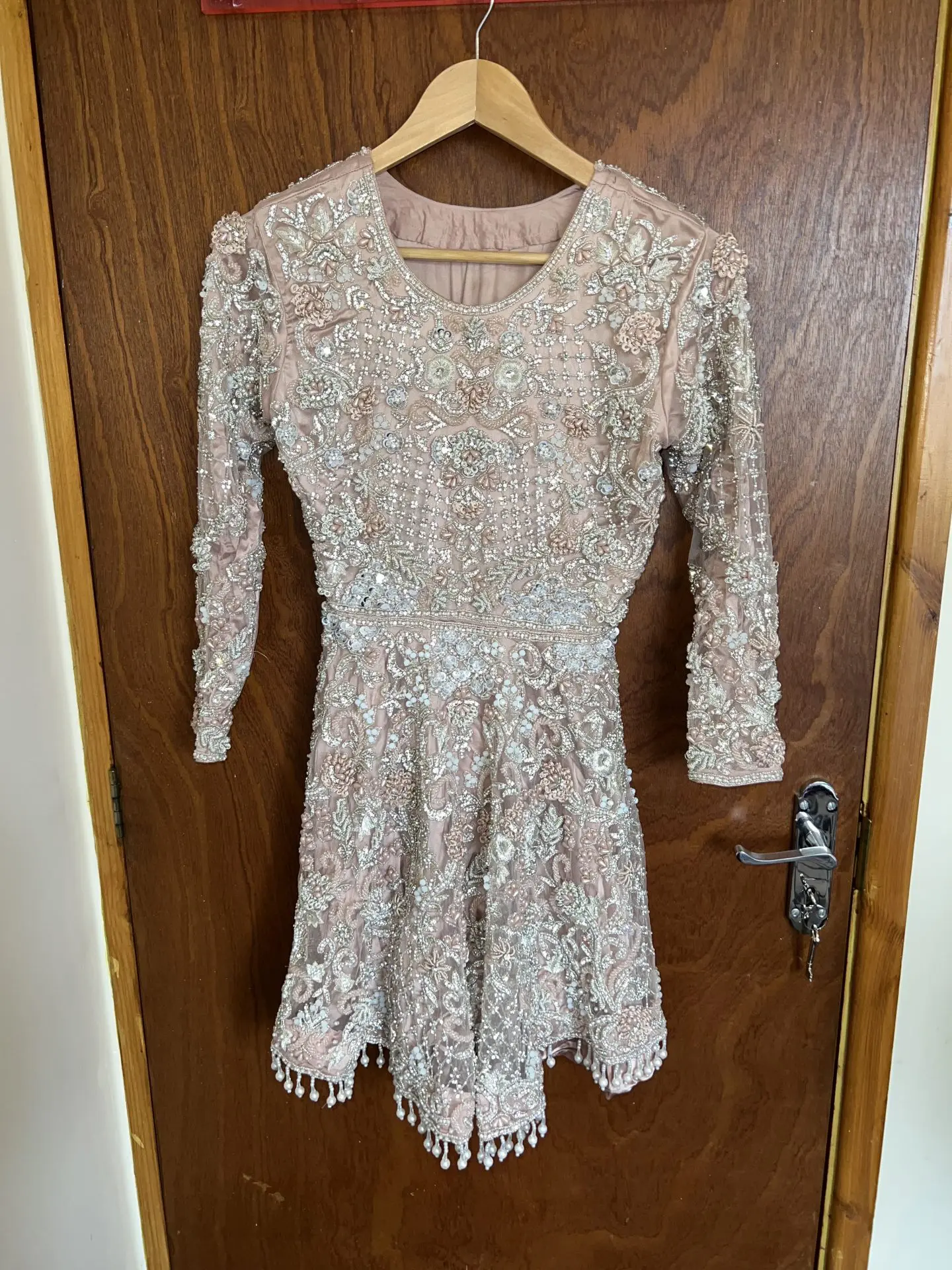 Pakistani light peachy pink sharara and peplum dress with net dupatta. Heavy work, diamonds and pearl work on sharara and the midi dress, also on the dupatta. Have been worn once for couple hours. I am open to offers. Please message me for more details. Size- Small