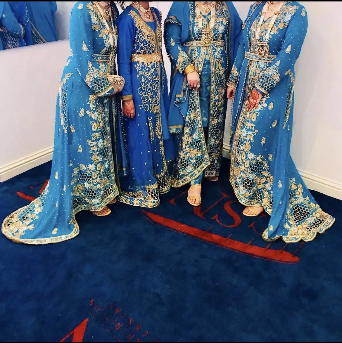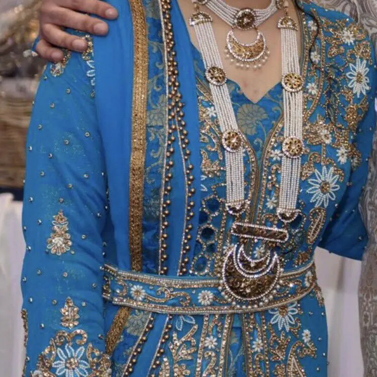 Blue and gold heavily embroidered Asian trail dresses