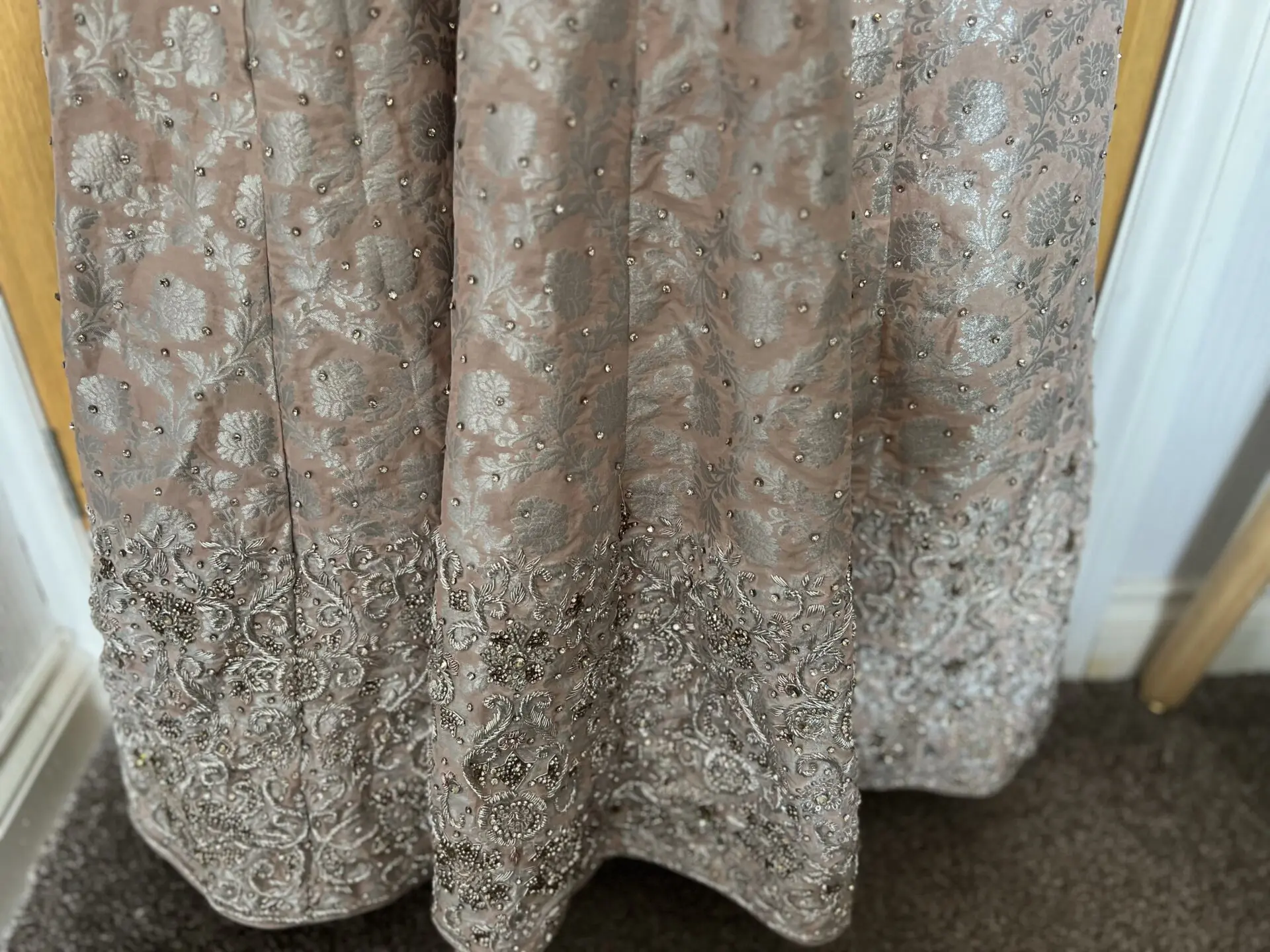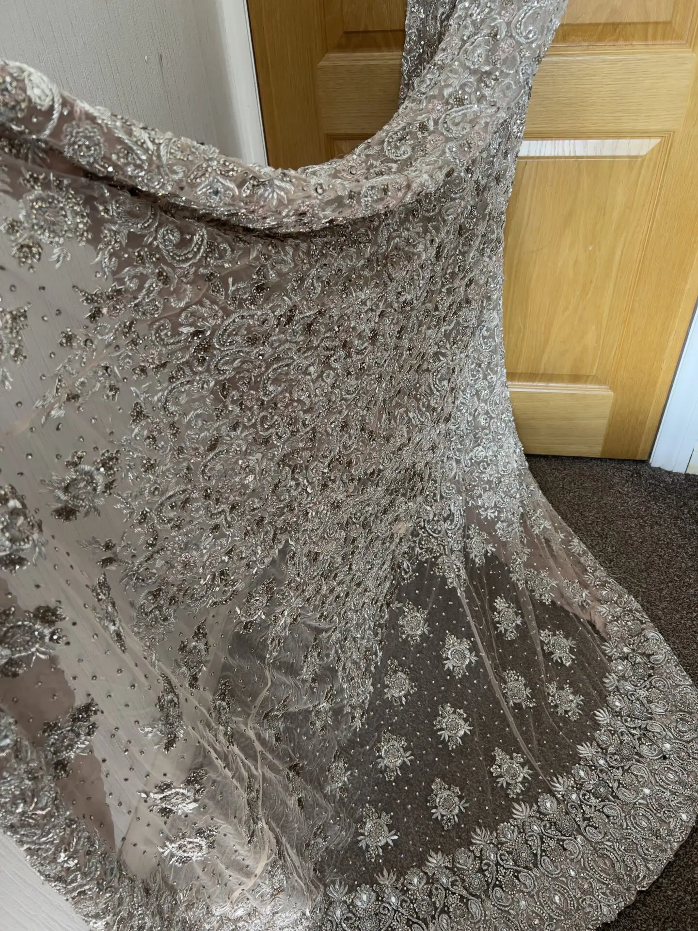 Total 3 pieces of bridal dress. Outer part is with long trail, scarf, and inner is a anarkali