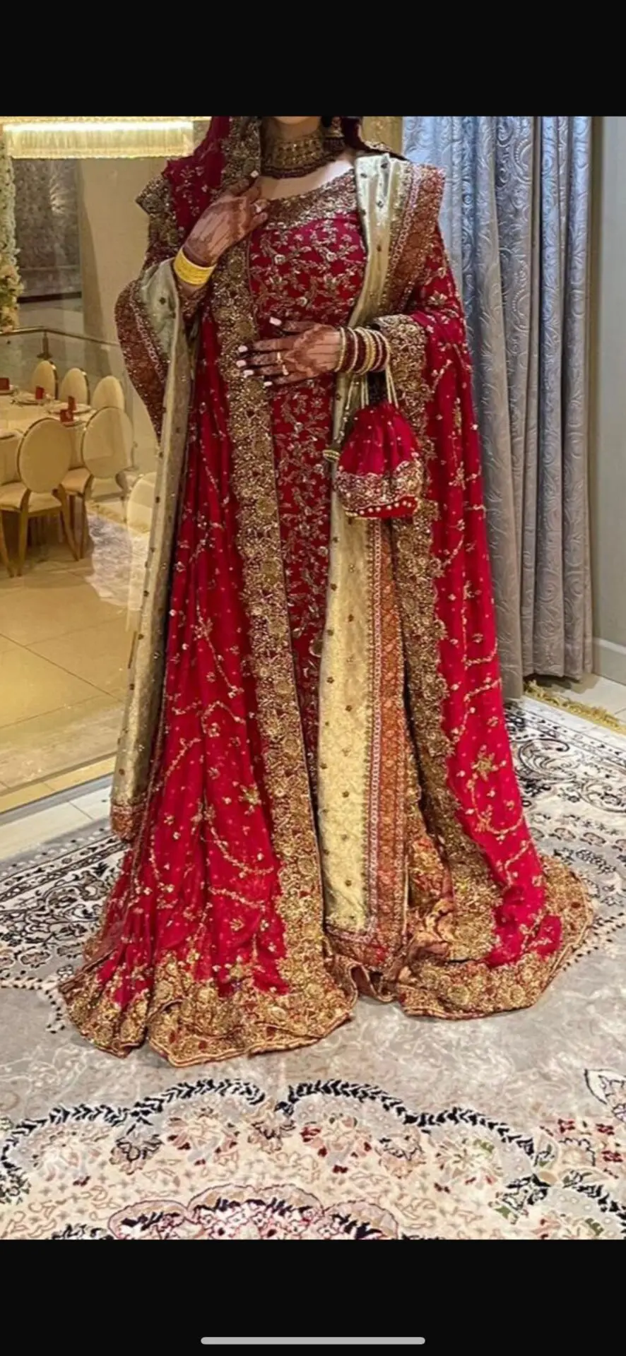 4 piece set: Long kameez, Farshi Lengha, x2 Dupatta (x1 champagne and x1 deep red)