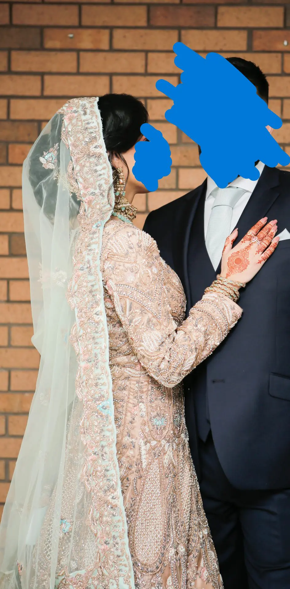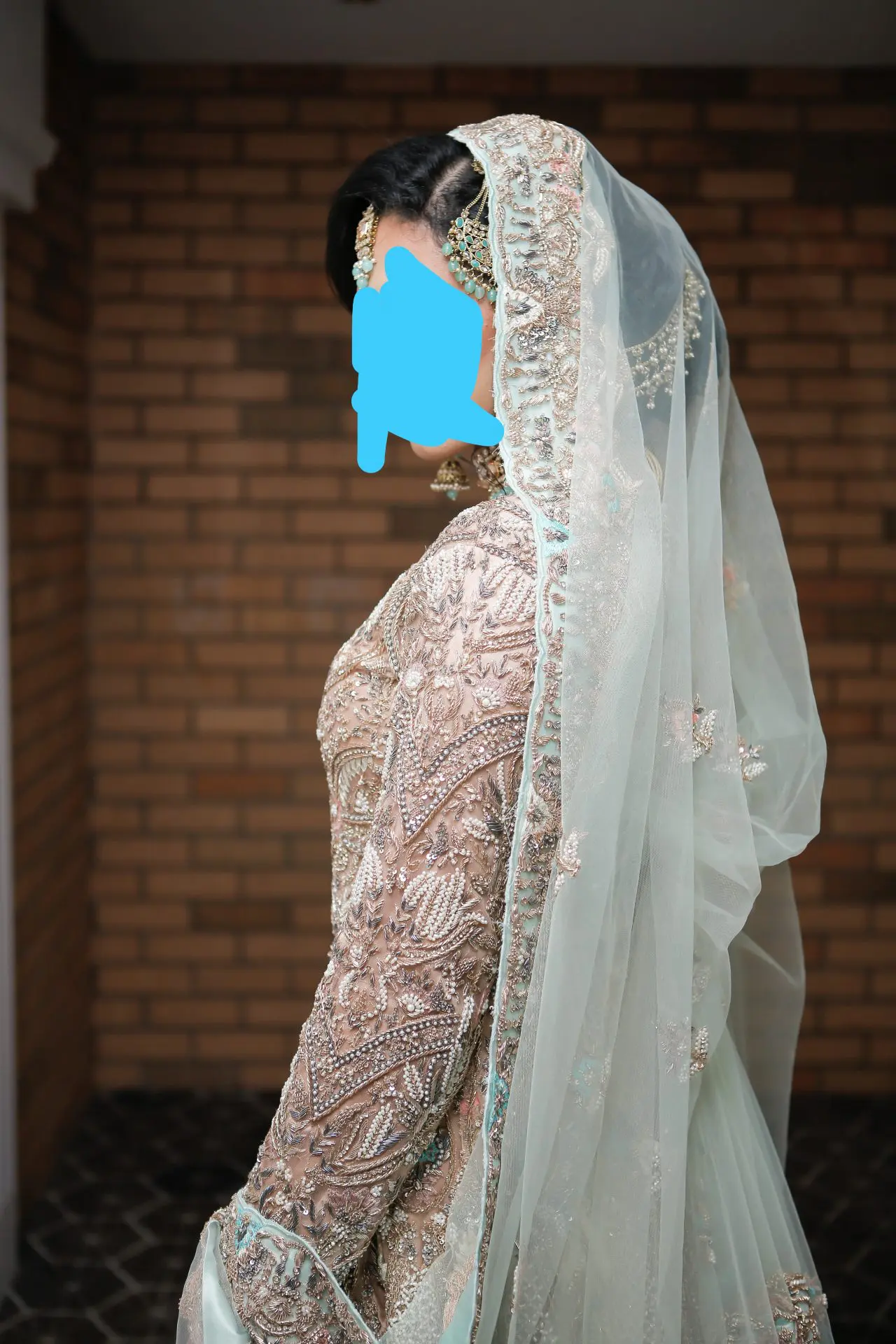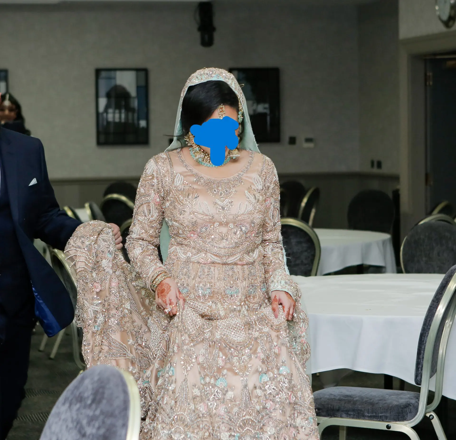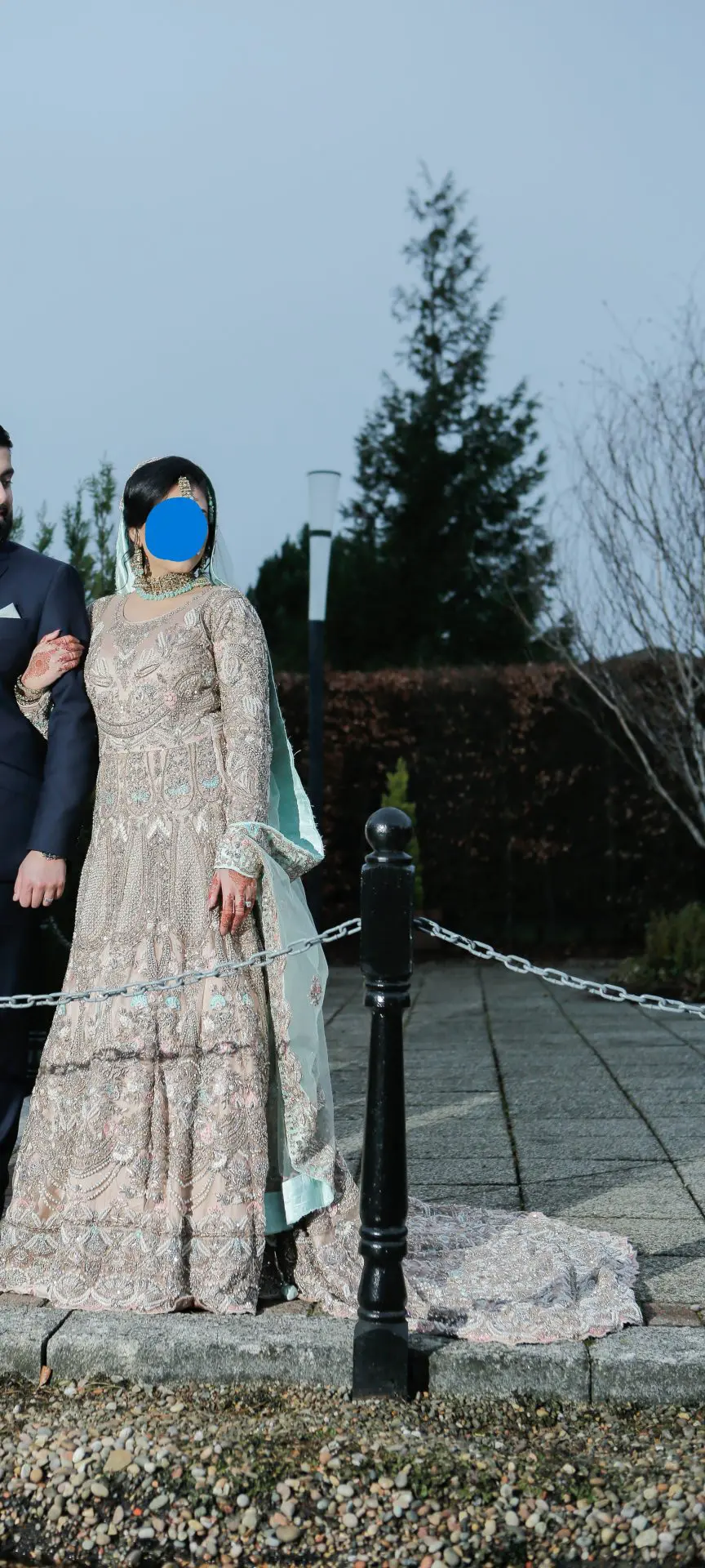 Beautiful Walima dress. worn once for a few hours. Colour is nude/beige with a teal dupatta and some of the embroidery on the dress is light pink. gorgeous pastel dress