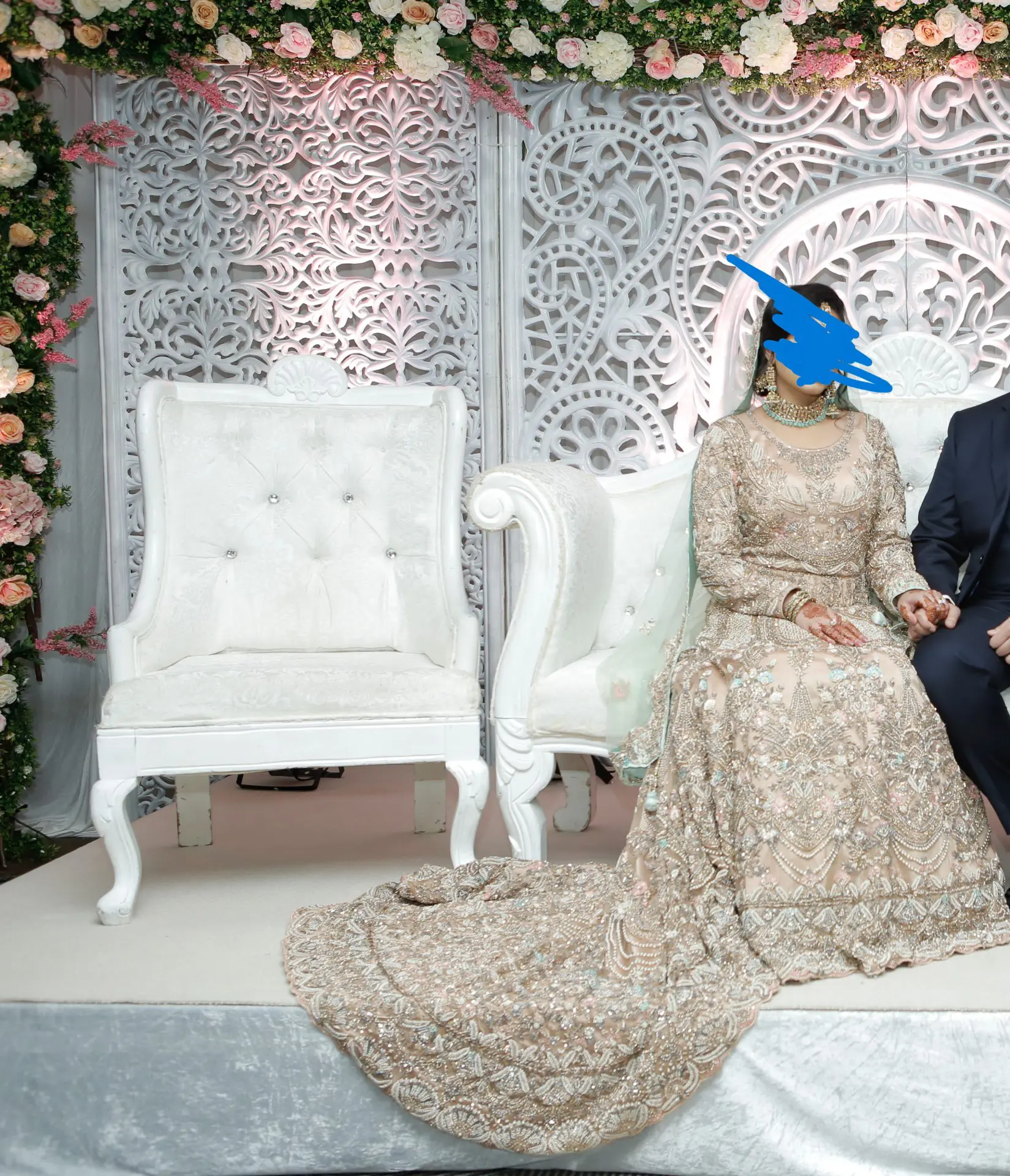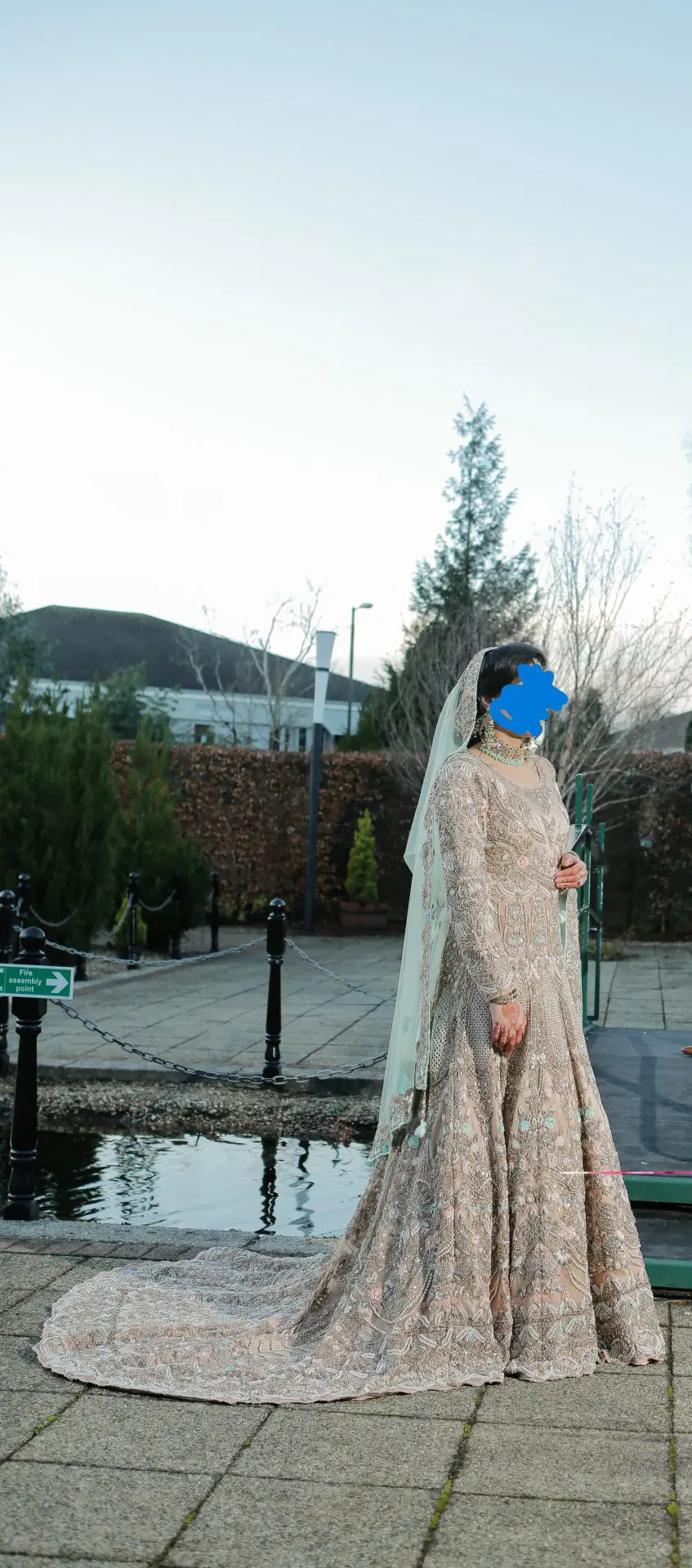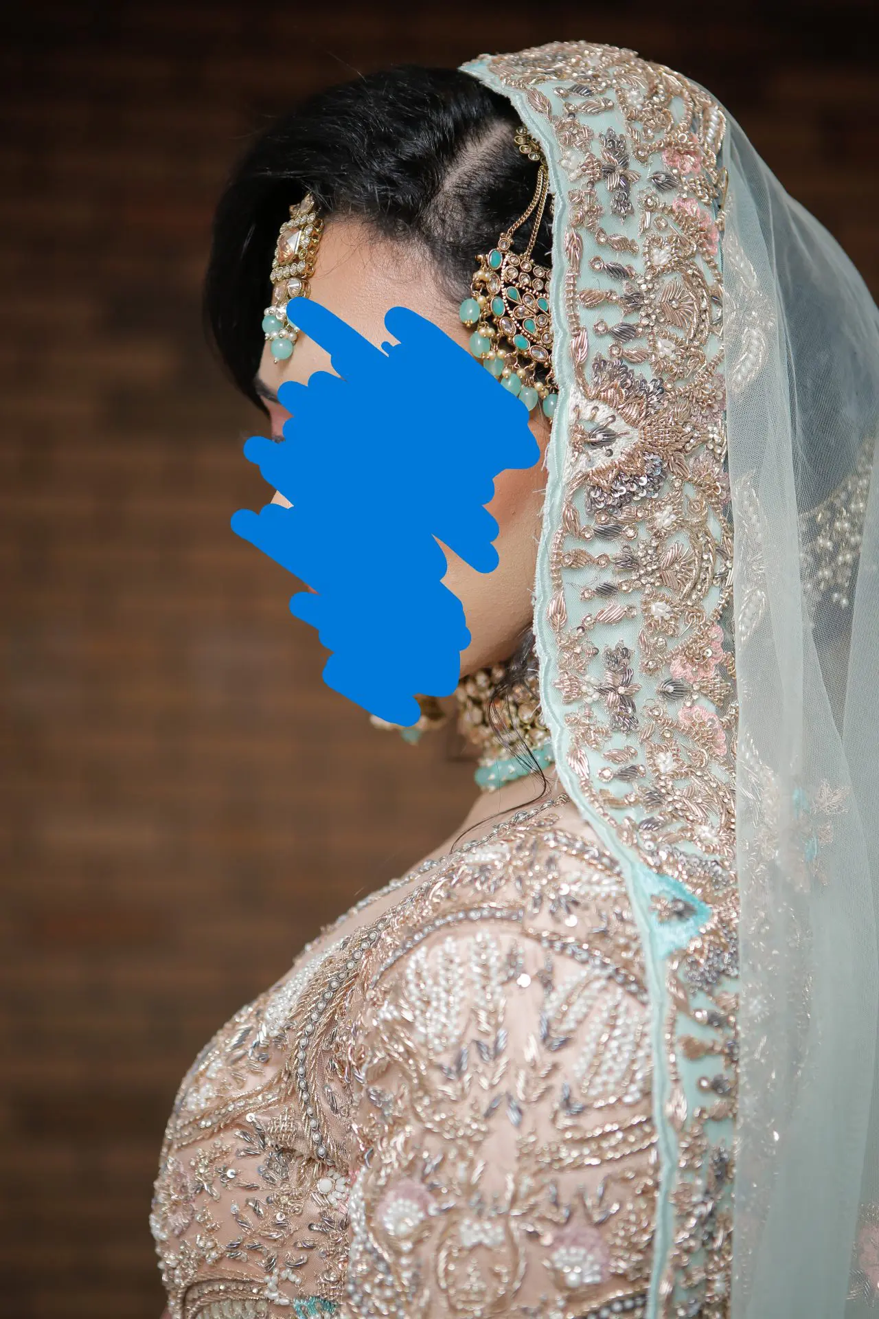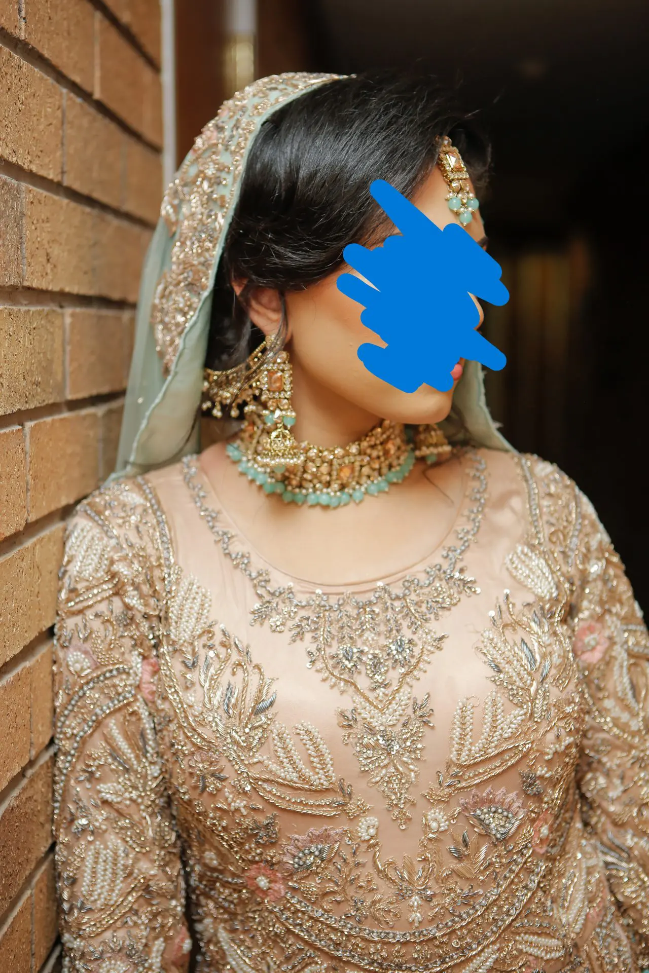 Beautiful Walima dress. worn once for a few hours. Colour is nude/beige with a teal dupatta and some of the embroidery on the dress is light pink. gorgeous pastel dress