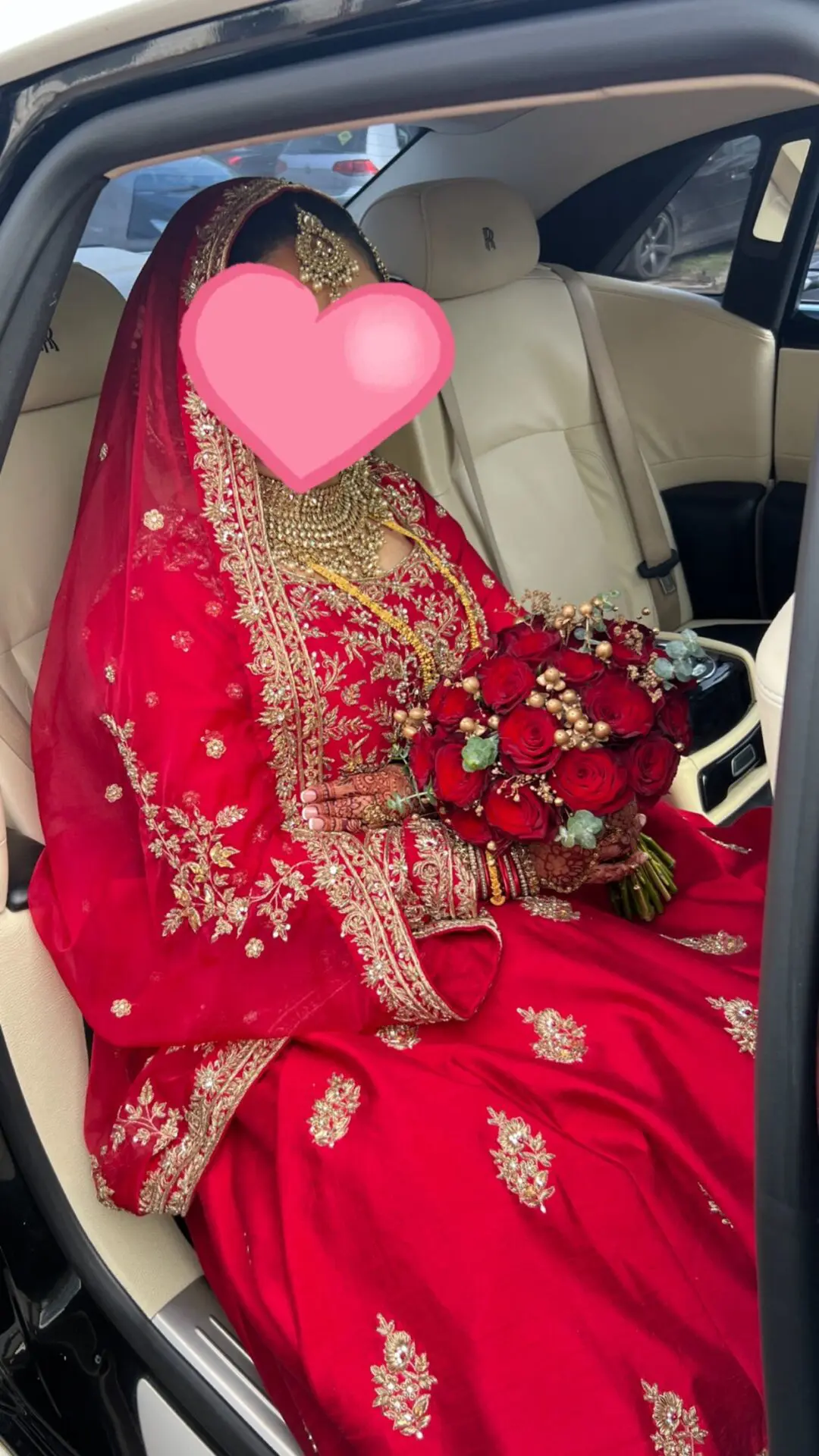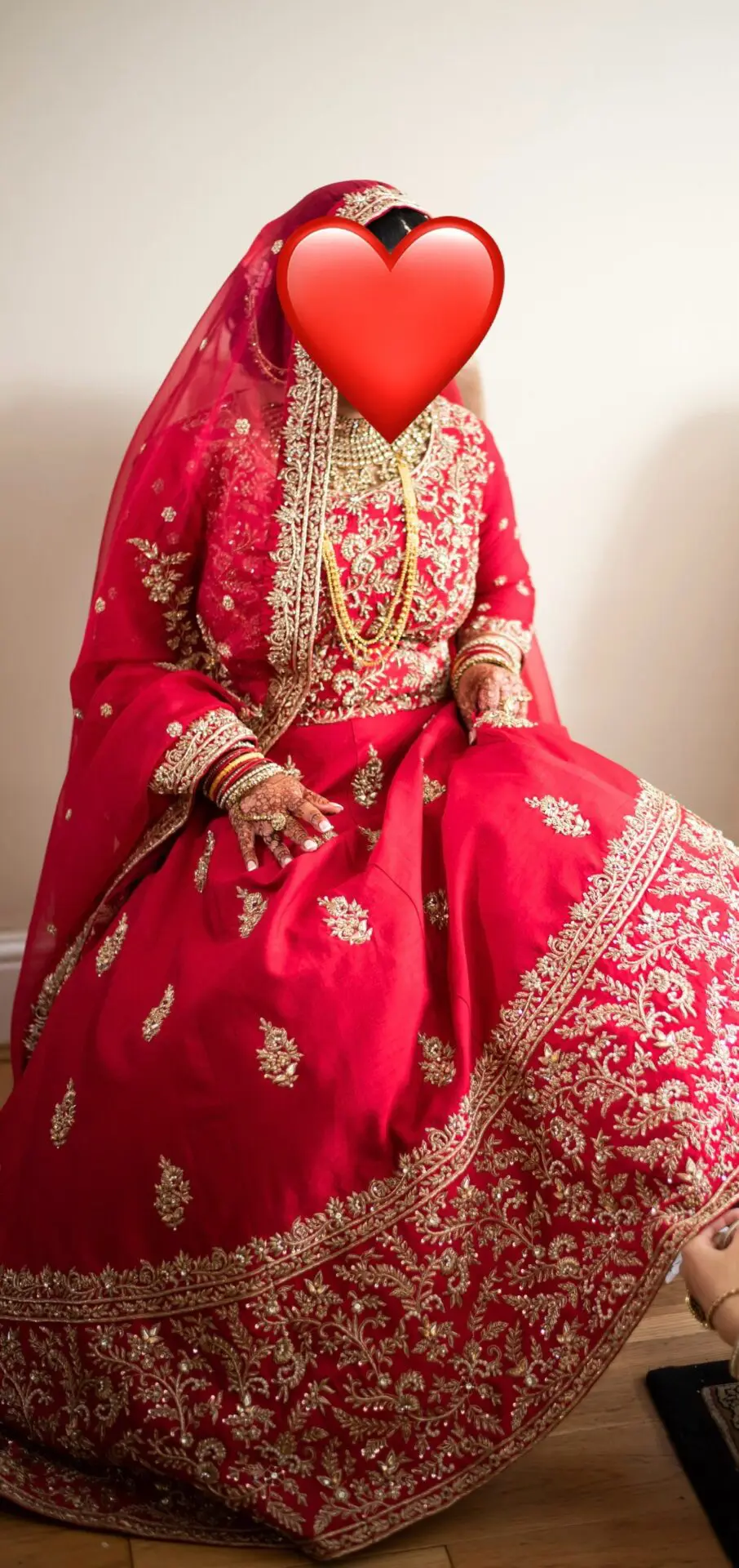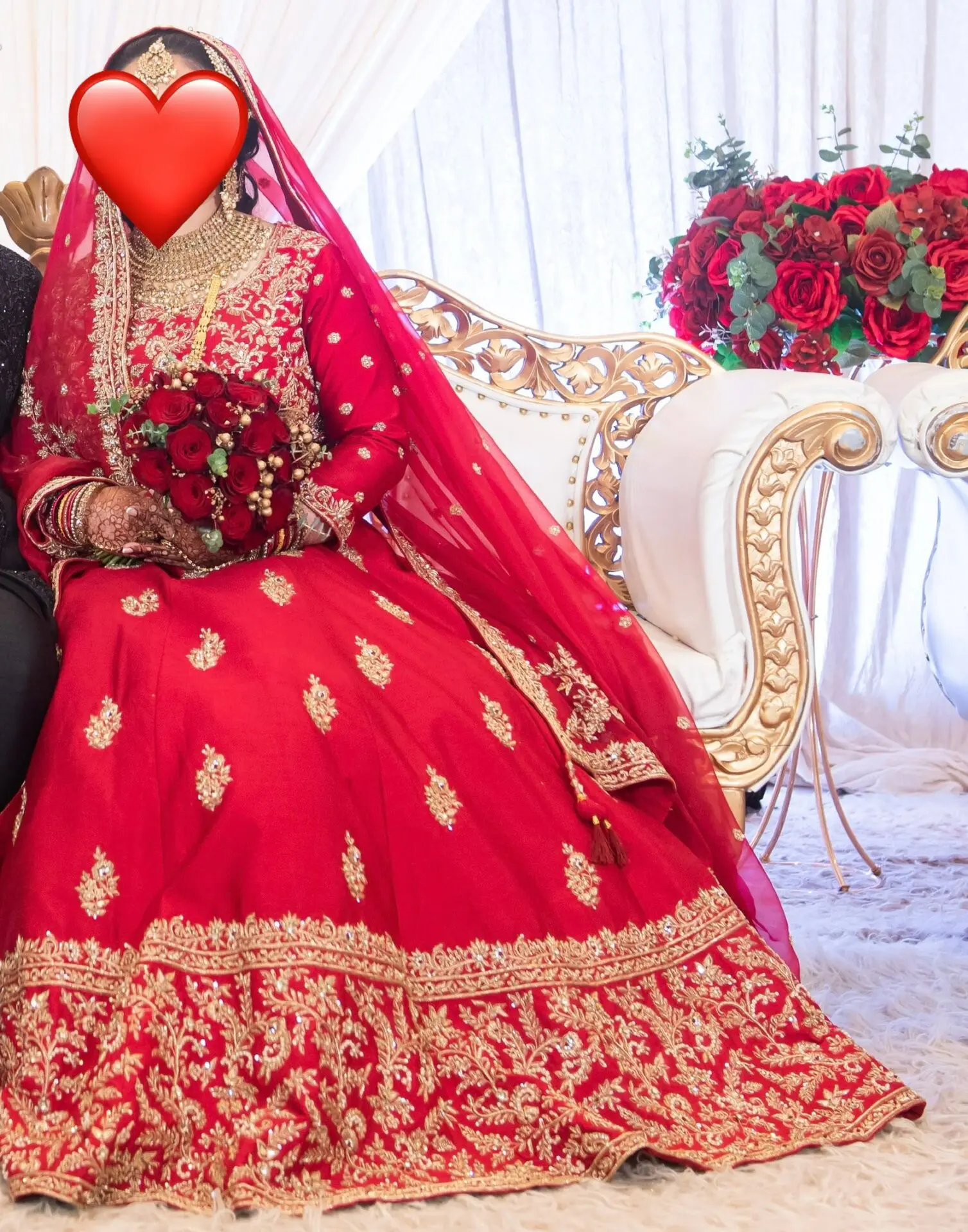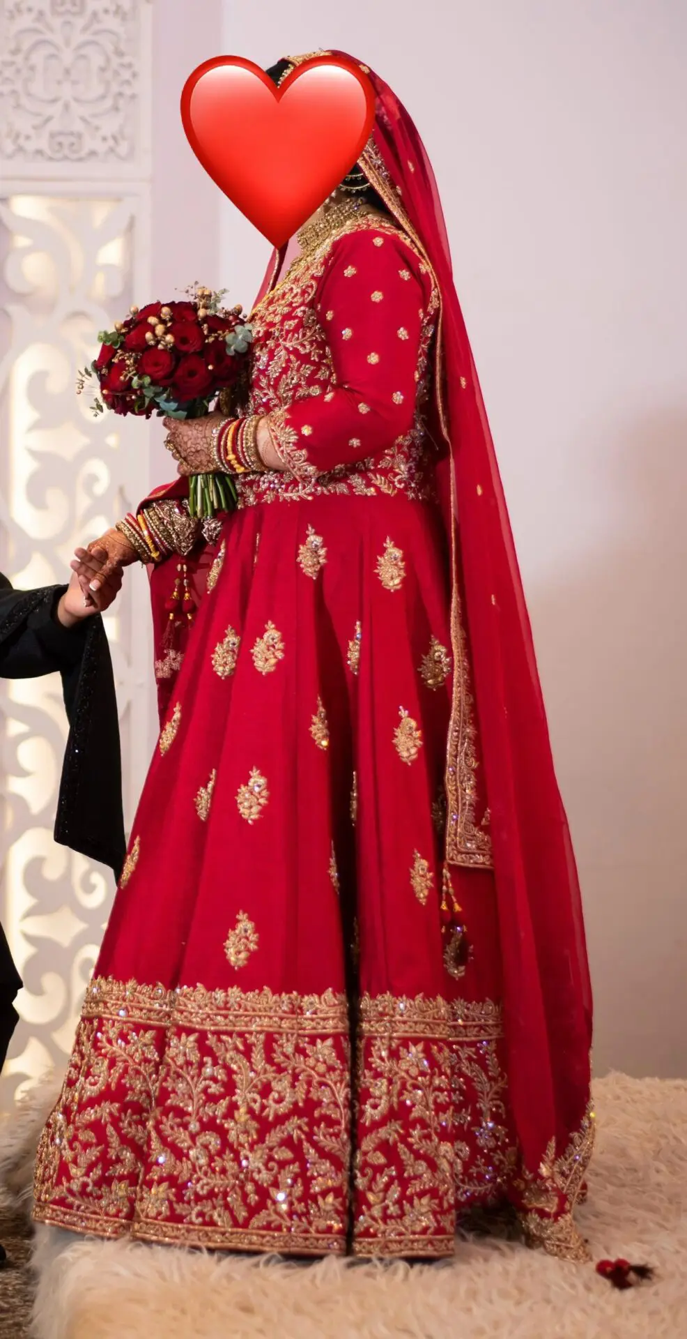 Bespoke Red Raw Silk Bridal Dress (from K’s Boutique) with intricate hand work, zardosi and pearls. Design is the same both front and back. Only worn once for a few hours. Dress comes with large size/long dupatta and matching potli bag, the dupatta is lightweight and not heavy at all. Dupatta has border work all the way round with additional work scattered as shown in pictures. Dress comes in a dust/suit bag. Dress has cancan for volume underneath. Outfit colour is 242-N from Manish embroidery yarn colour chart. Will fit size 10 - 12, additional measurements below: Length: 57” Chest: 42.5” Sleeve: three quarter sleeves - 17” Size of motifs scattered on dress: 3” Bottom of dress border size: 14.5” No refunds will be accepted. Please message for more info.