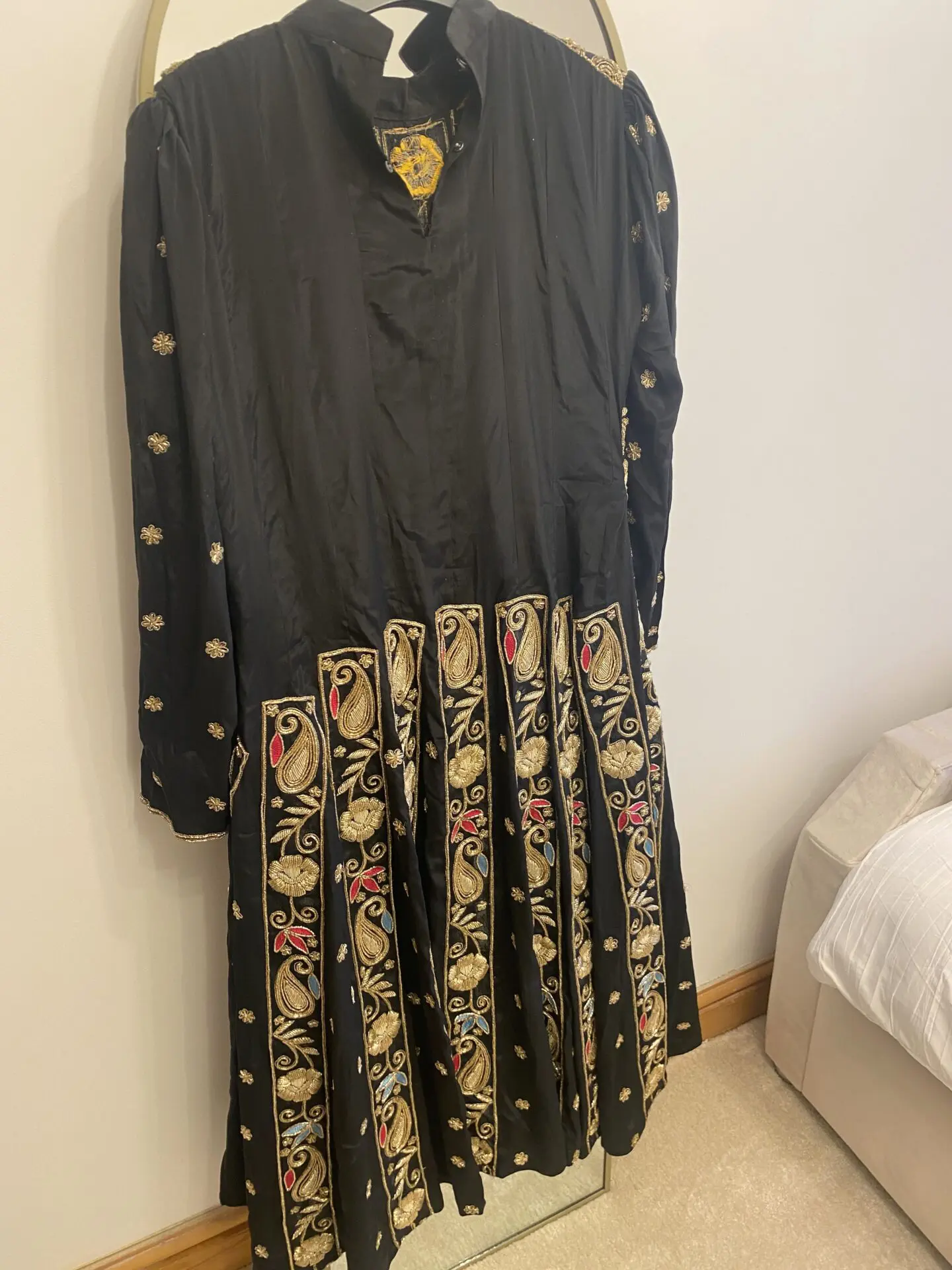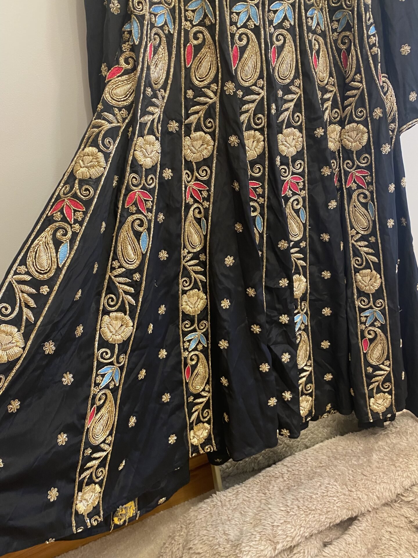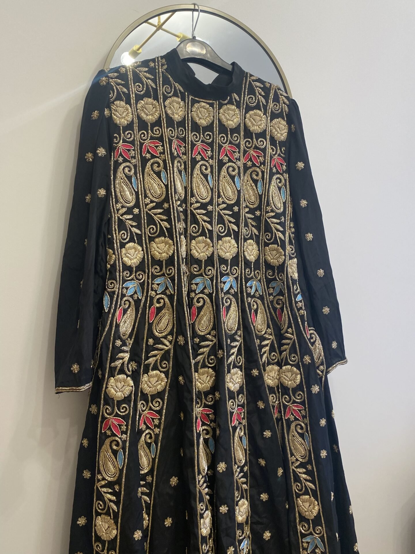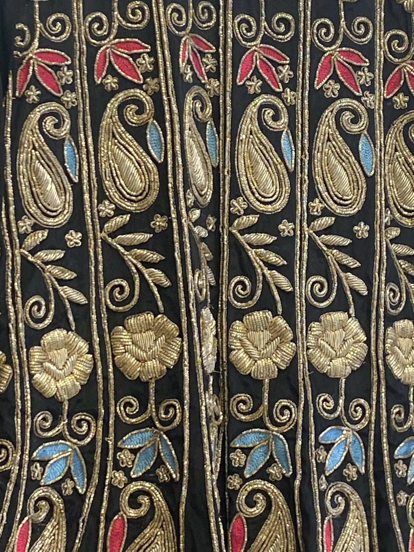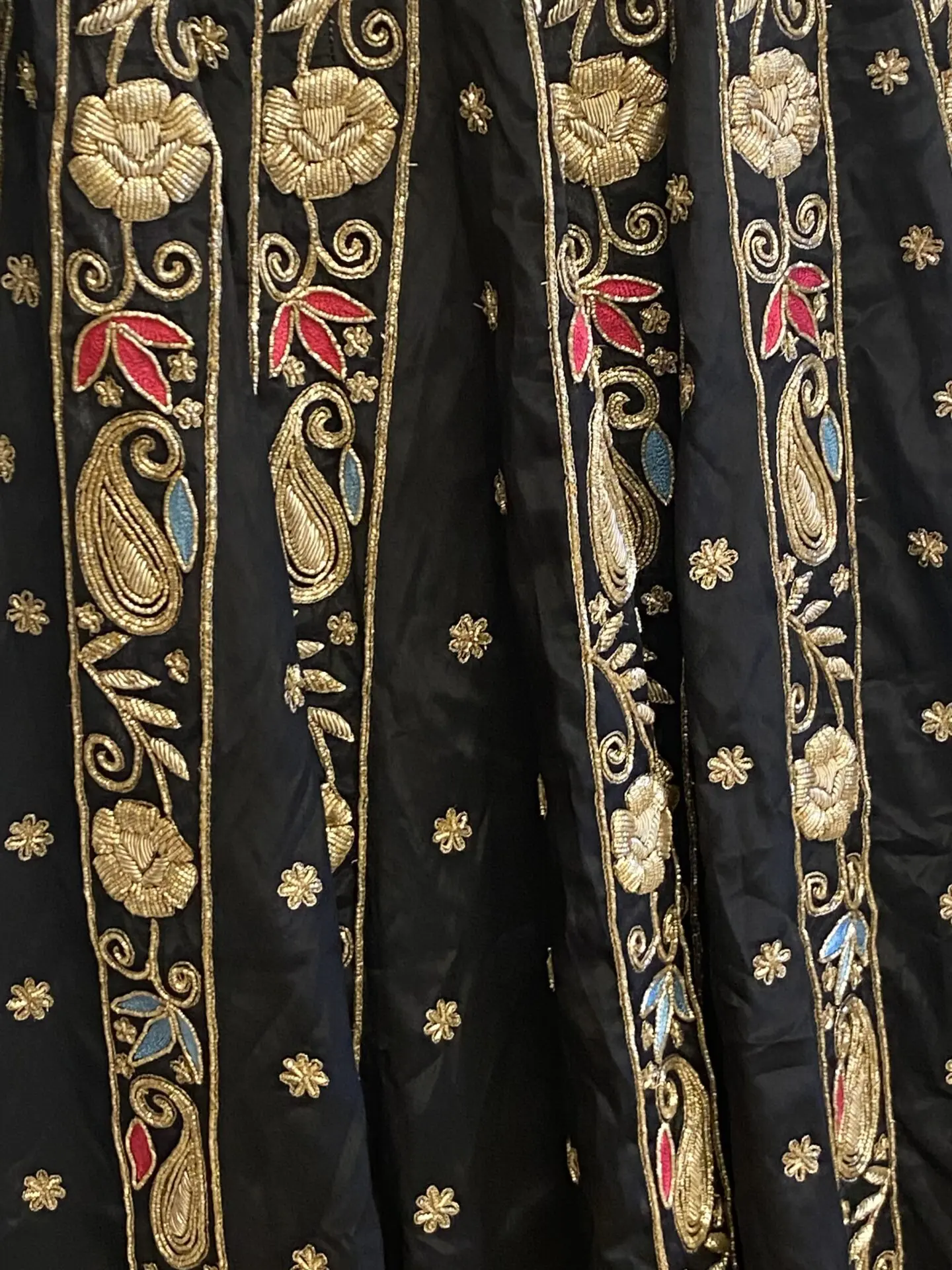 Black heavily embroided work with dabka and threadwork.