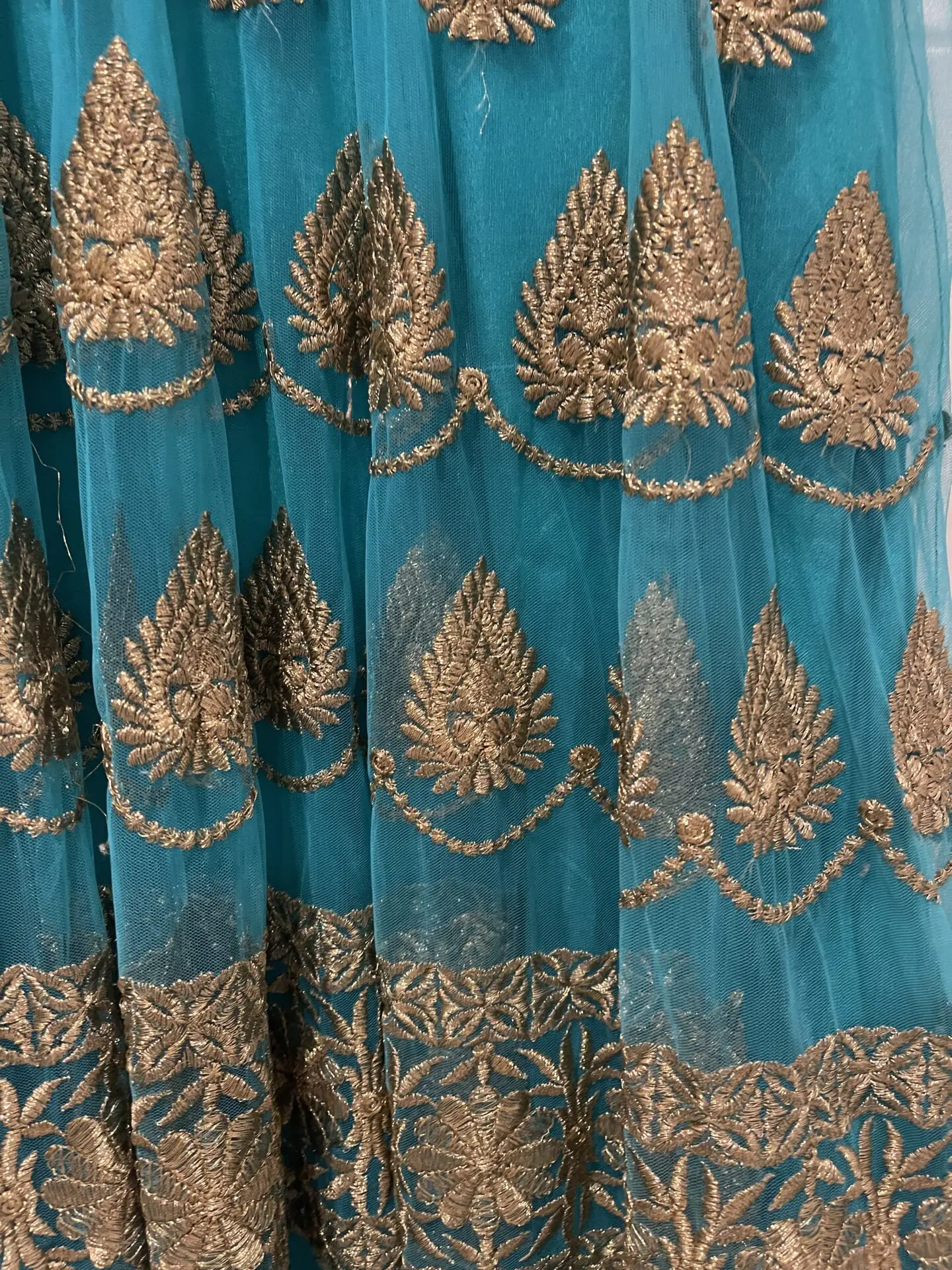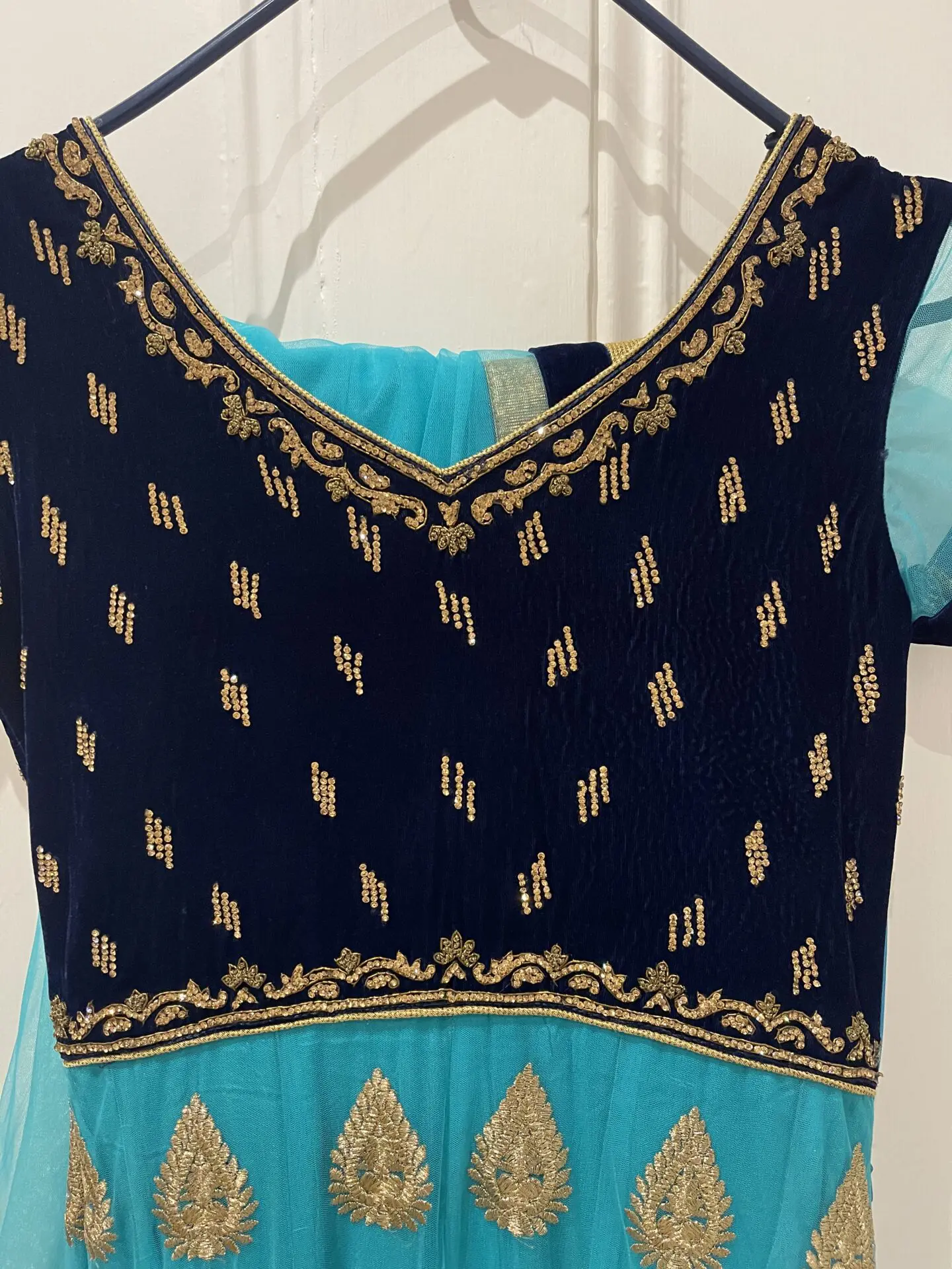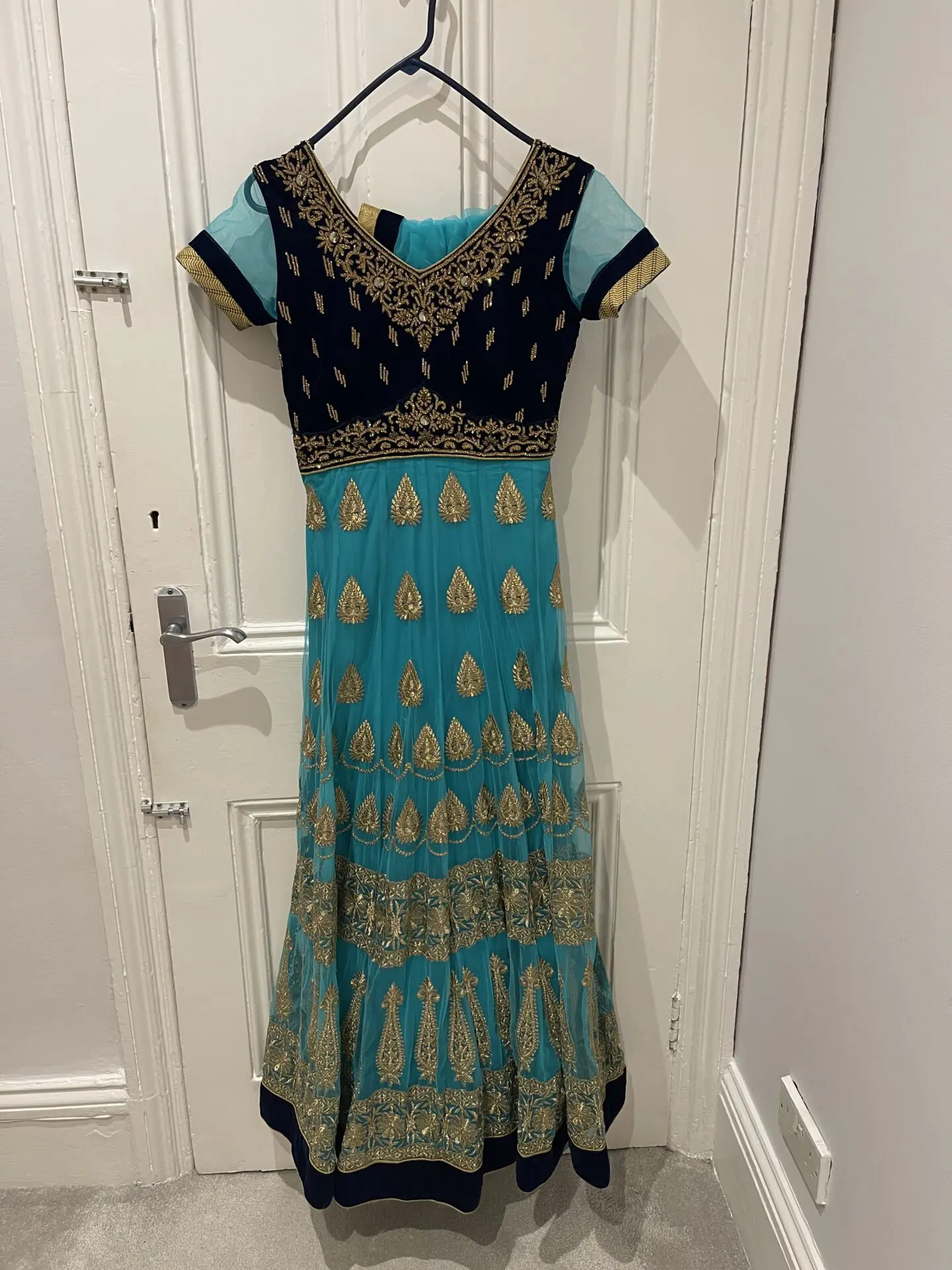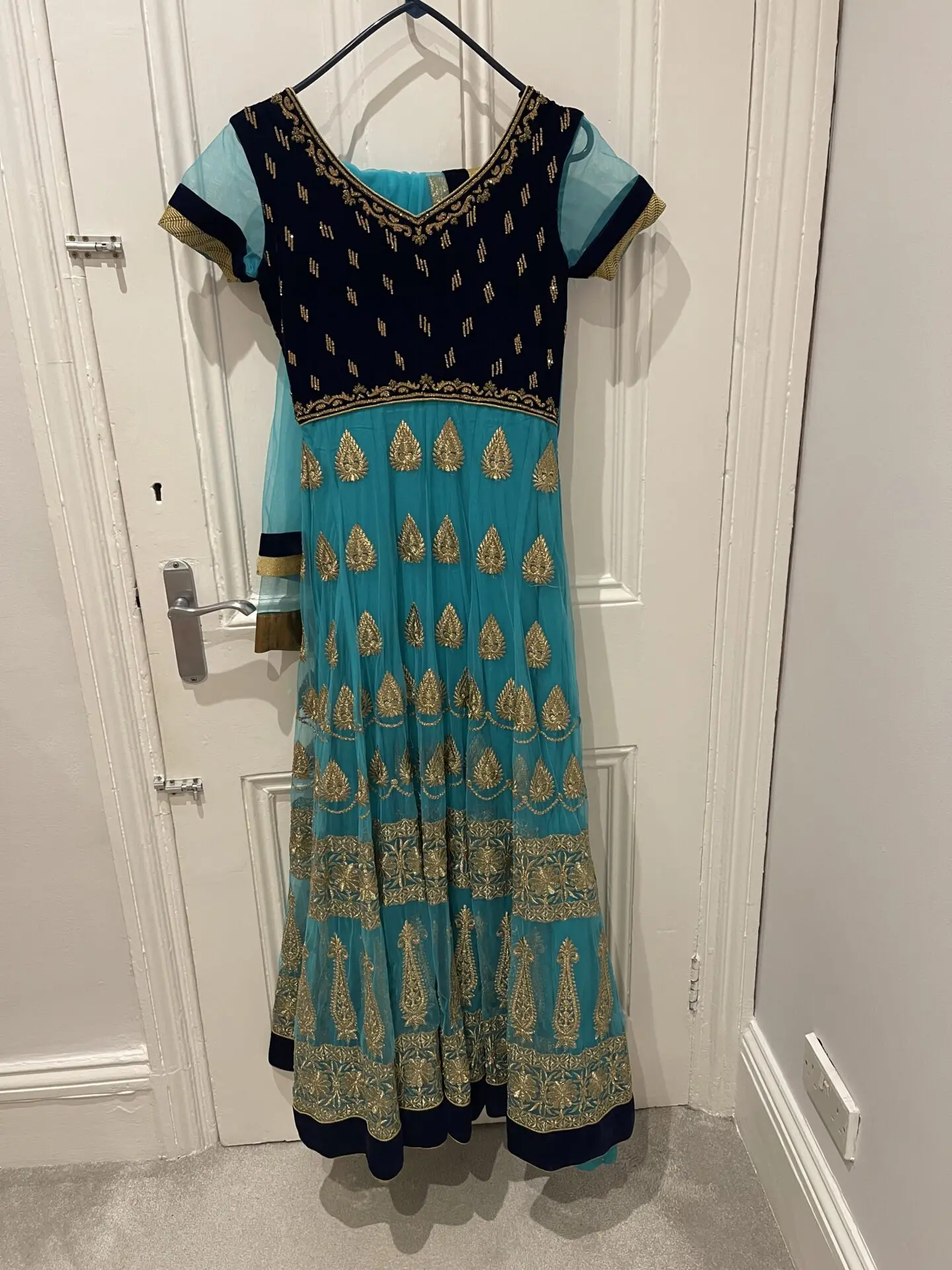 Beautiful blue embroidered with gold Indian dress, with matching churidar pants and dupatta. Size 6/ Small. Only worn once, great quality, from Dubai store. Contact for more details /pictures!