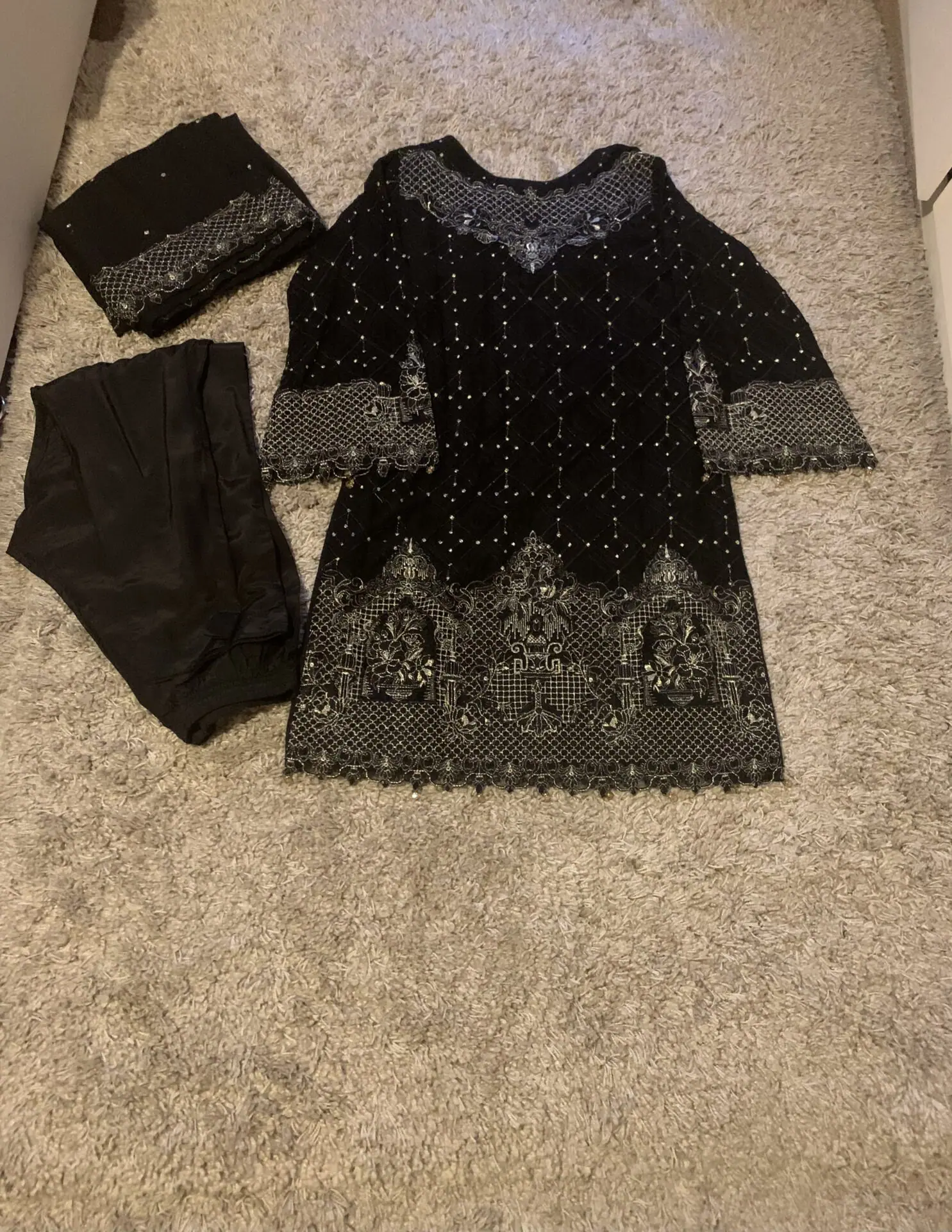 black with gold embroidery, neckline is lovely and falls across the shoulders in a modest way and does not show clavicles or shoulders