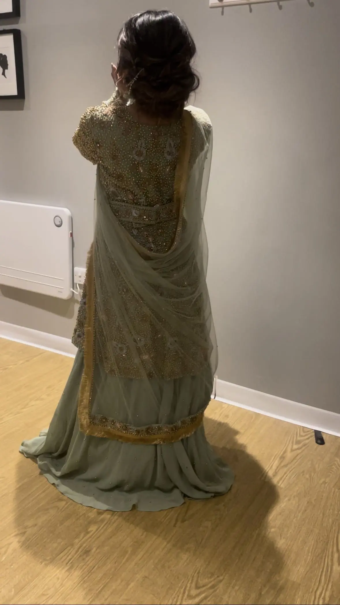 Intricate and heavy embroidery sage green lehenga. Worn once with no damage and been sent to the laundry straight after! Can be worn as bridal but I wore it as bridesmaid lehenga. Selling one lehenga fitting Small/Medium and second lehenga size xxl/xxxl. You can tailor if needed there’s enough material to adjust. Was originally bought for the price of £370 but I am selling for £250, £120 off original pricing. Can negotiate prices as well 🙂