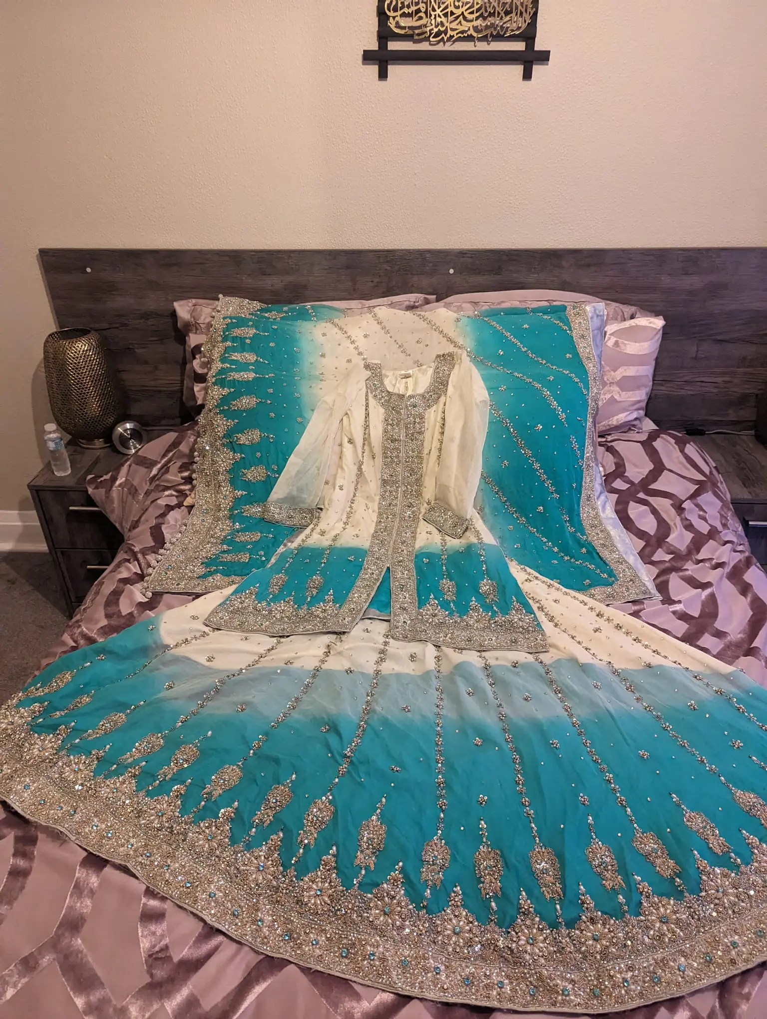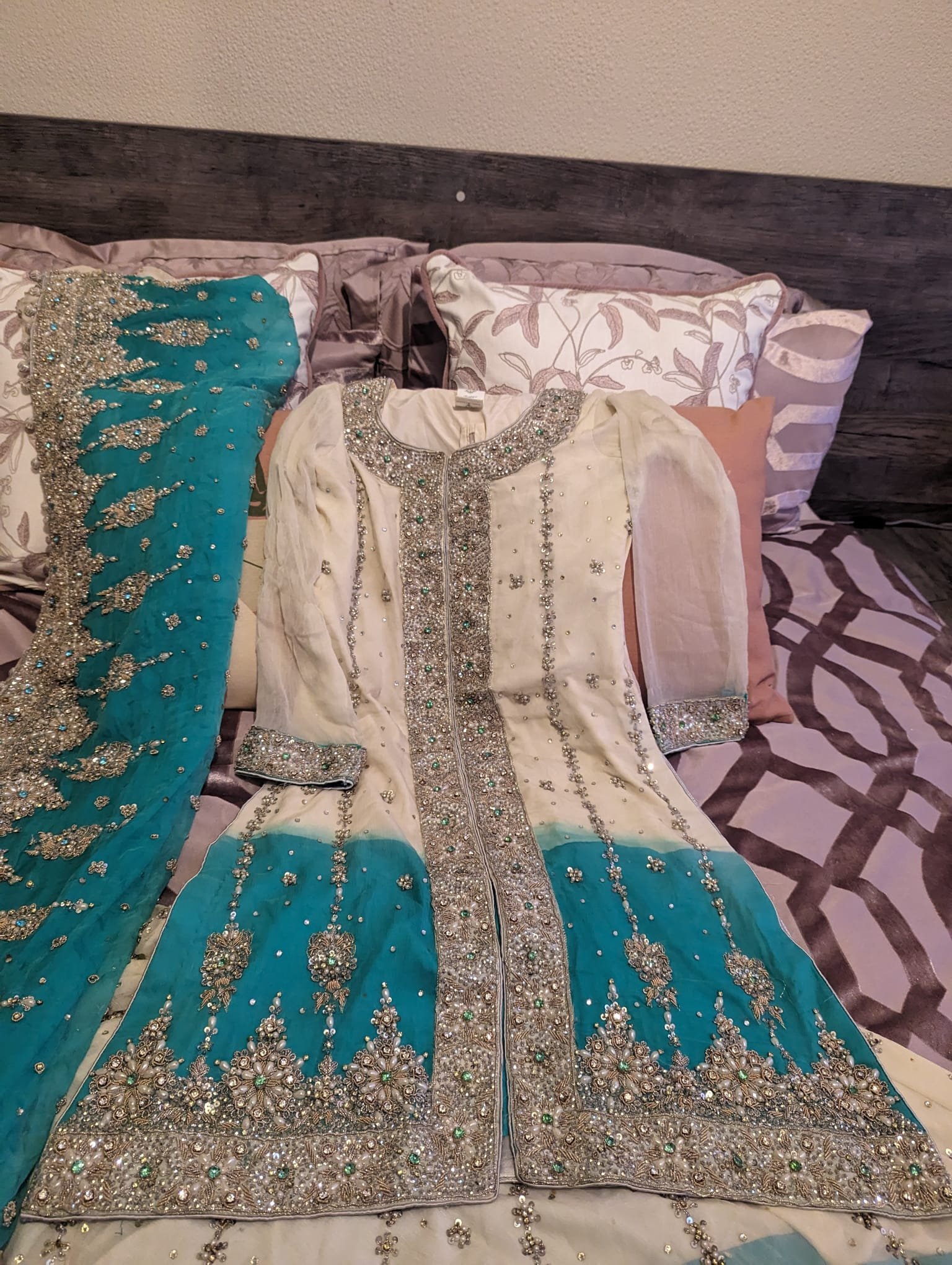 Very heavy embroidered, traditional wedding lehnga with a knee length shirt. Worn once for my Valima. Top can be worn with trousers (NOT INCLUDED) so the dress is very versatile. The dupatta is laced with gorgeous silver balls to adorn the forehead.