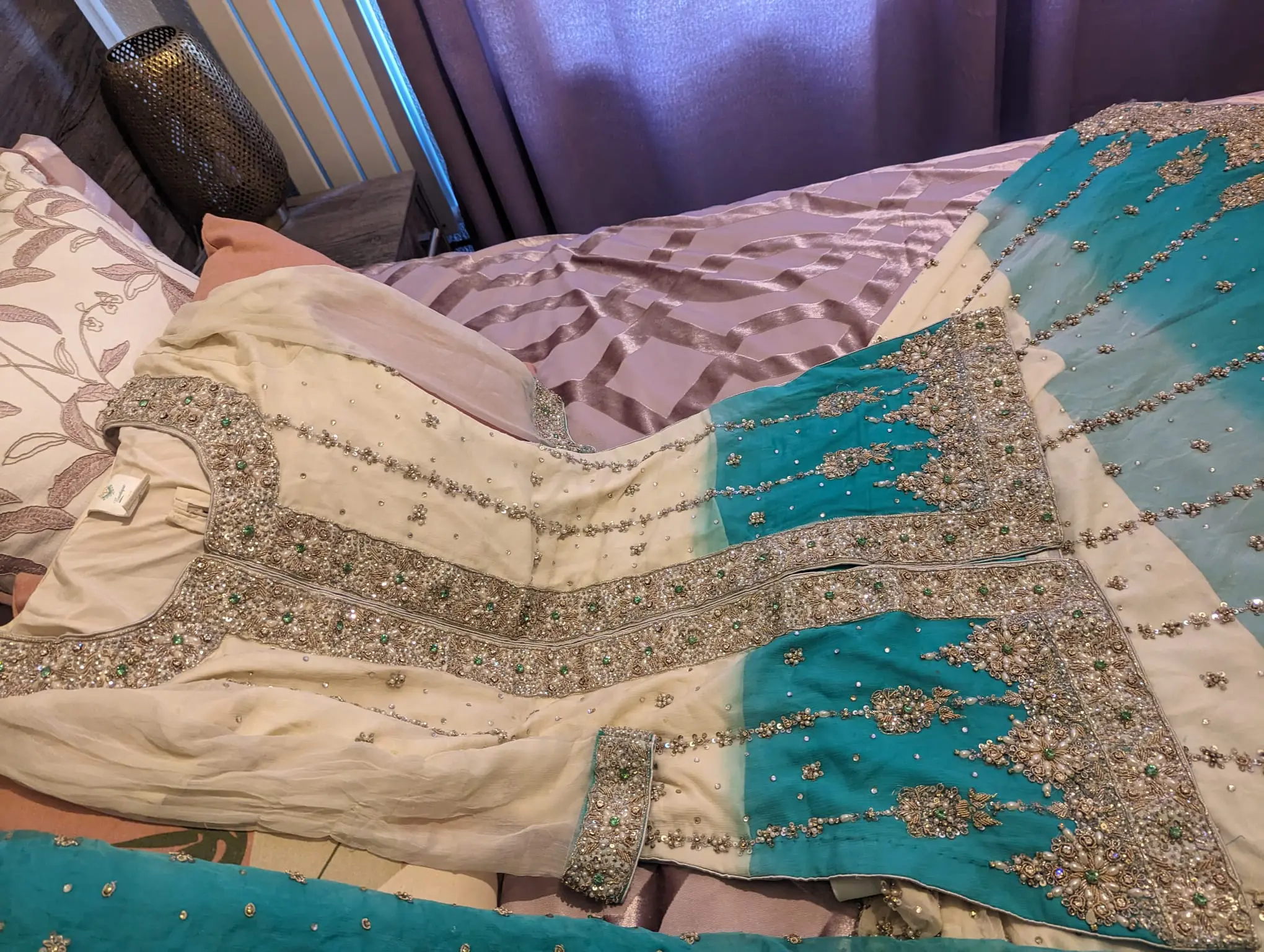 There are very few diamanté missing from the Lehnga which are not noticeable from a distance. This is a pre-loved item which is hand embroidered, therefore it's not as perfect as new but it's in an excellent condition.
