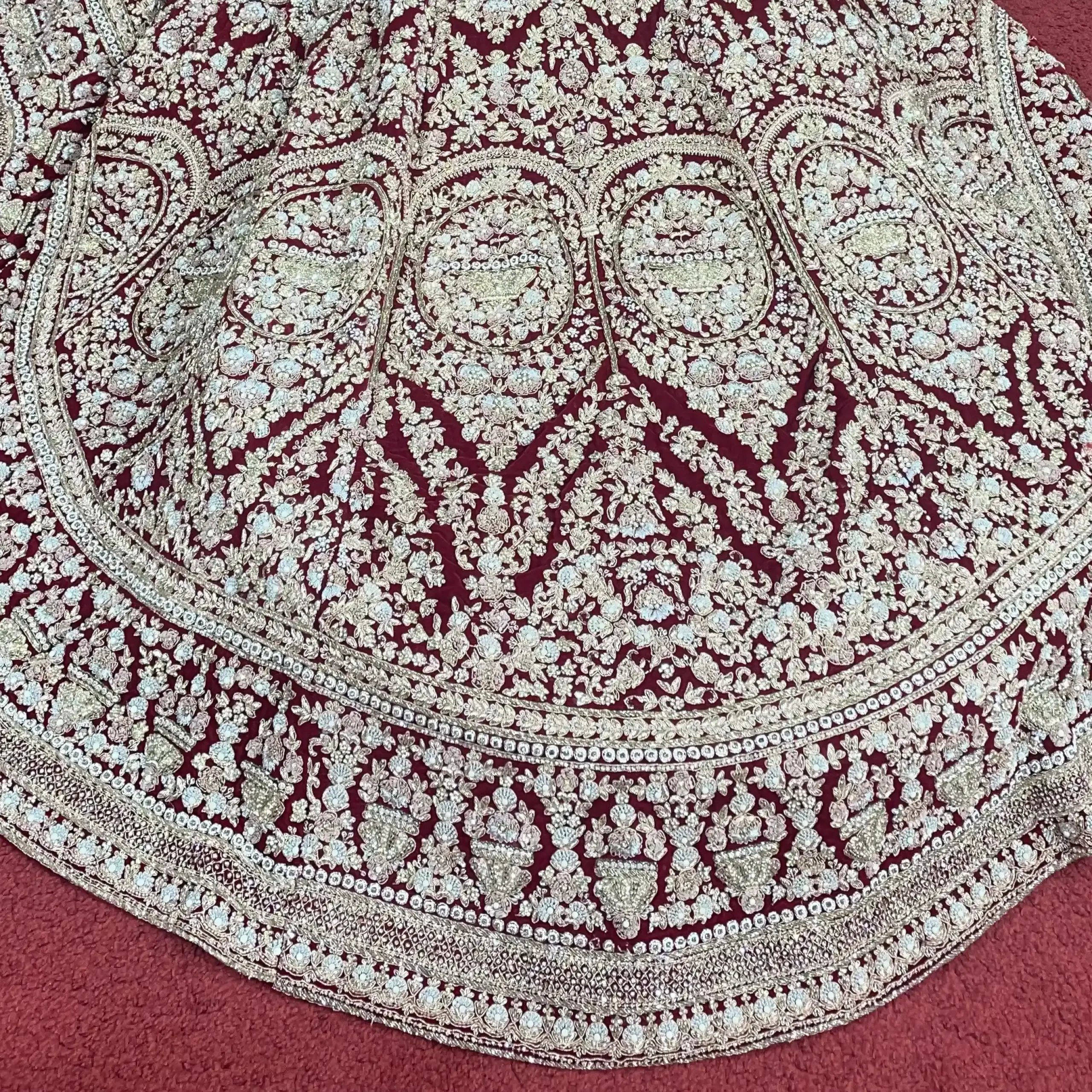 A heavily embroidered velvet bridal dress with trail