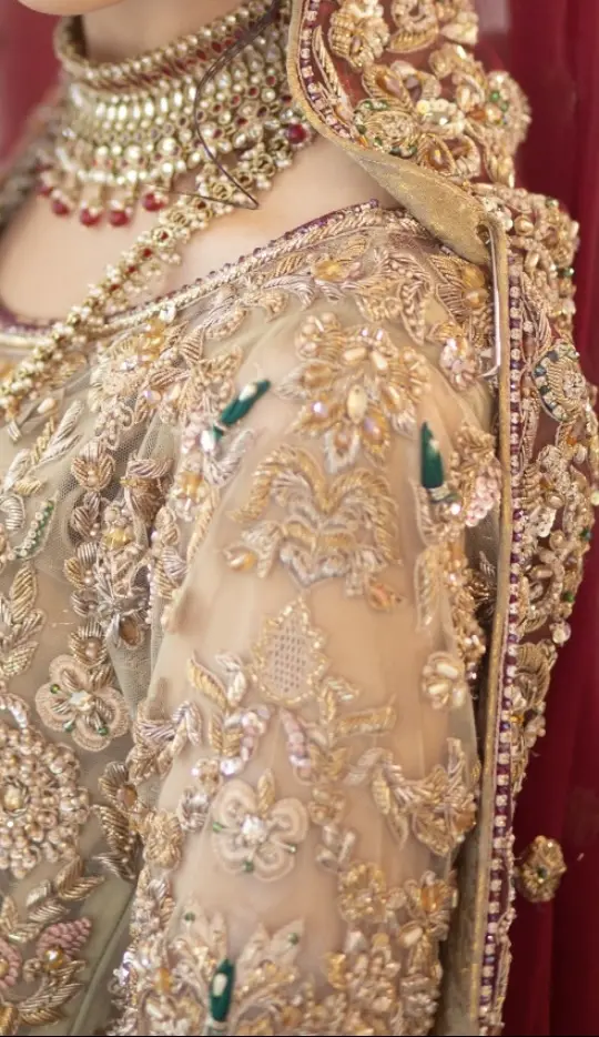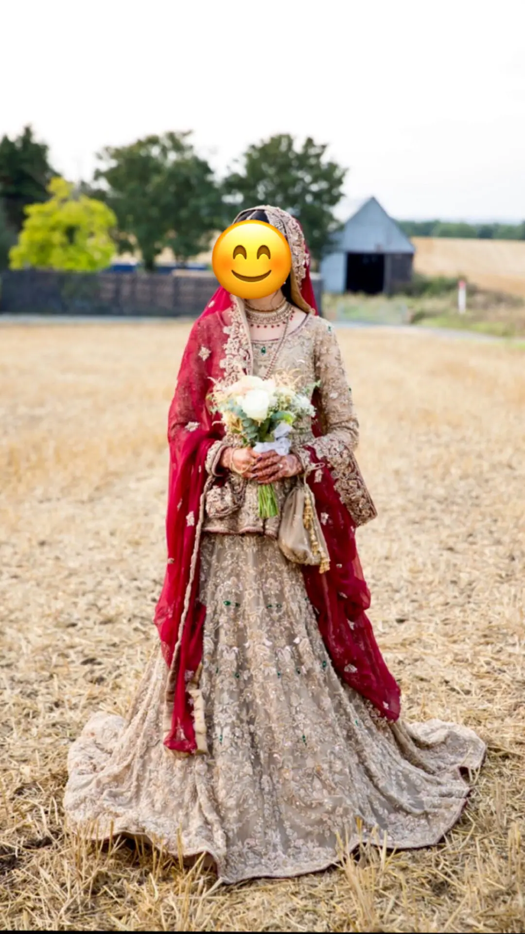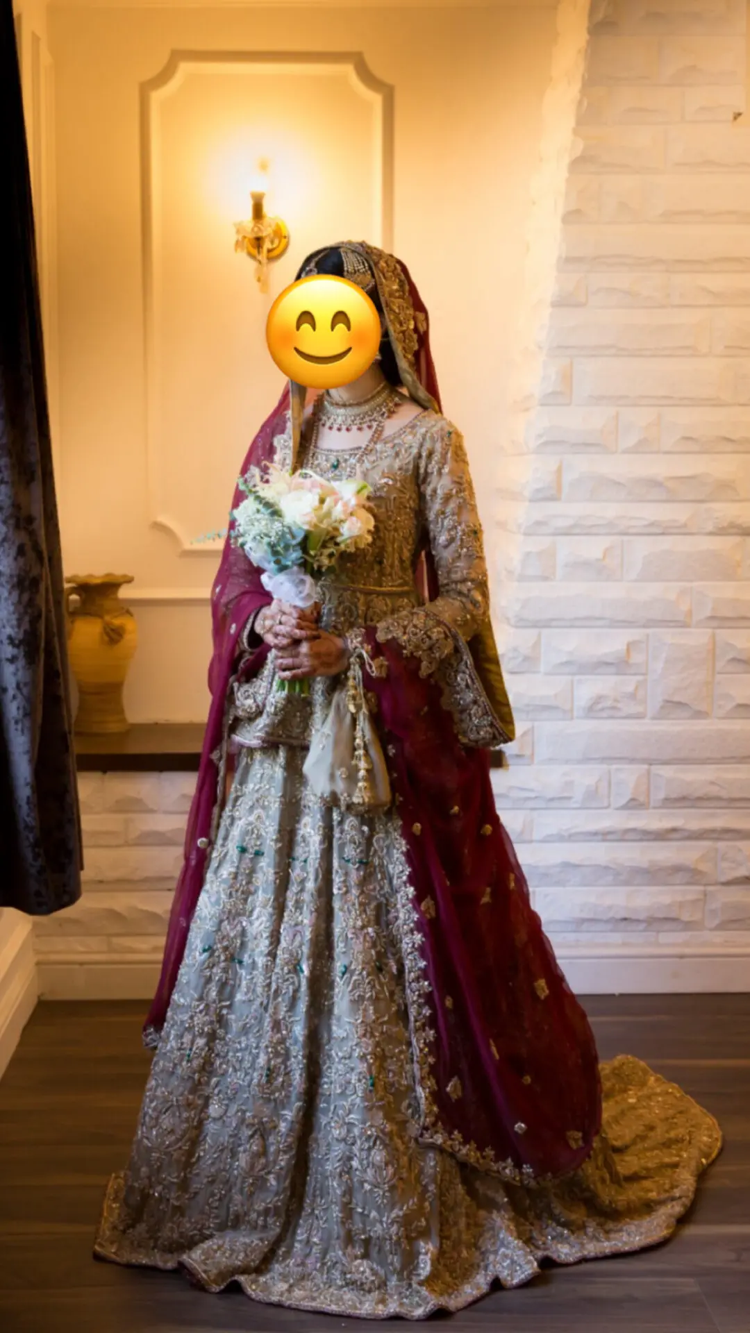 - only worn once (obviously!) for a few hours, it is in perfect condition as good as new.Gold Peplum Blouse with a gold lengha and maroon dupatta. Dupatta is a lovely chiffon material.