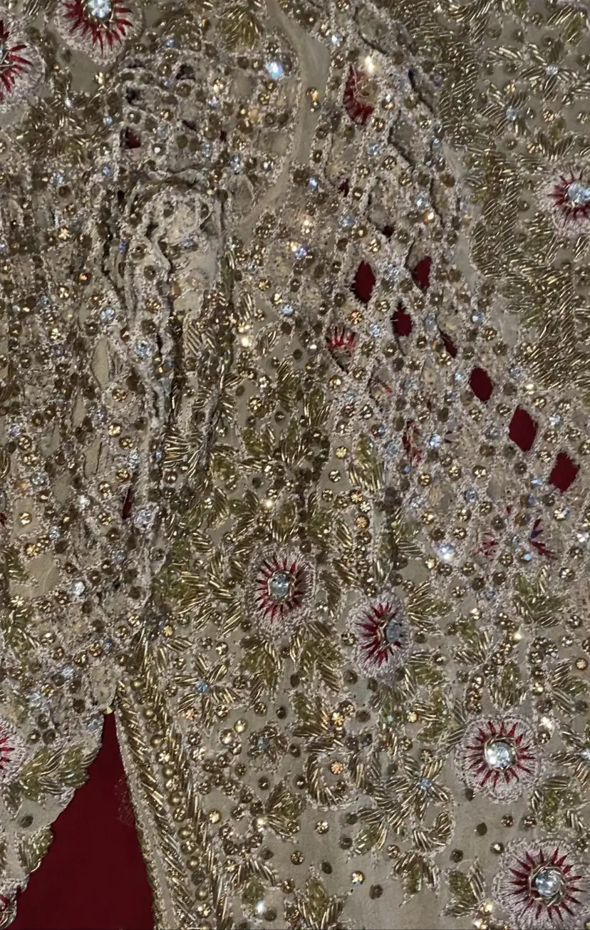 Kameez is peachy/gold/very light lilic with 3/4 sleeves, full back and front design/embellishments/sparkle