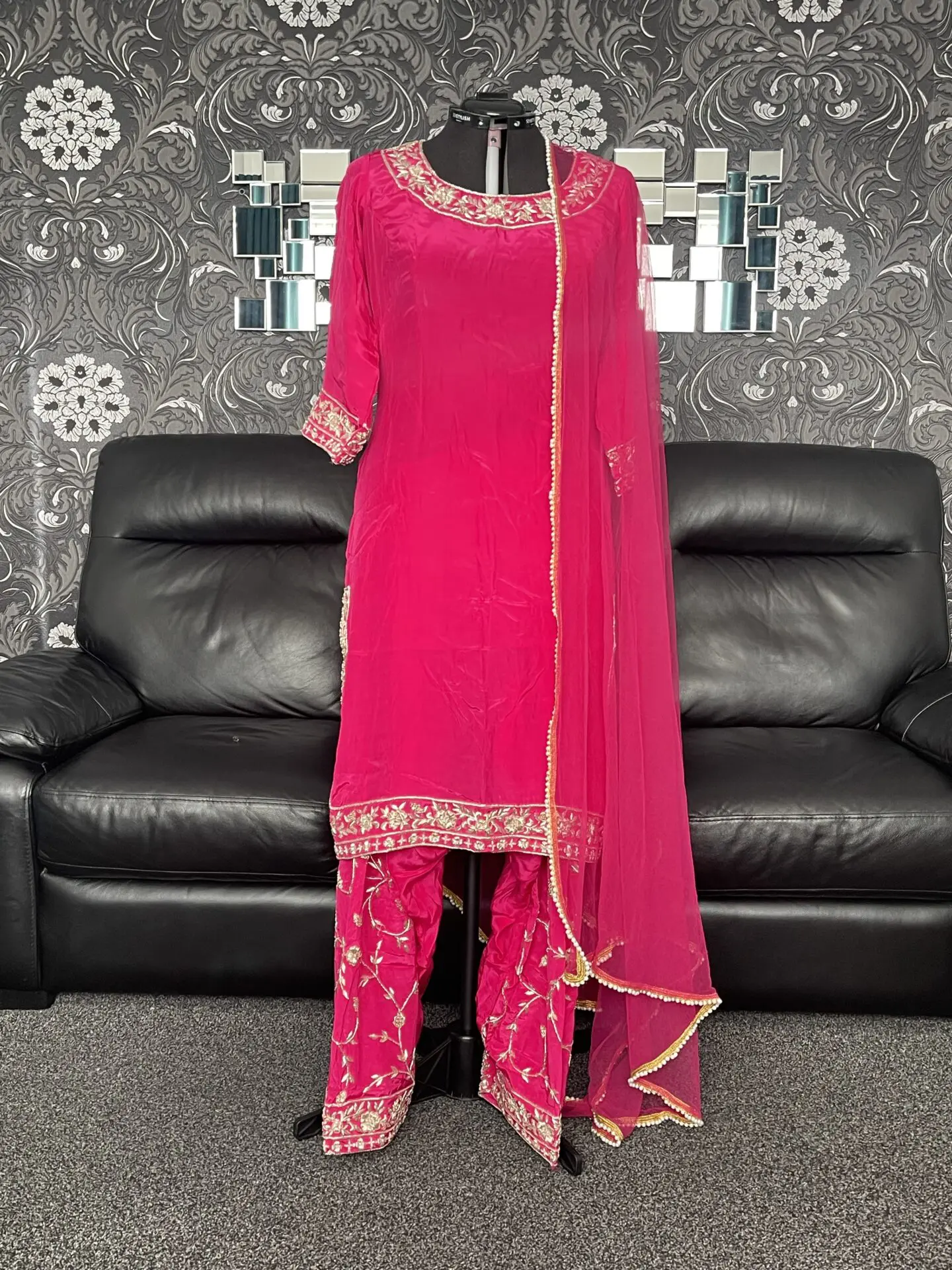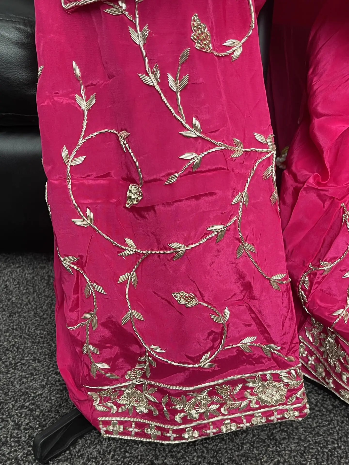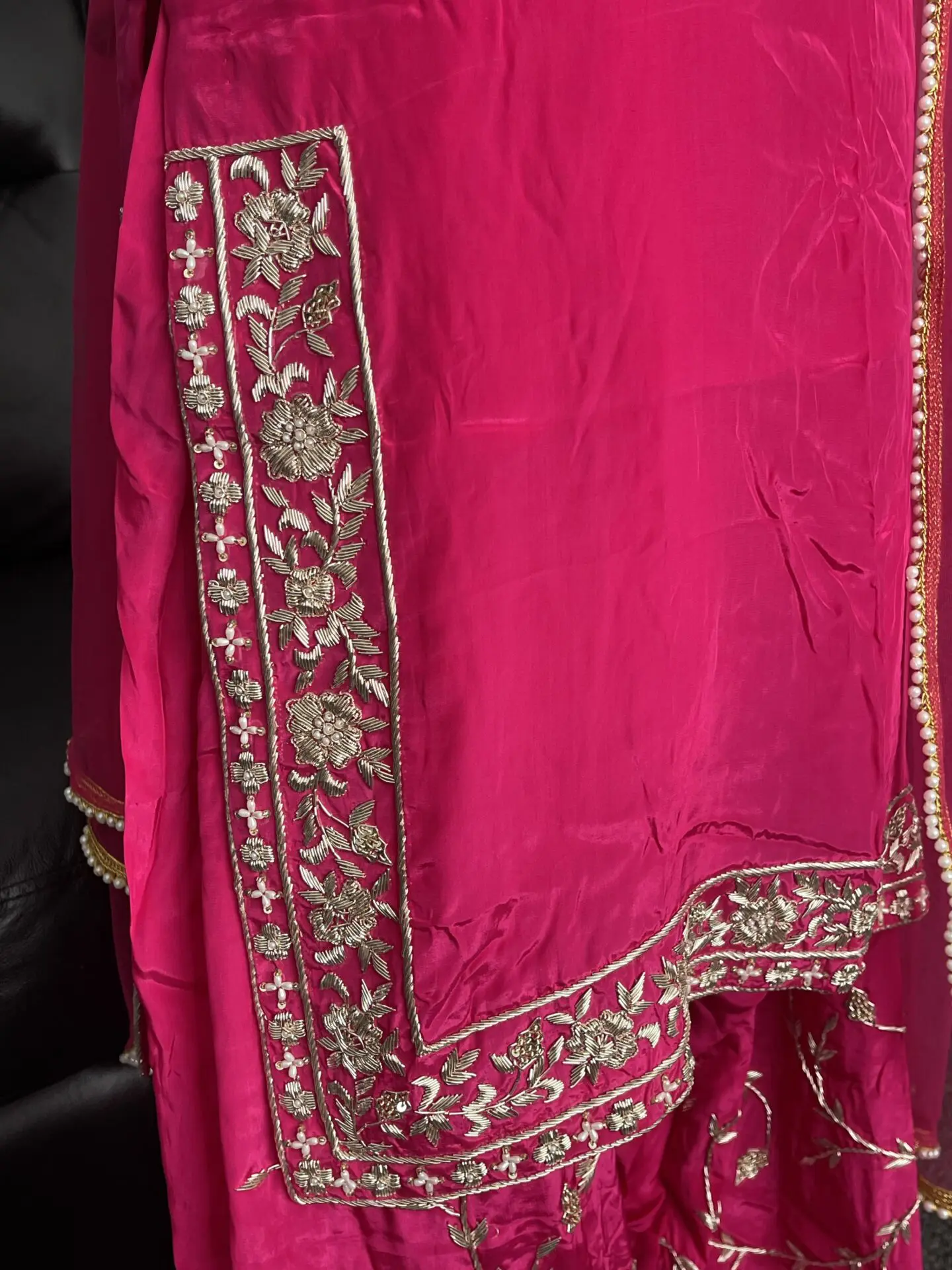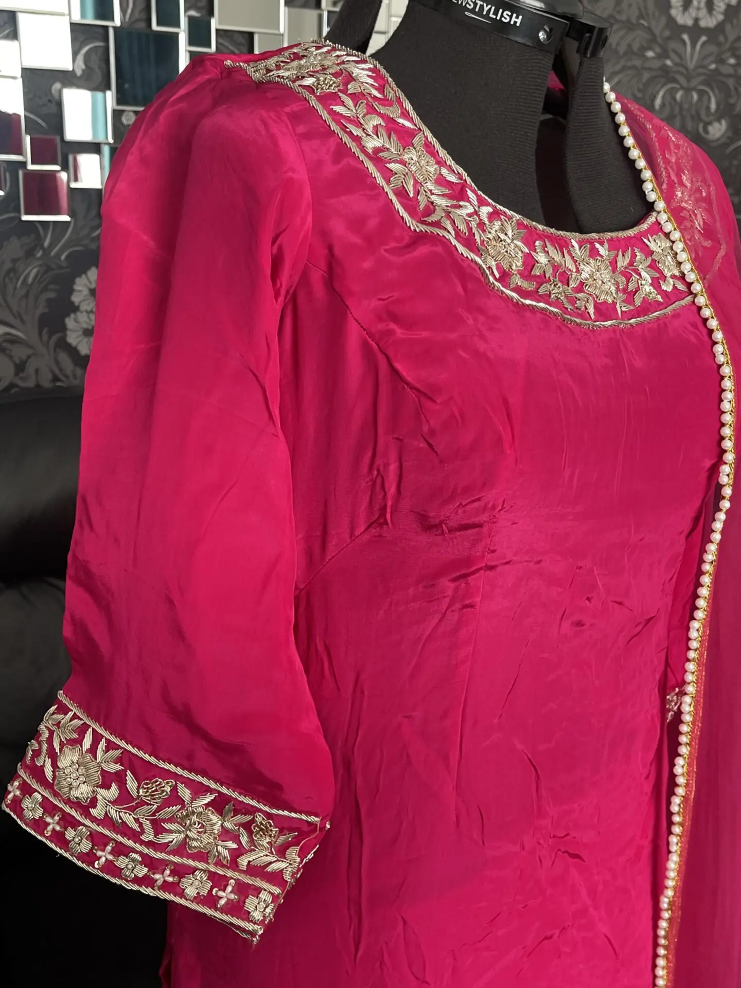 Cerise pink pure silk salwar suit with net chunni and all handmade embroidery.