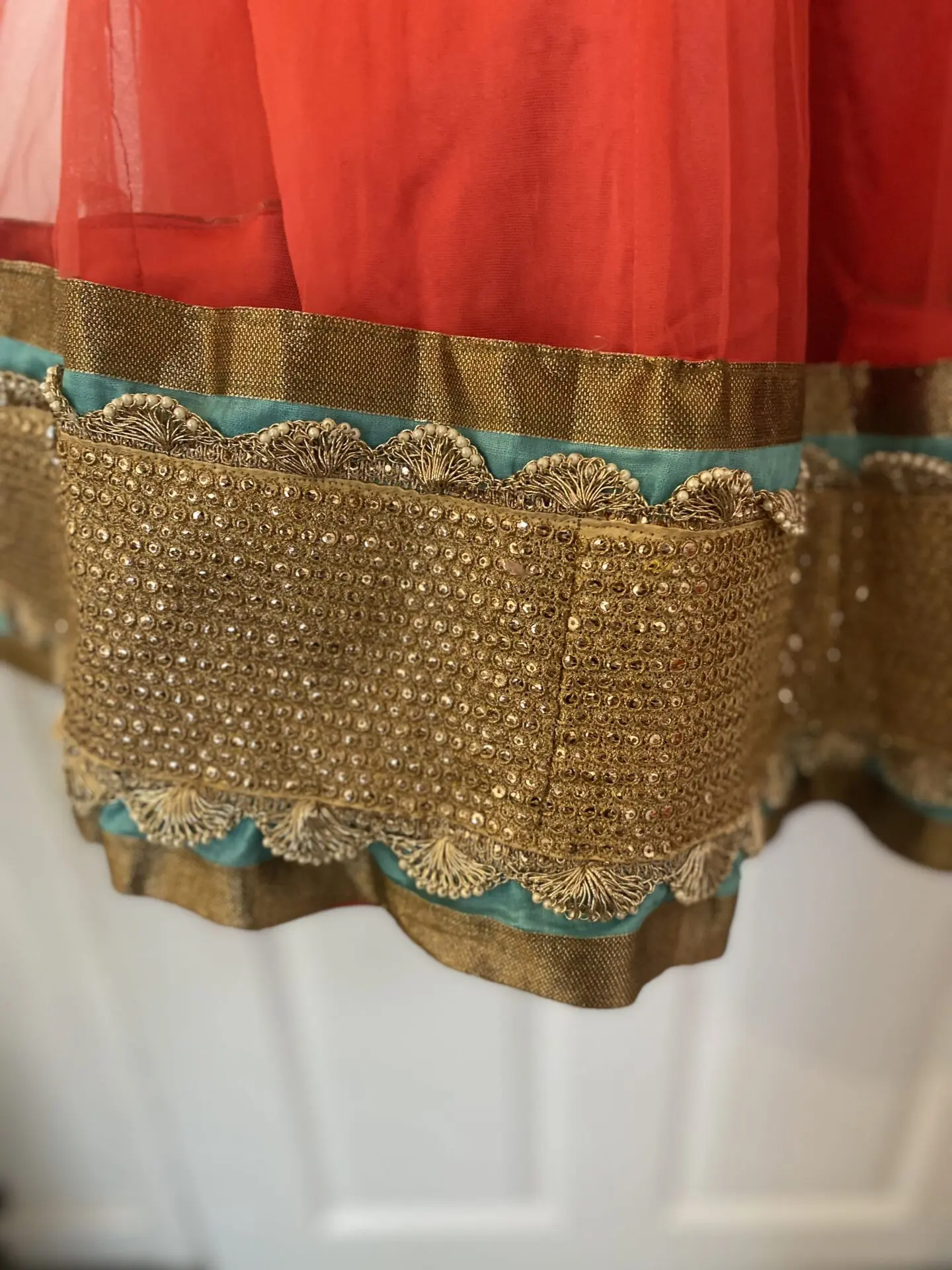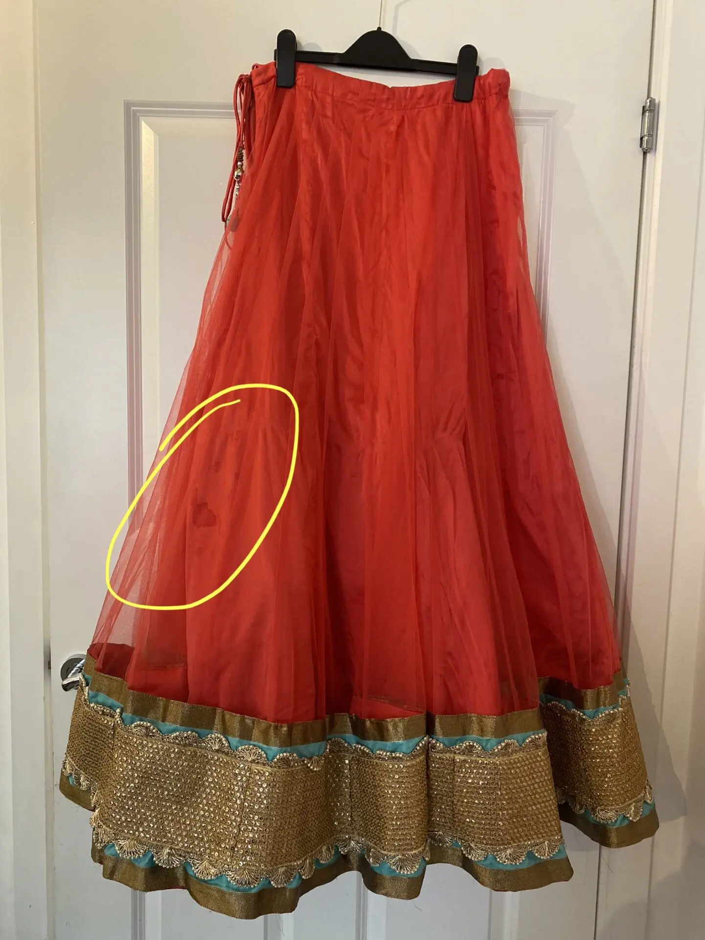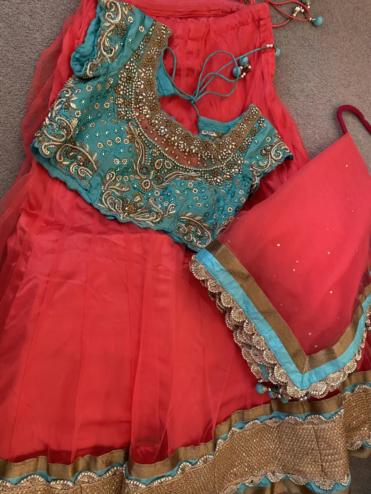 Coral and Teal Custom Made Lengha Made to fit me specifically- U.K. size 8/10 Hook fastening both sides for blouse Needs dry cleaning due to stain which is highlighted on photos - hopefully will come out. Worn twice. Gem missing - highlighted A couple other areas may need securing hence the reduced price Otherwise in great condition
