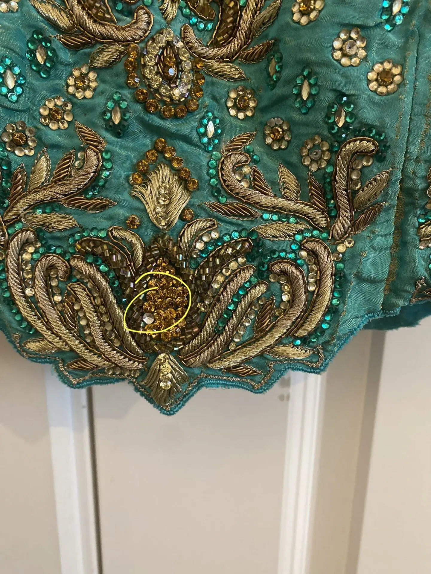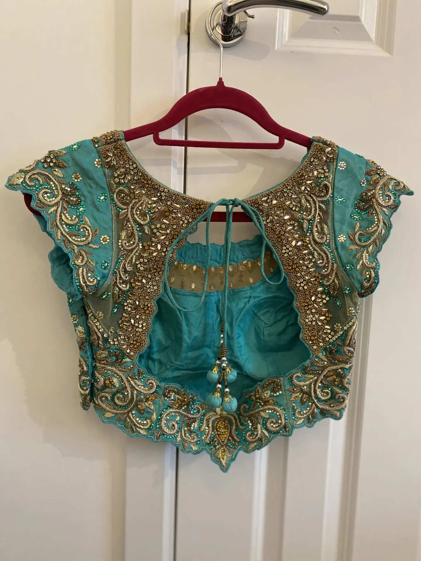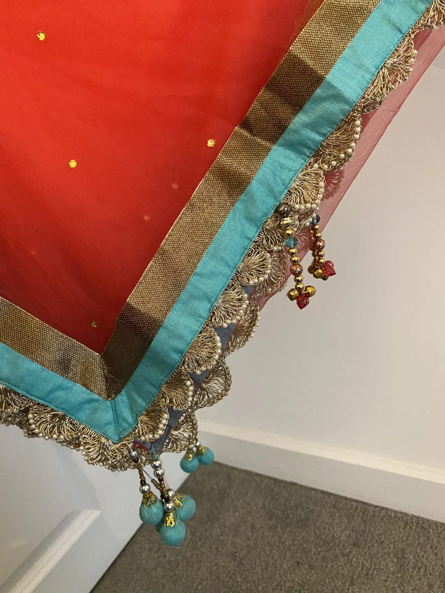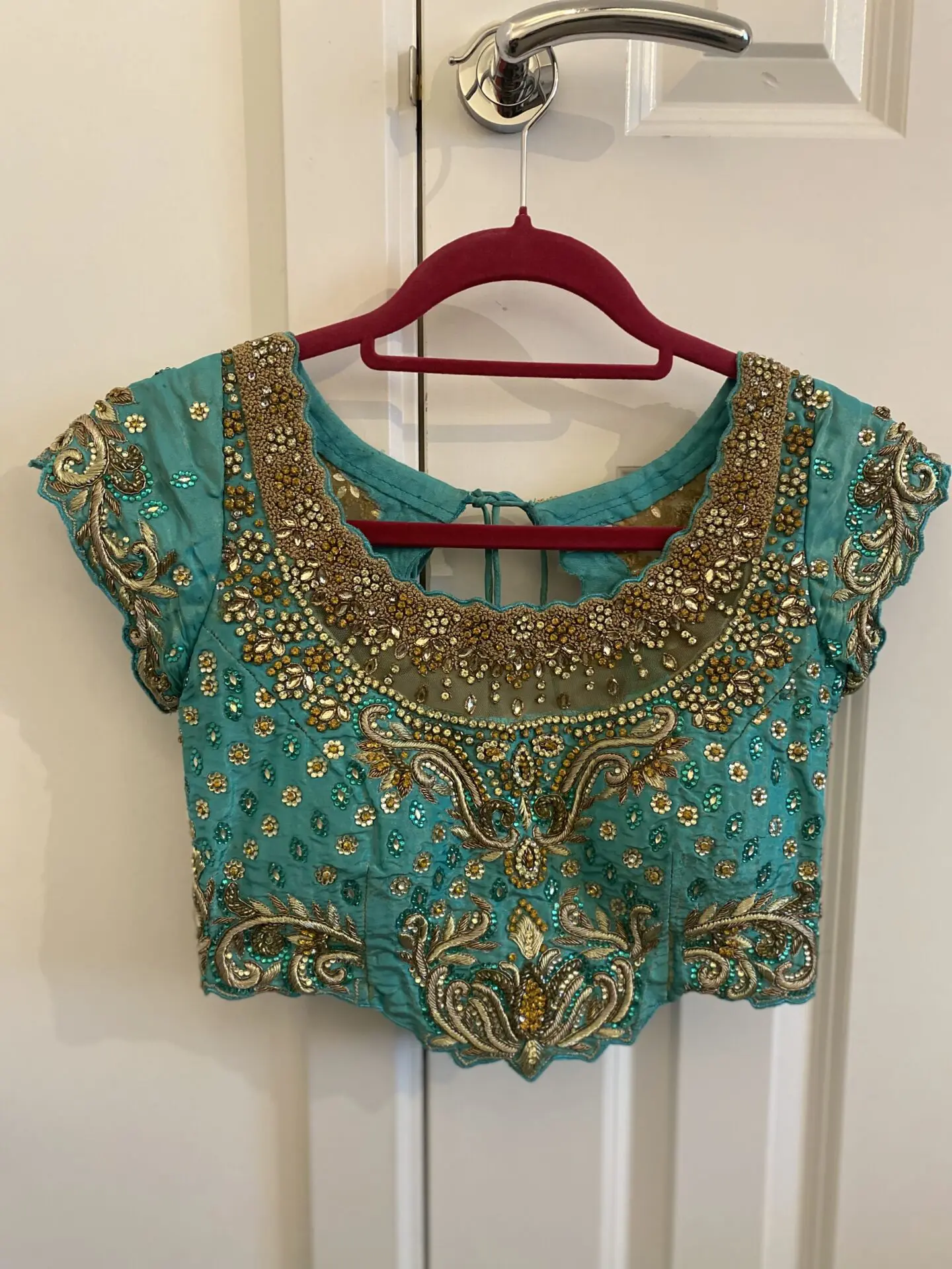 Coral and Teal Custom Made Lengha Made to fit me specifically- U.K. size 8/10 Hook fastening both sides for blouse Needs dry cleaning due to stain which is highlighted on photos - hopefully will come out. Worn twice. Gem missing - highlighted A couple other areas may need securing hence the reduced price Otherwise in great condition