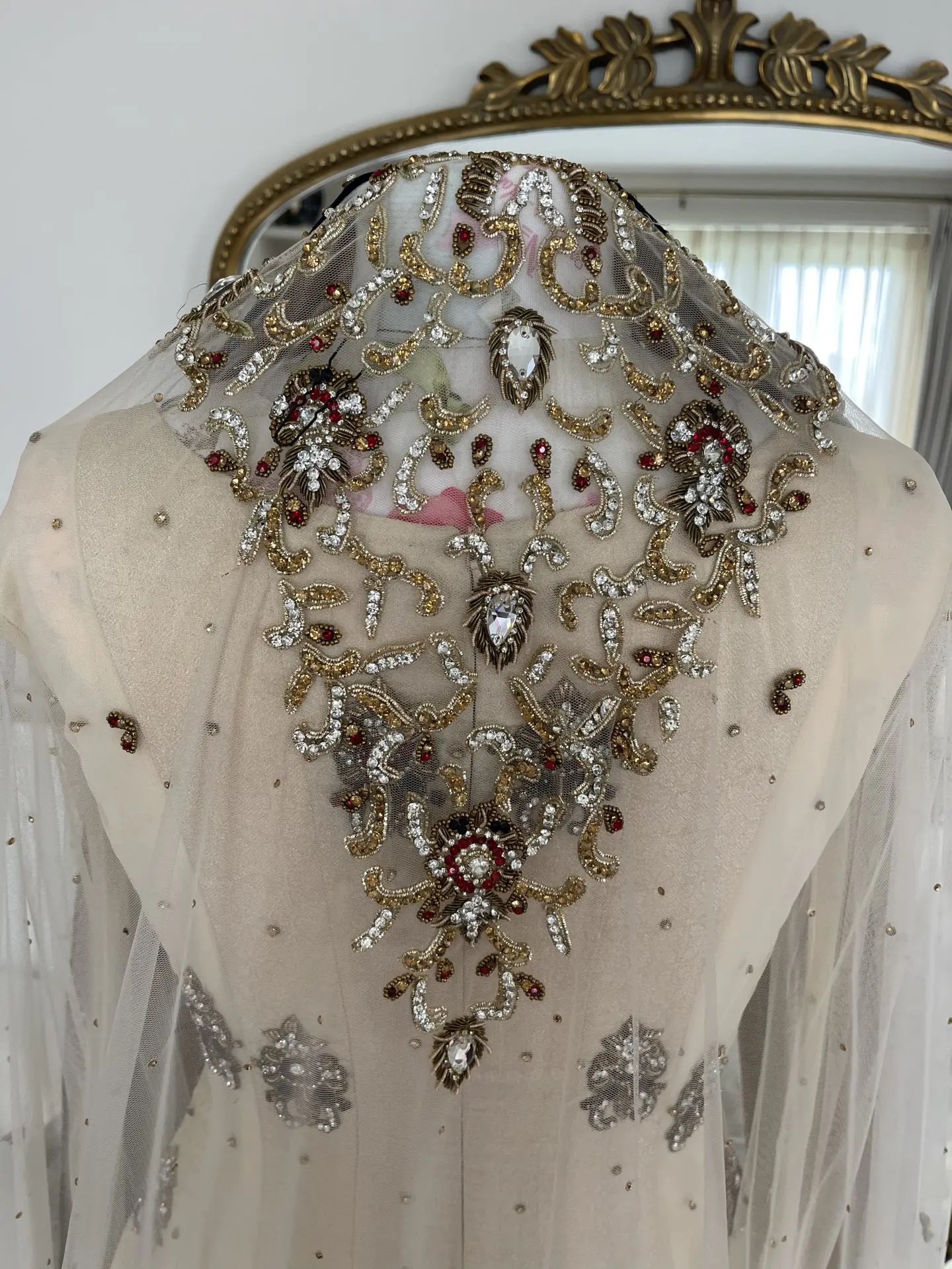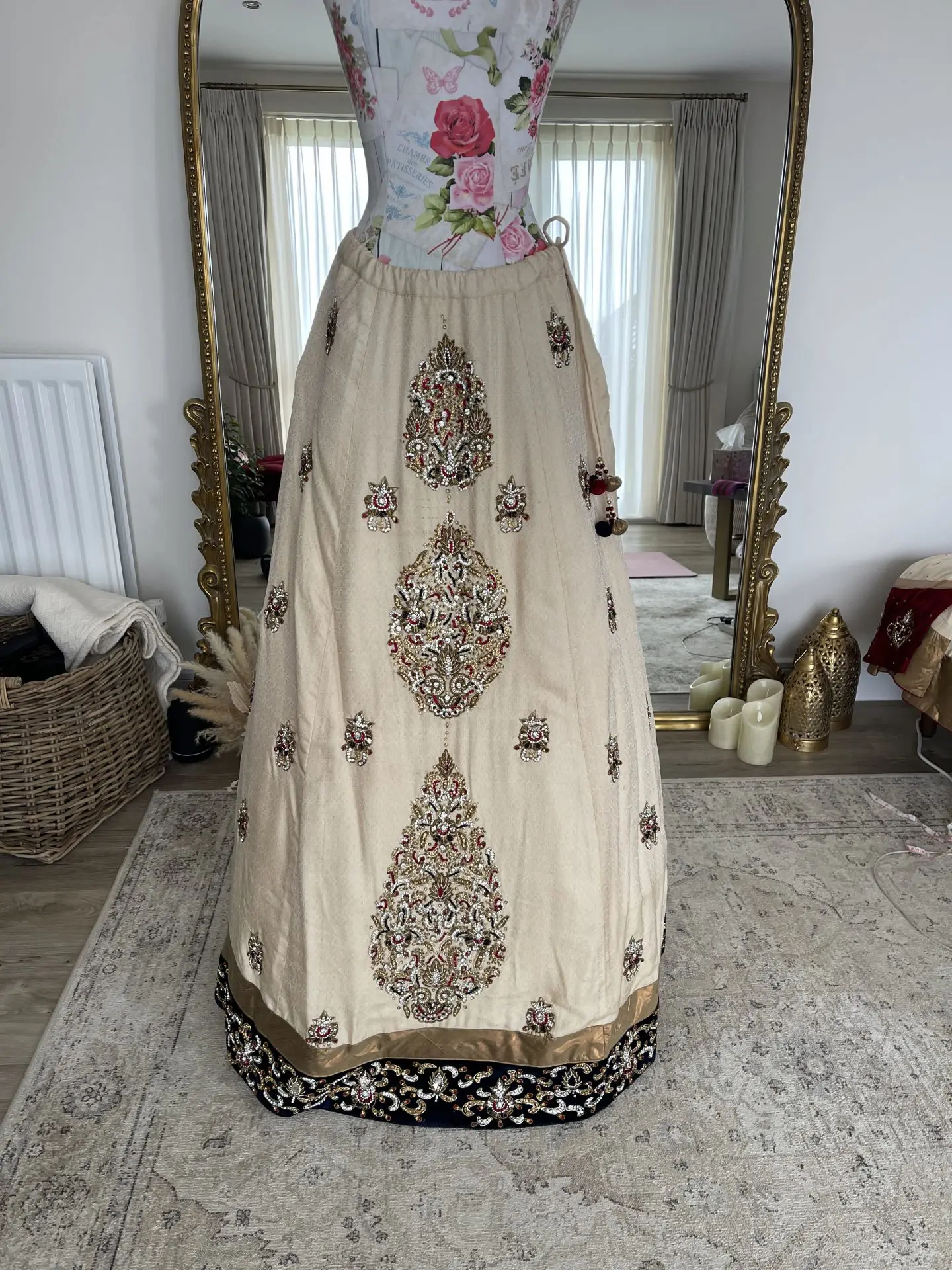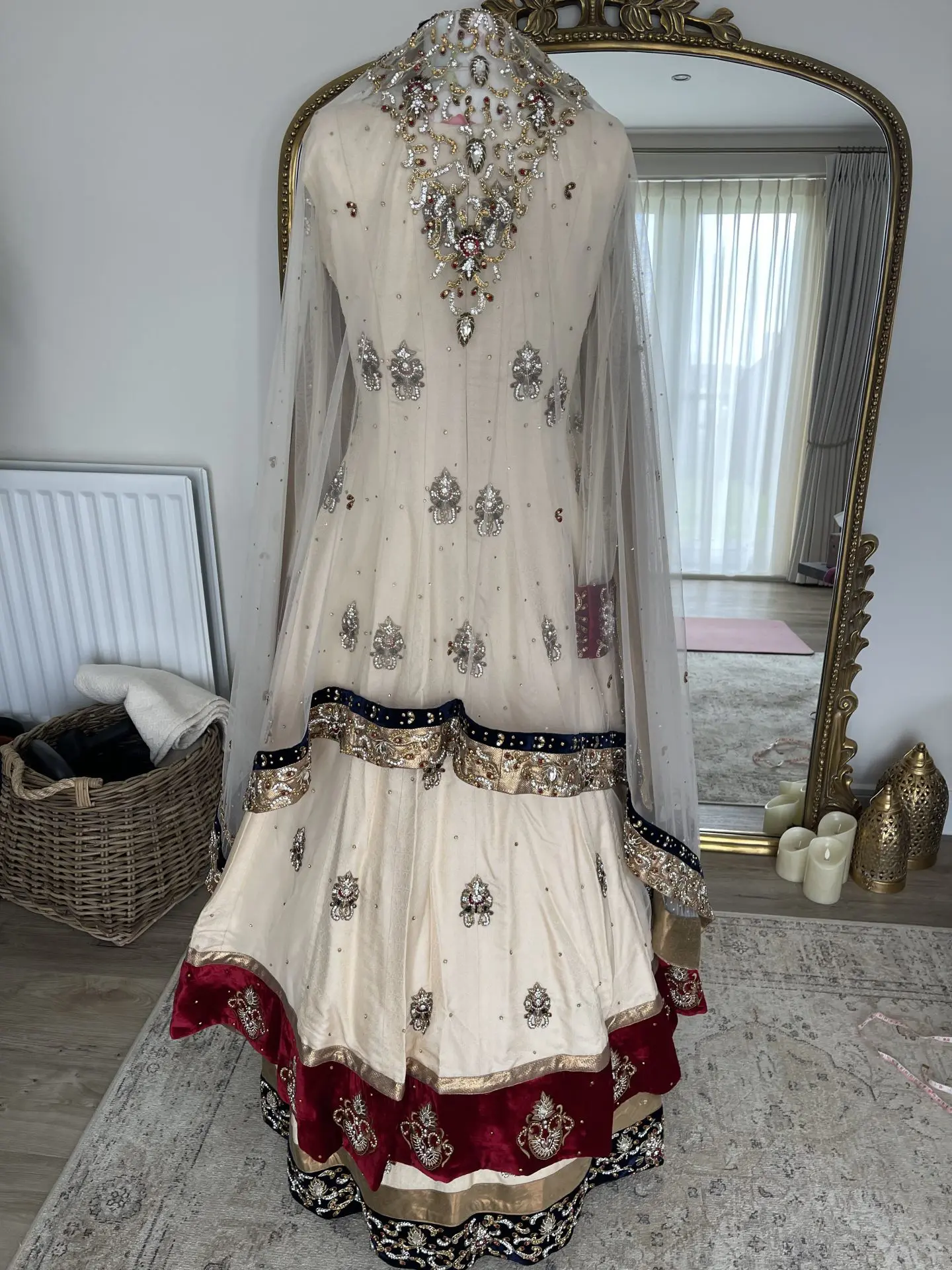 Beautiful bridal lengha with separate top corset and extended open jacket style. Skirt puffed out with additional net skirt nude which is separate piece. Stunning dupatta with embroidery on the head piece. Fabric: Silk Velvet Organza Net Swarovski stone embroidery all over with additional work embedded. Measurements: Length of top 53inches but it is slightly short at the front where it opens up which is 49inches Front corset style is 15inches in length Neck is 7inches deep Skirt length is 44inches Length sleeve is 25inches Arm hole is 5 inches Chest is 19inches Waist is 16inches Zip at the back for ease. Prefer collection in London.