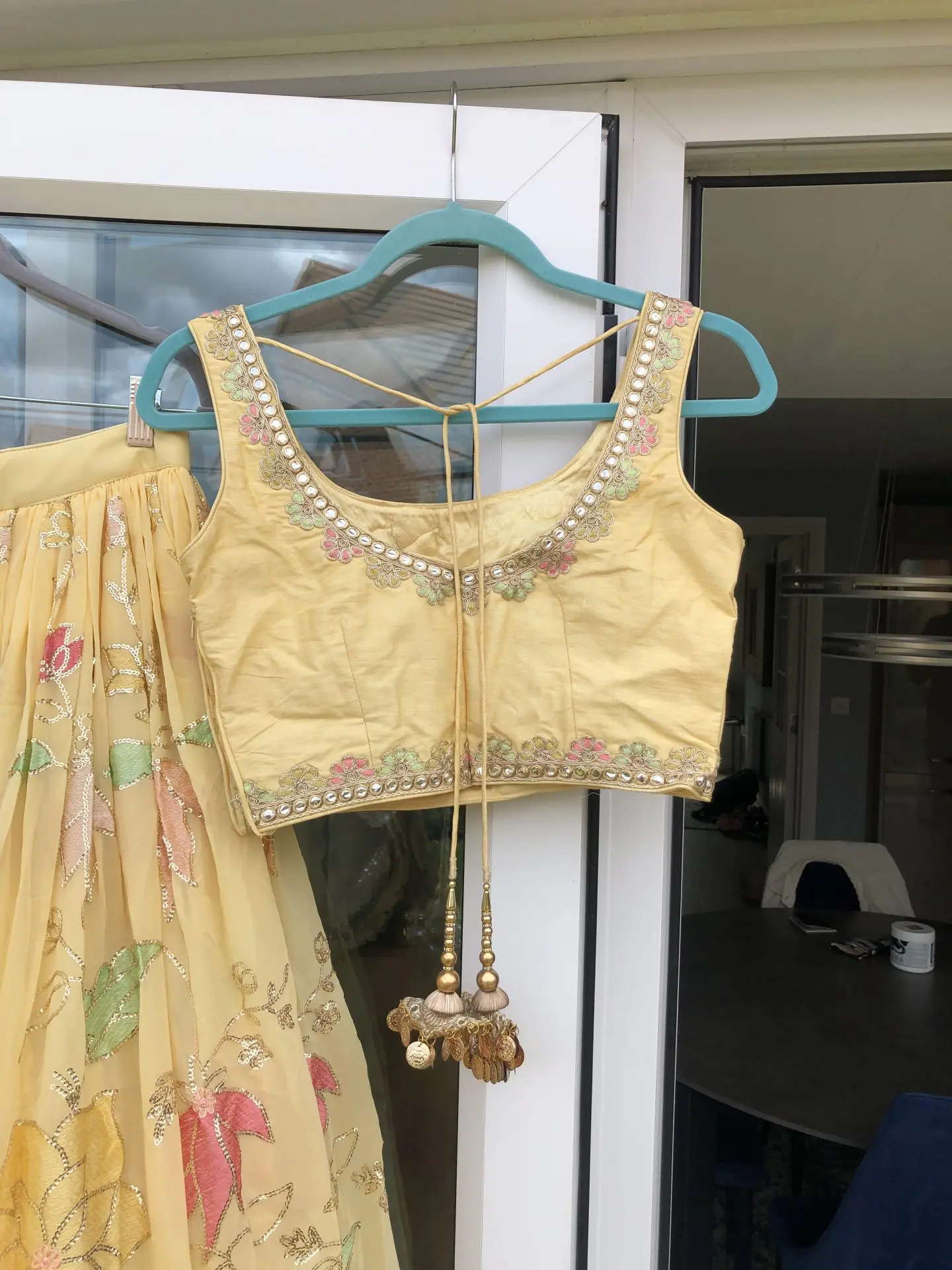 Beautiful pastel yellow designer Lehenga bought for £400 in Southall. Worn for few hours for sister’s wedding. Blouse currently fits a size 8 but has lots of room to adjust for a larger size. Realistic offers welcome. Up for sale on other platforms so please check before buying.