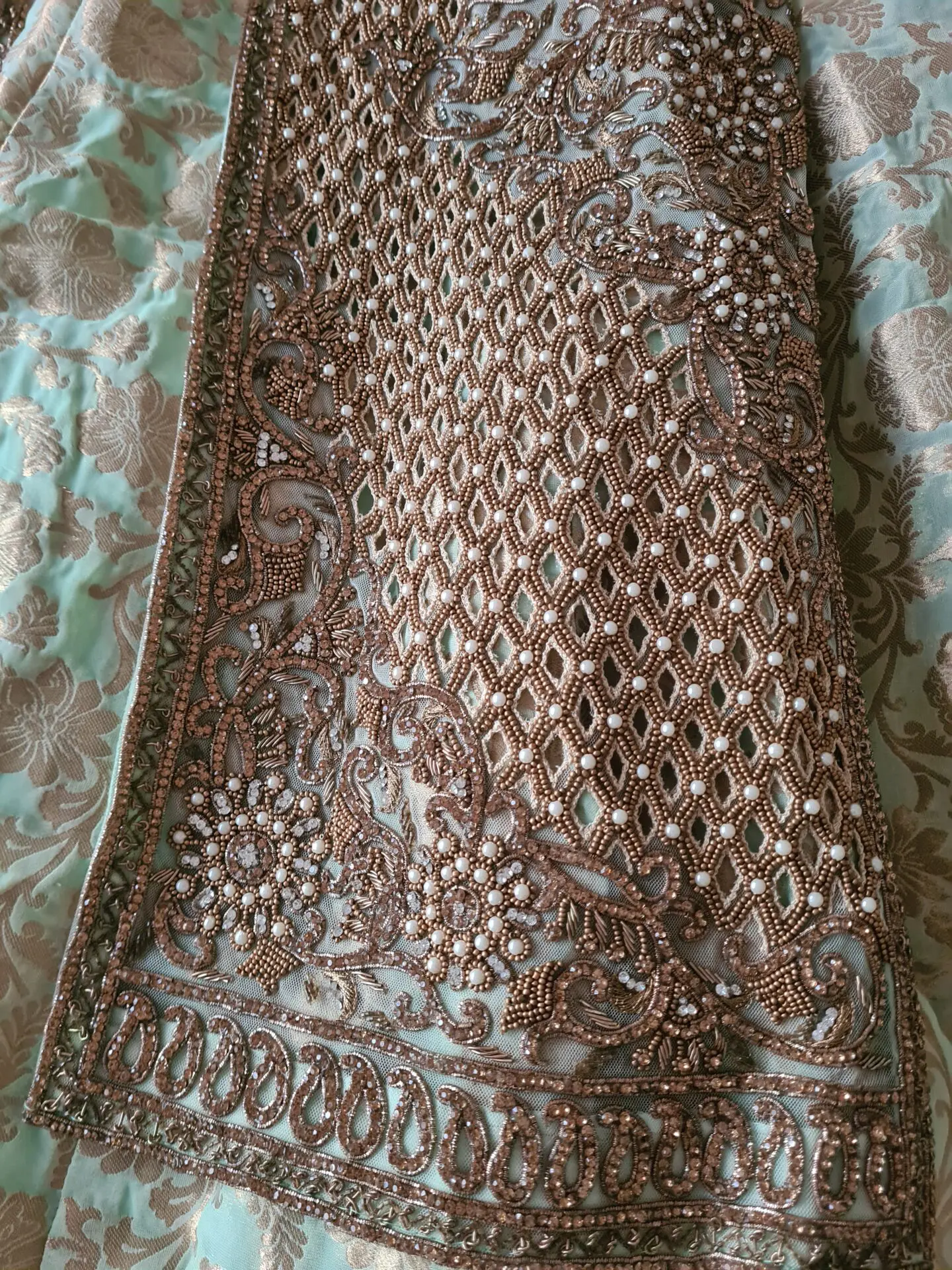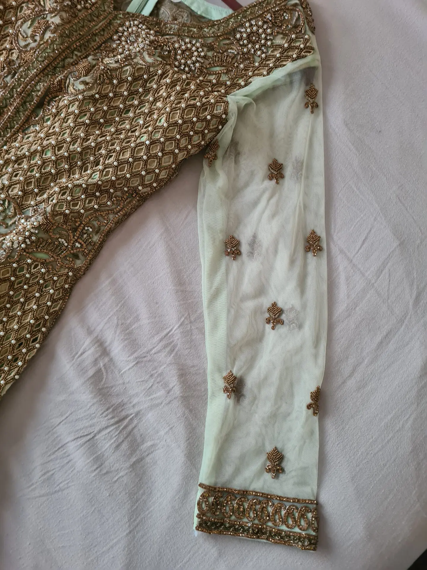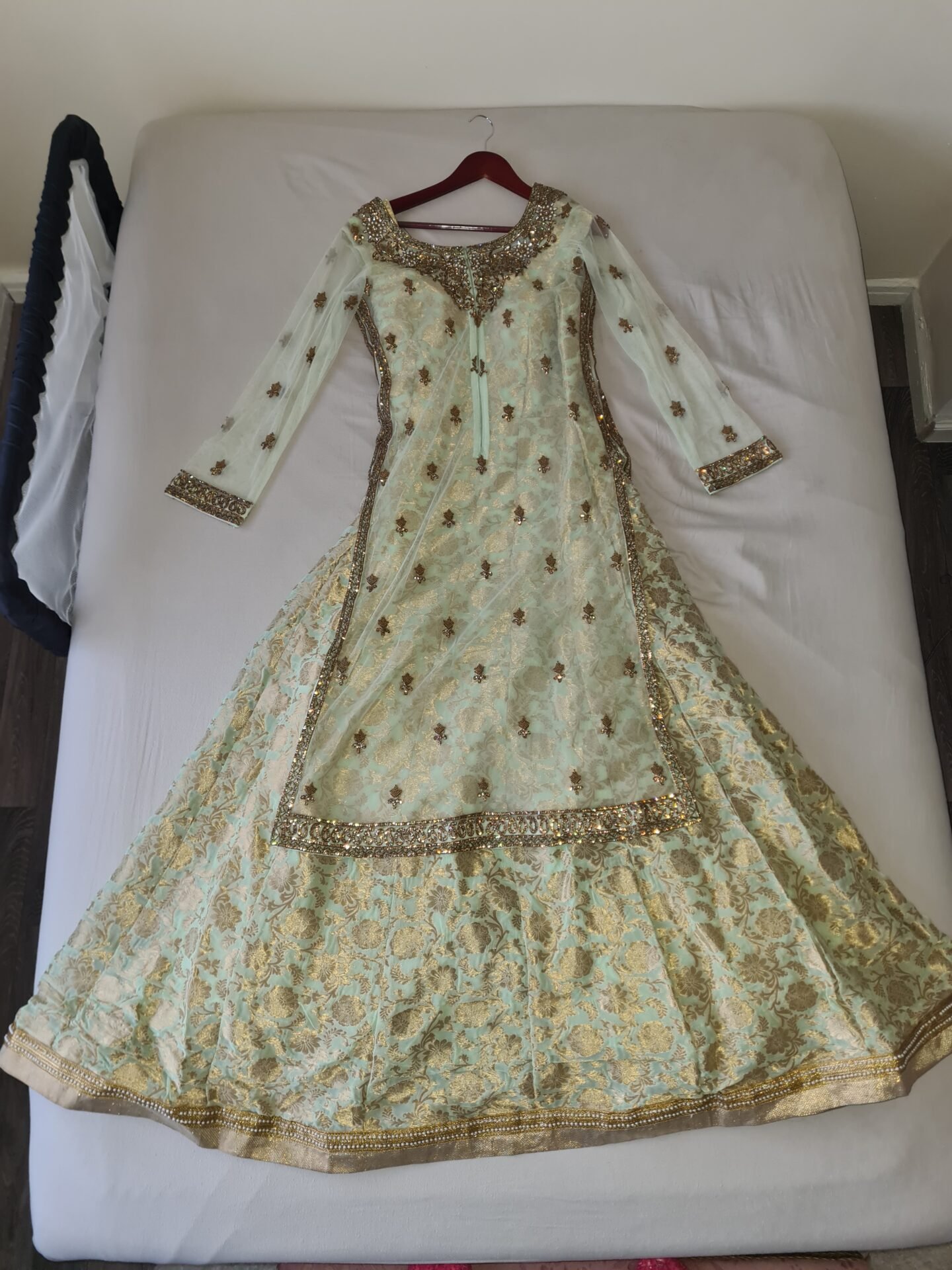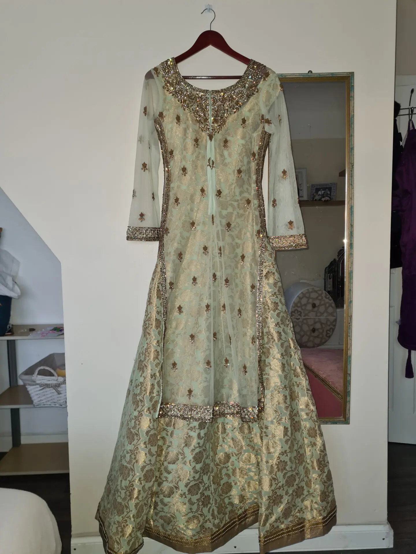 I have a beautiful sage green and gold bridal dress which has only been worn once and then kept in a dress storage bag. It is in pristine condition. Originally purchased from ''Rivaaj Boutique'' Alum Rock Birmingham, it is a UK size 12. It has a long front, open style shirt with heavy embroidery, overlaying a barnarsi patterned dress which is lined. There is cut work along the ends, and it is studded with zircons and pearls. It comes with a sage green net dupatta, outlined in gold.
