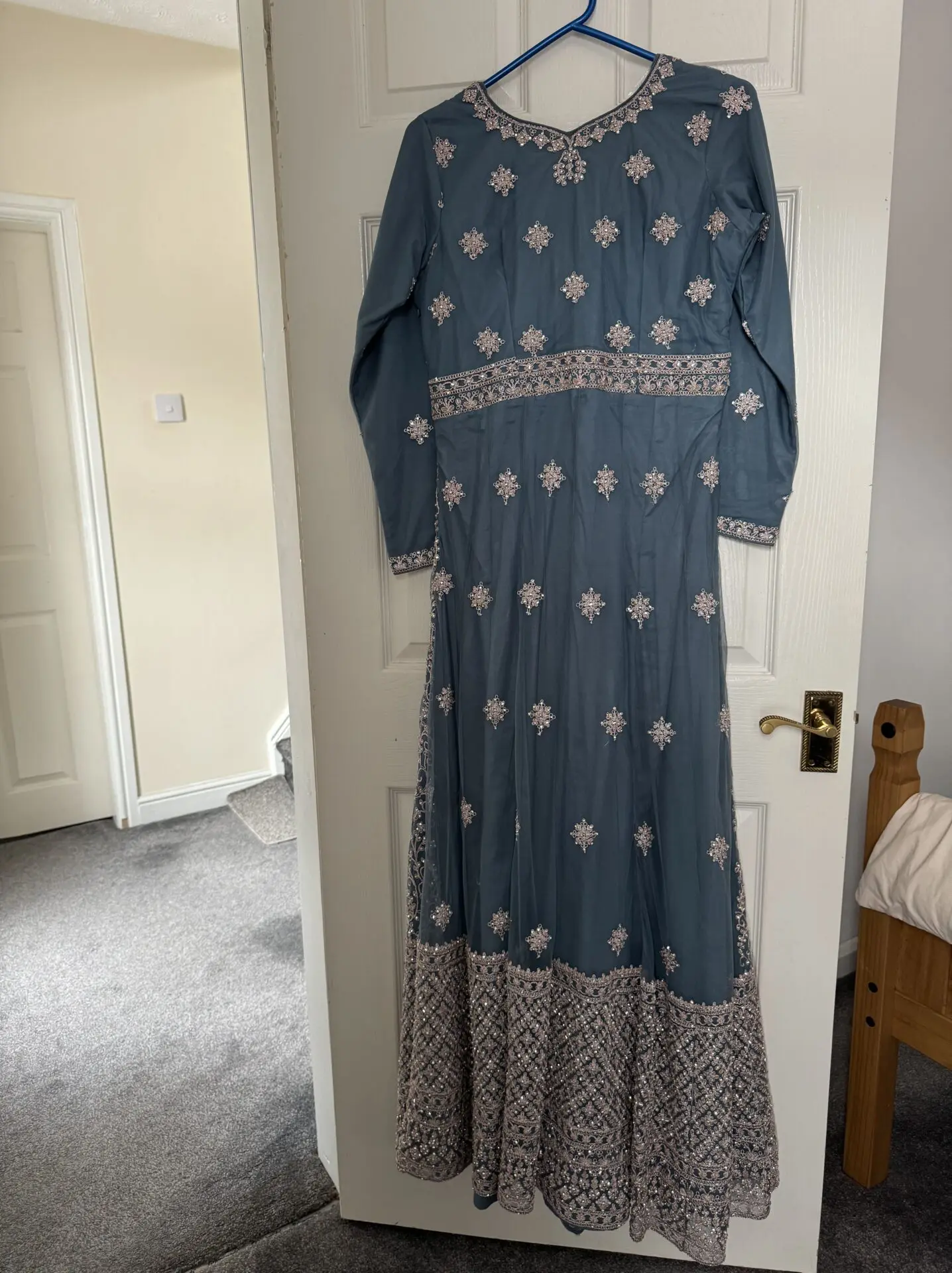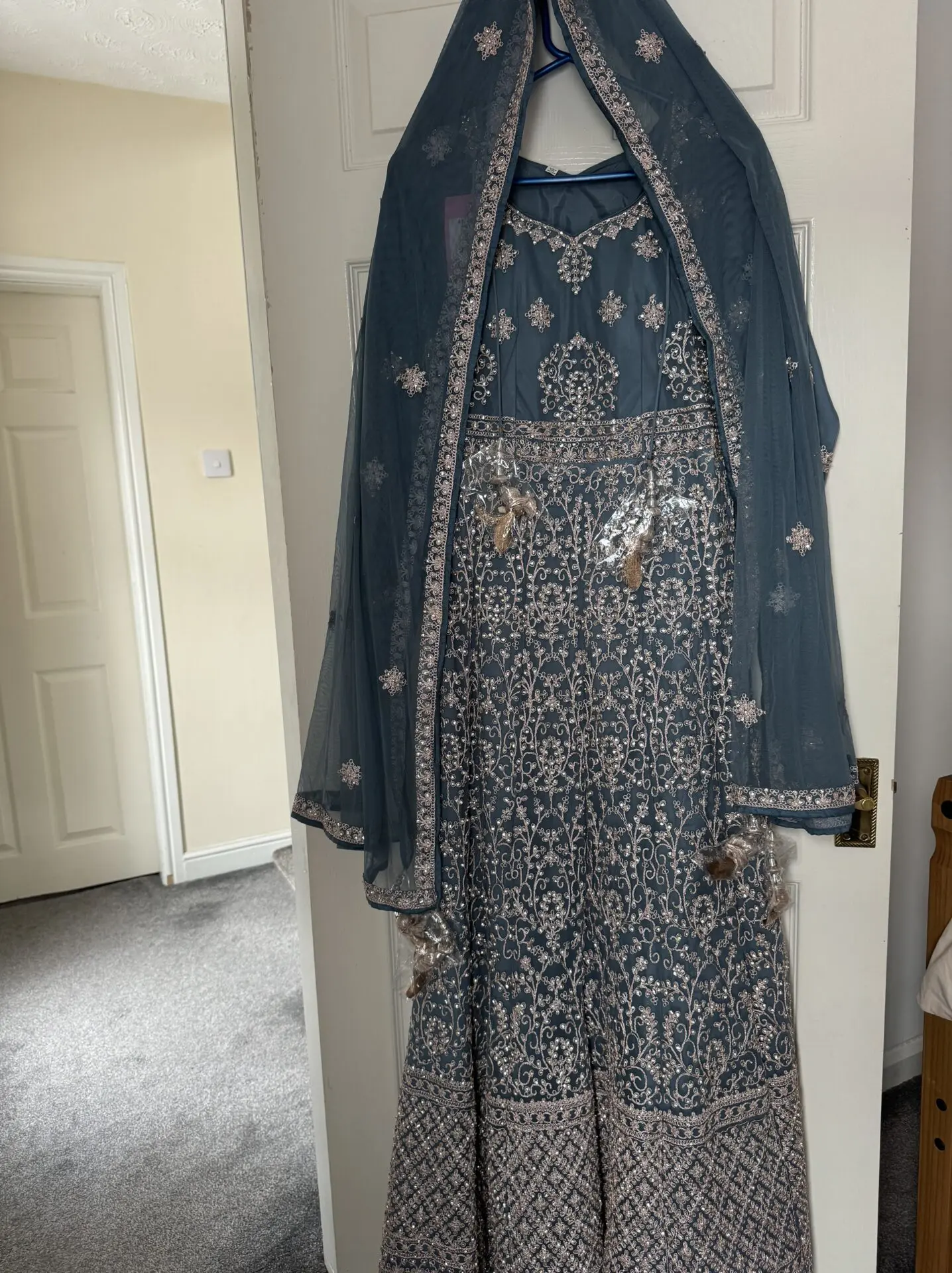 New with tags and has never been worn. Comes with a side scarf and trouser bottoms. The side scarf is not heavily embroidered due to the heavy detail work on the dress.