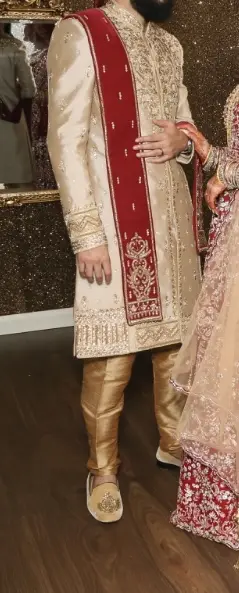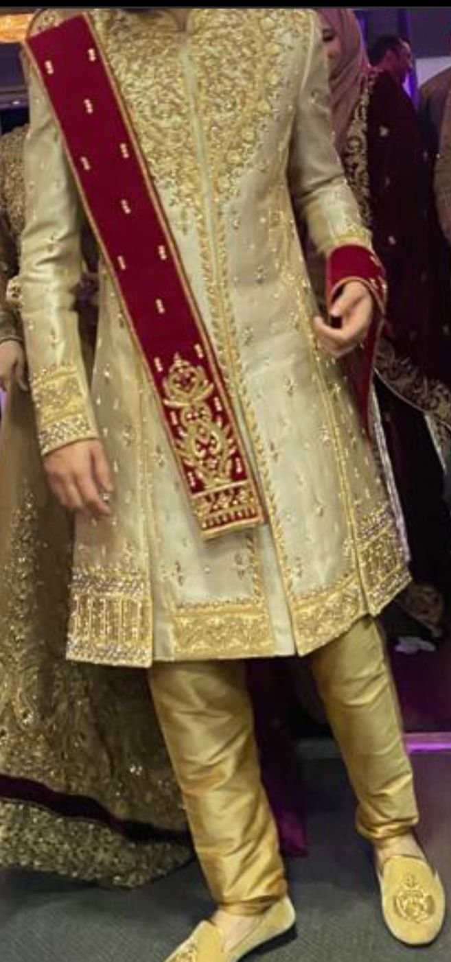 Embroidered red and gold male sherwani for sale. It has only been worn once on our wedding day. Please get in touch if you’re interested or share to anyone that is looking to buy.