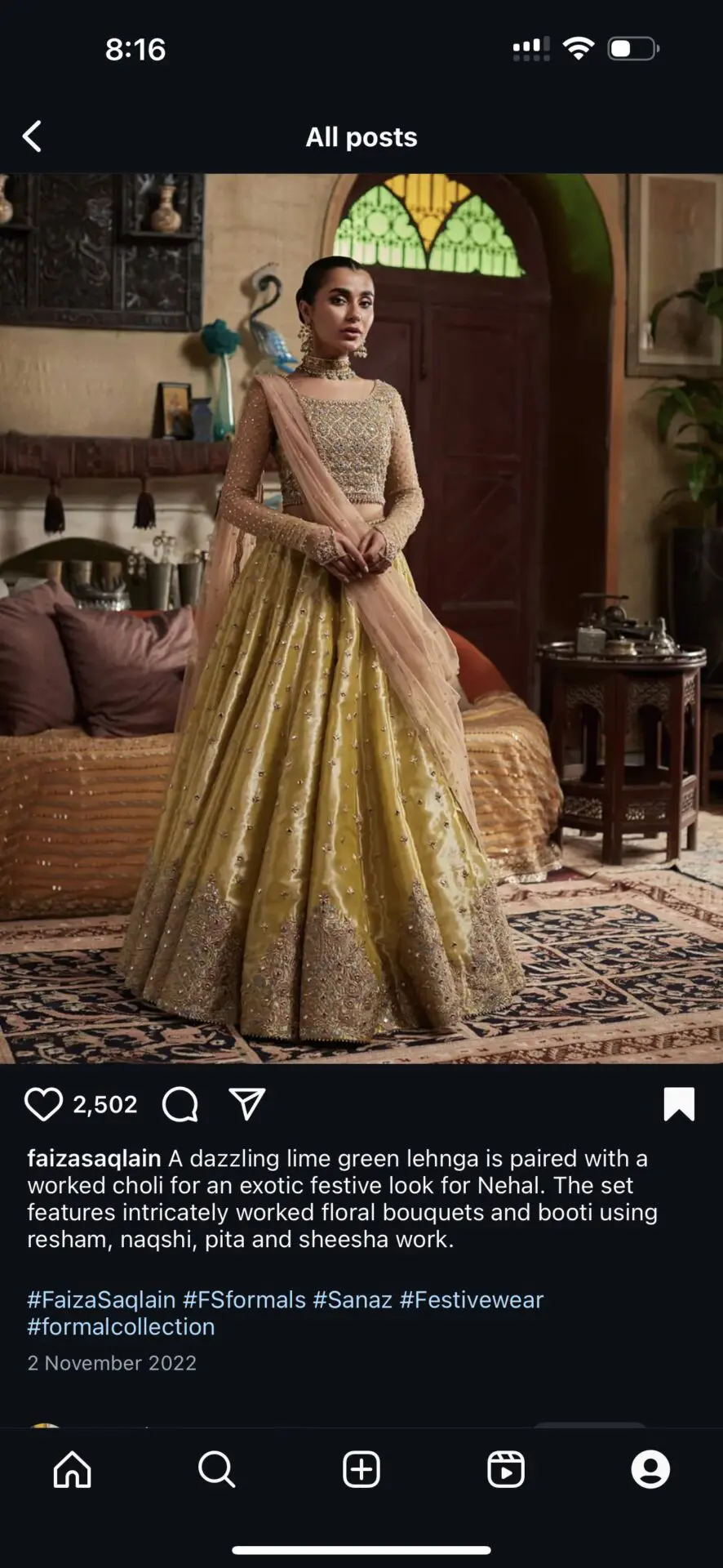 A dazzling lime green lehnga is paired with a worked choli for an exotic festive look for Nehal. The set features intricately worked floral bouquets and booti using resham, naqshi, pita and sheesha work. Choli Embellished chiffon choli front and back