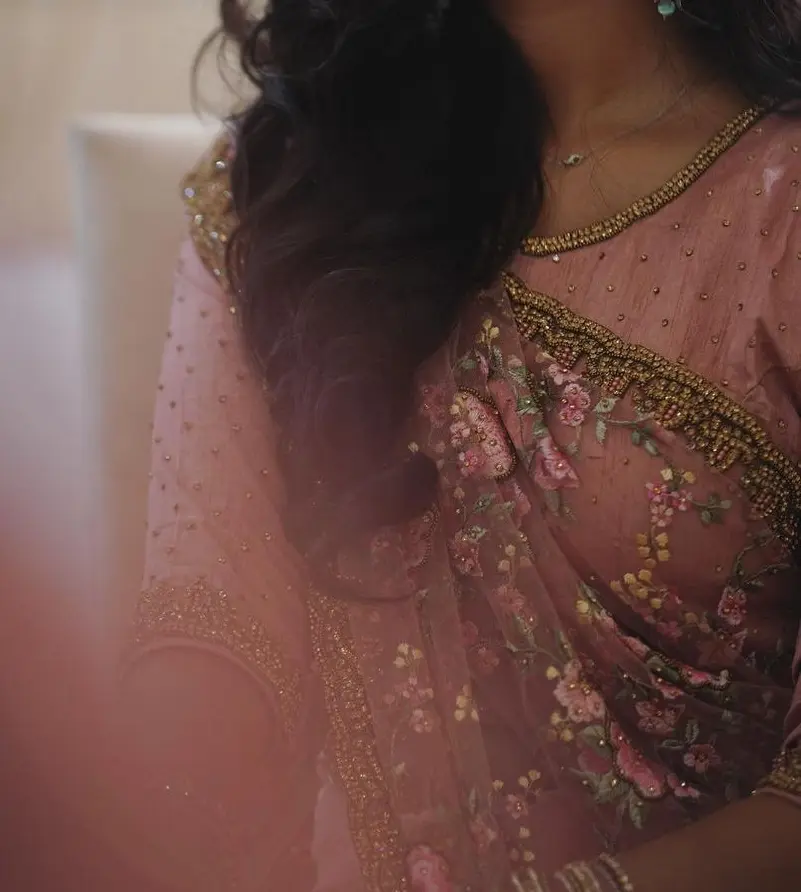 Pretty pink floral organza saree, blouse size 8, easily adjustable to fit