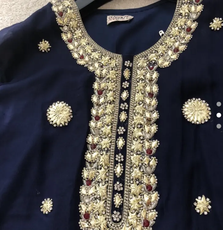 Original Sequinze outfit. Long chiffon shirt with pencil trousers in jamawar and chiffon scarf.