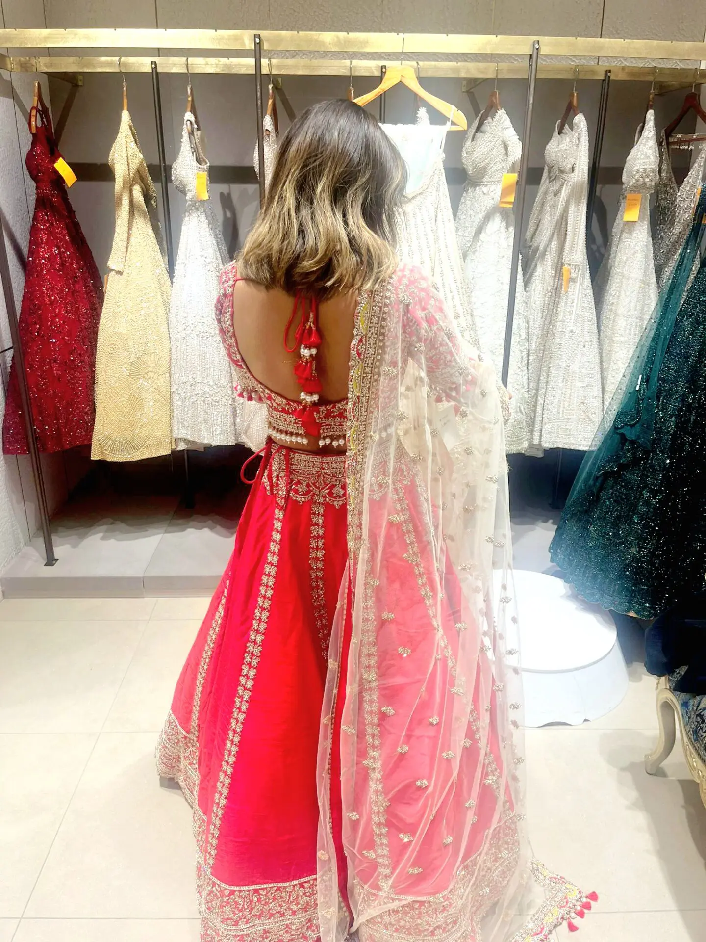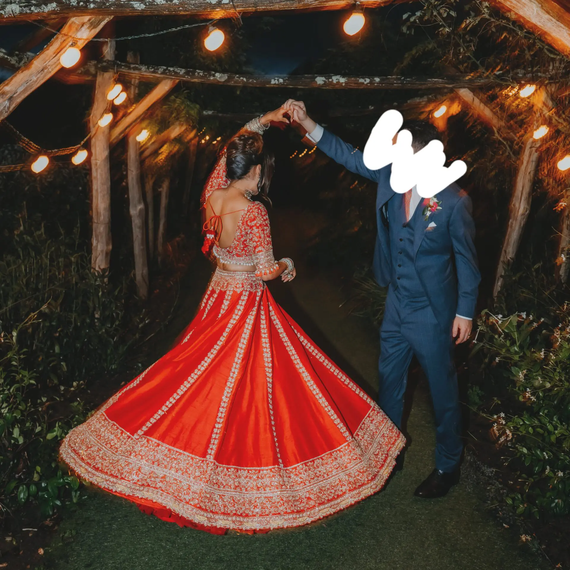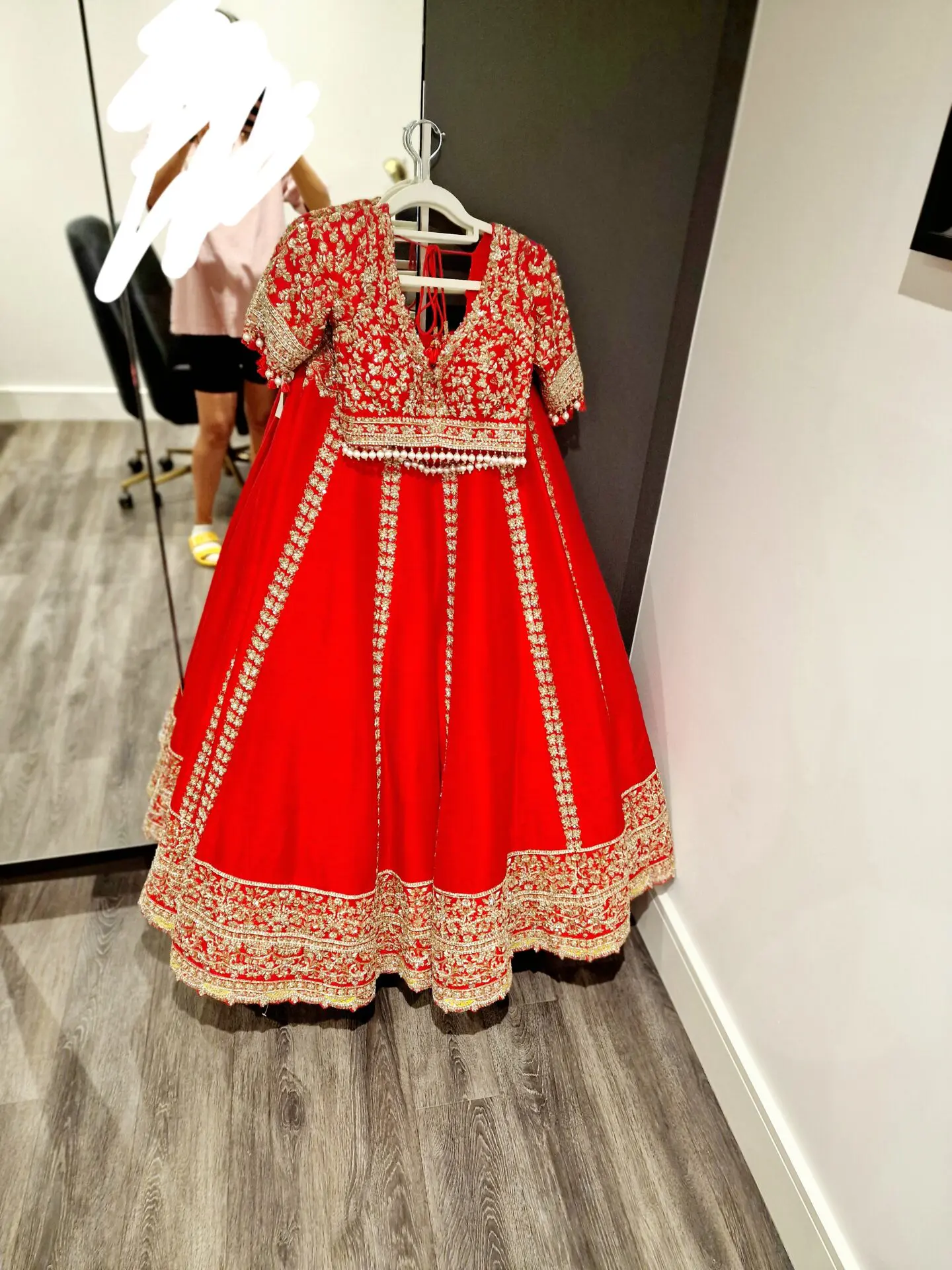 I'm selling this stunning coral-red bridal lehenga, worn just once by me and still in excellent condition. It was custom-made to my measurements by Frontier Raas, I'm a size 8 but it would fit a UK size 6 with minor alterations. For reference for skirt length, I’m 5’5” and wore 3-inch block heels and the length was perfect.