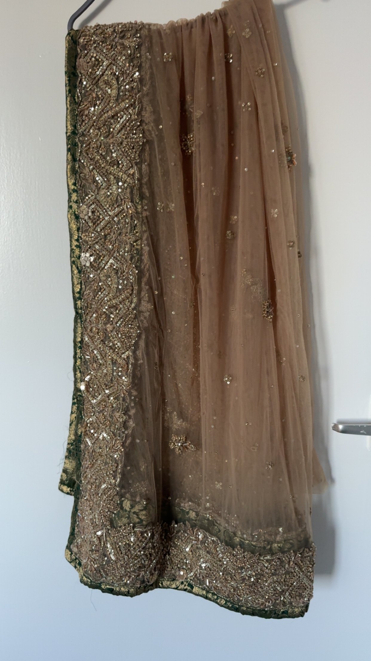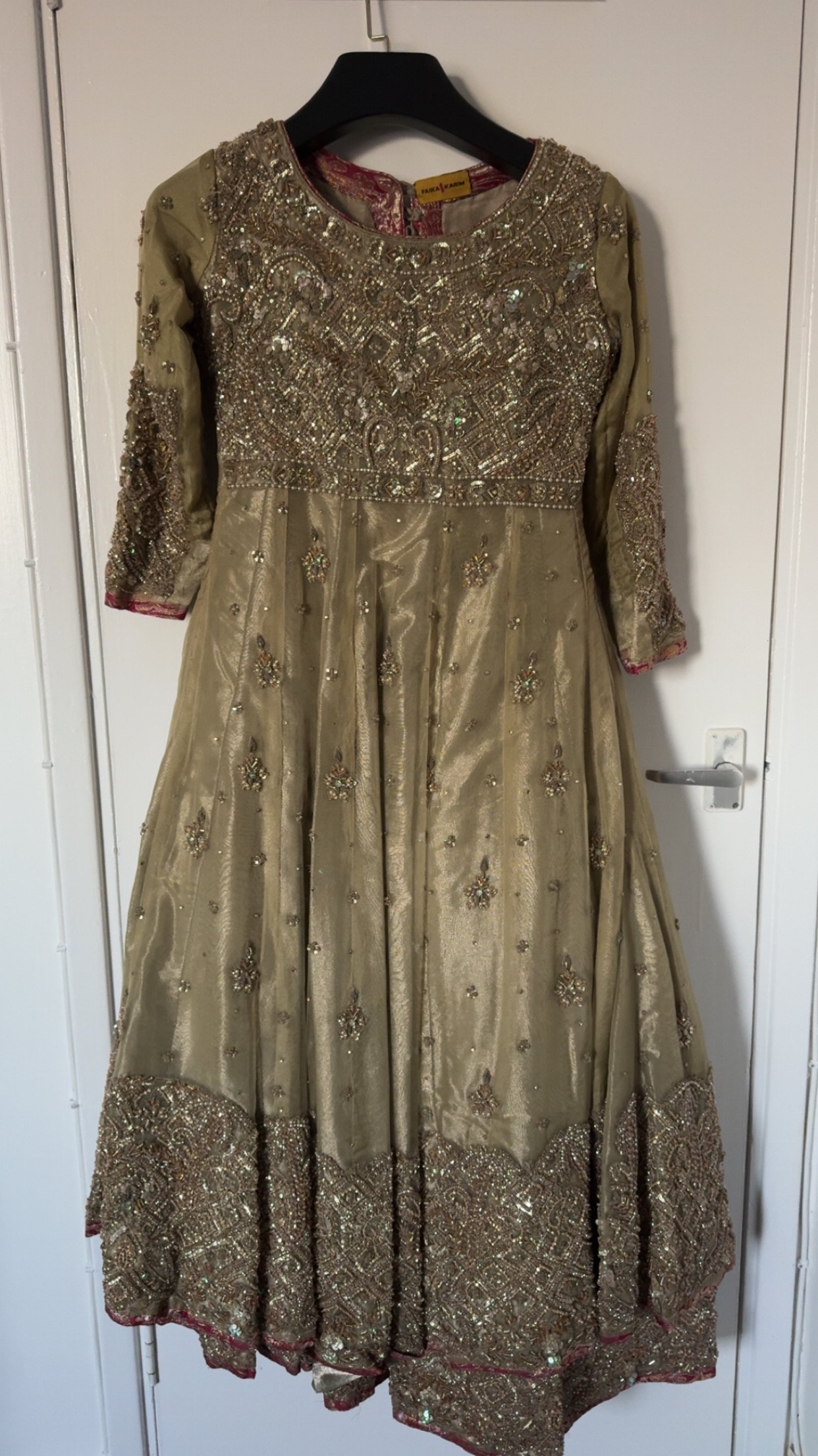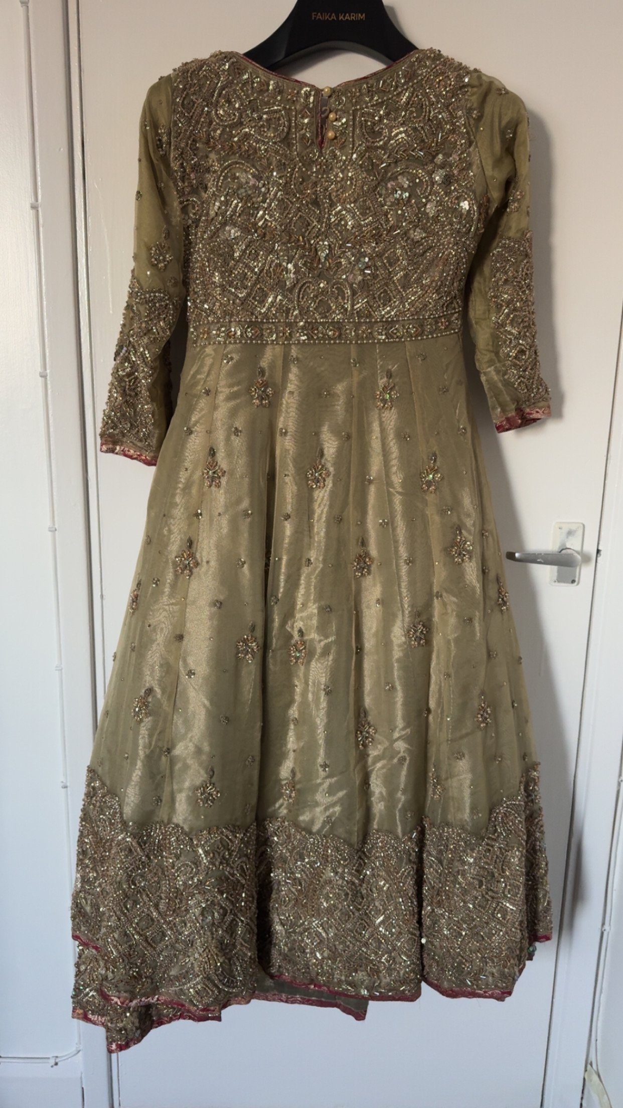 An incredible beautifully crafted gold formal dress featuring extremely detailed hand embroidery, heavy beading, sequins, stones, and intricate threadwork. This is a premium-quality outfit with a rich, elegant finish — perfect for weddings, receptions, dholkis, mehndi, Eid, or any special occasion.