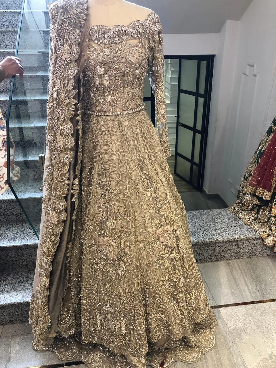 Beautiful gold gown with matching dupatta custom-made from Republic Womenswear, Pakistan