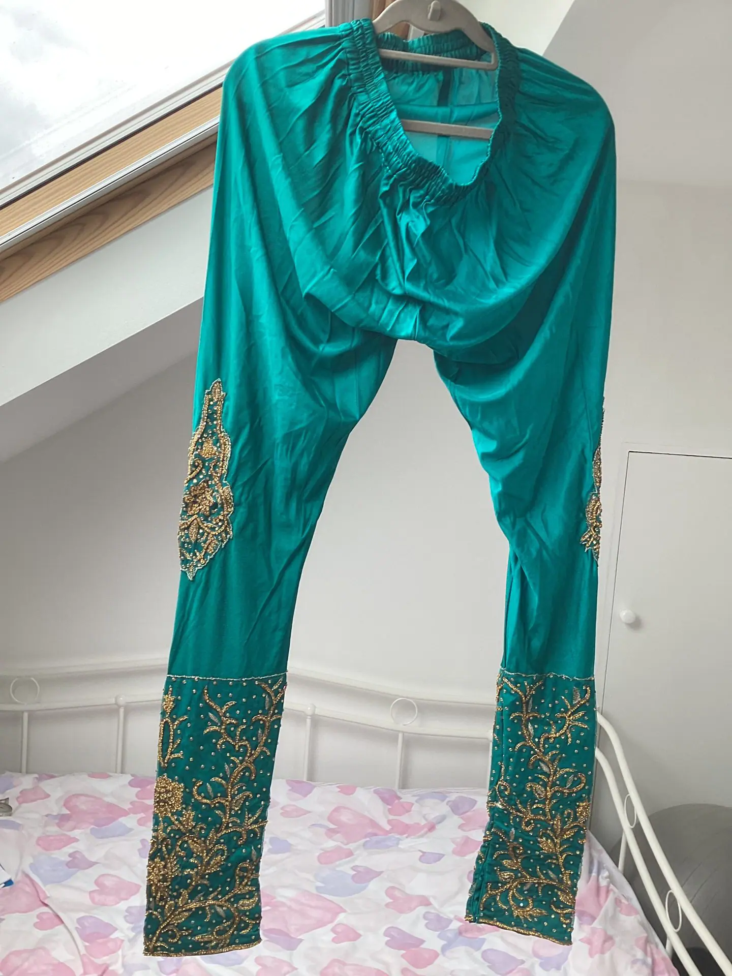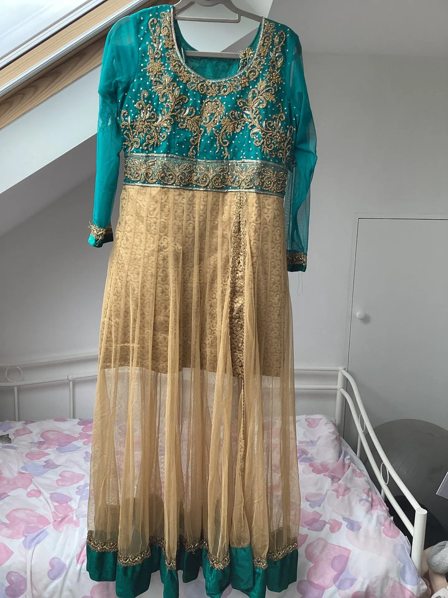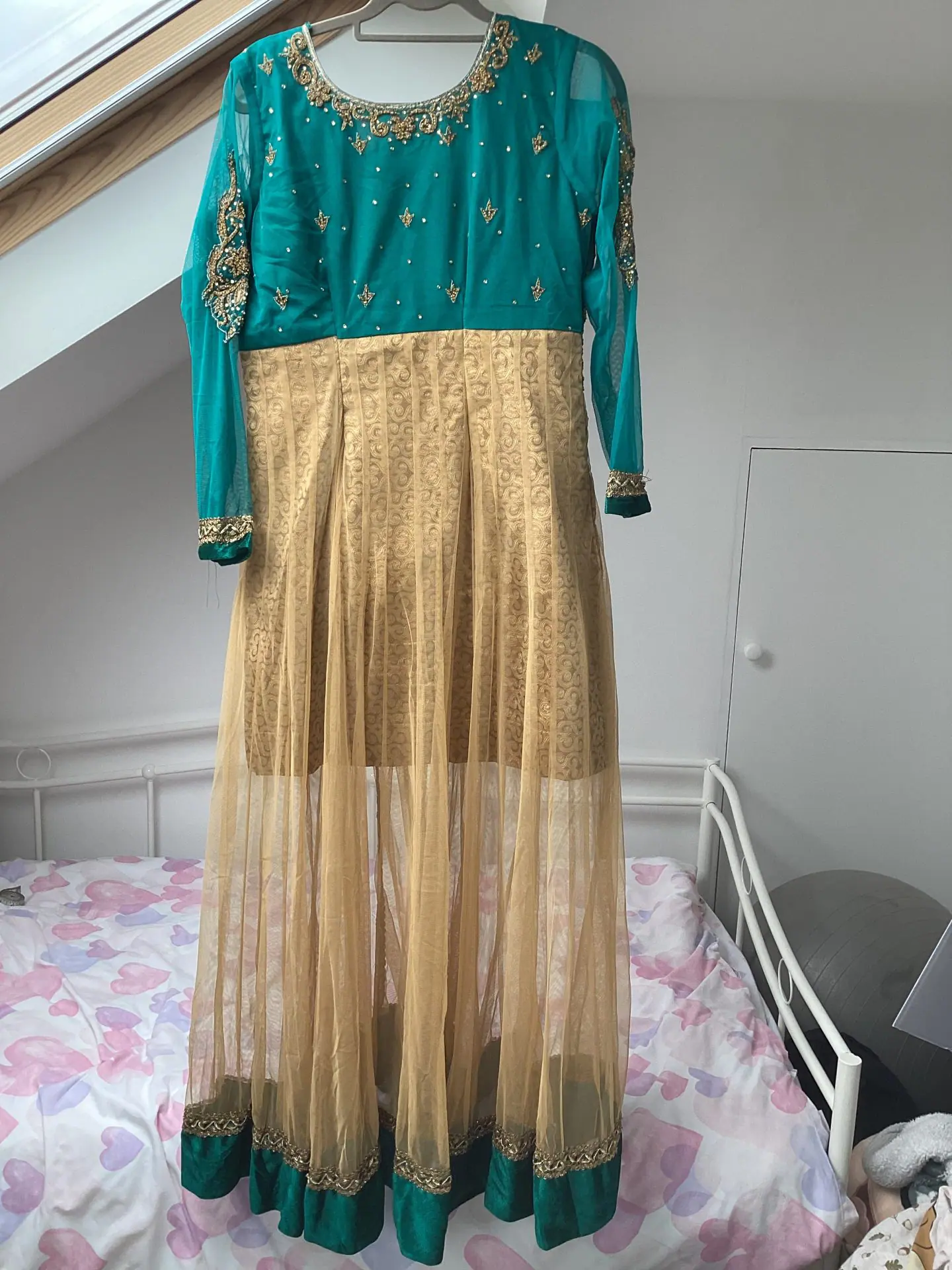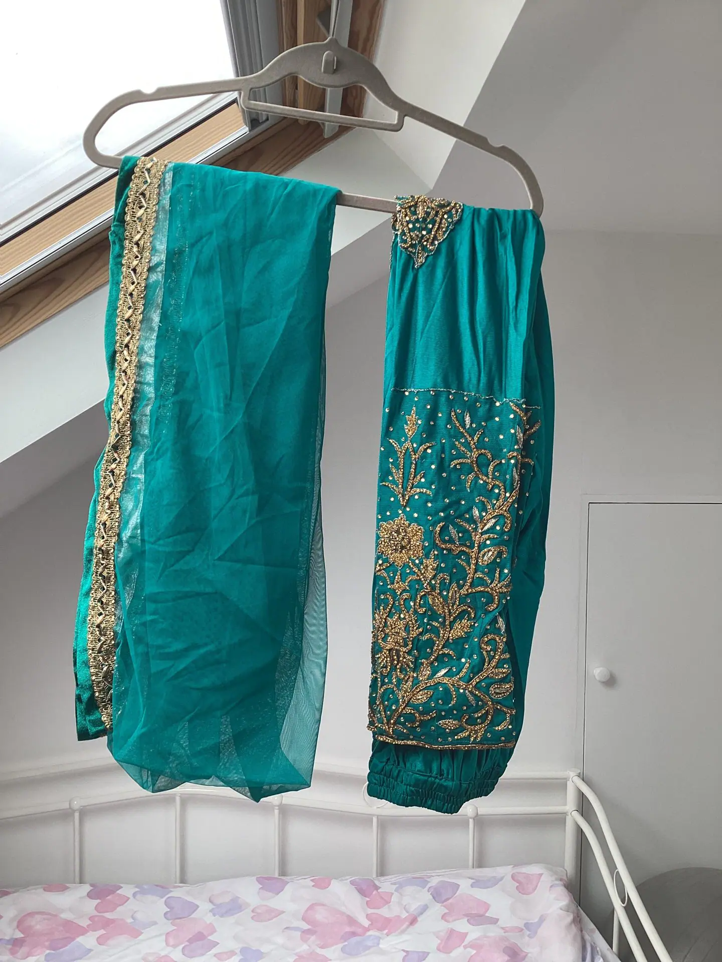 Deep green & gold embroidered Asian suit with stone work. Embroidered trousers to be seen under the net to add an extra level of glamour