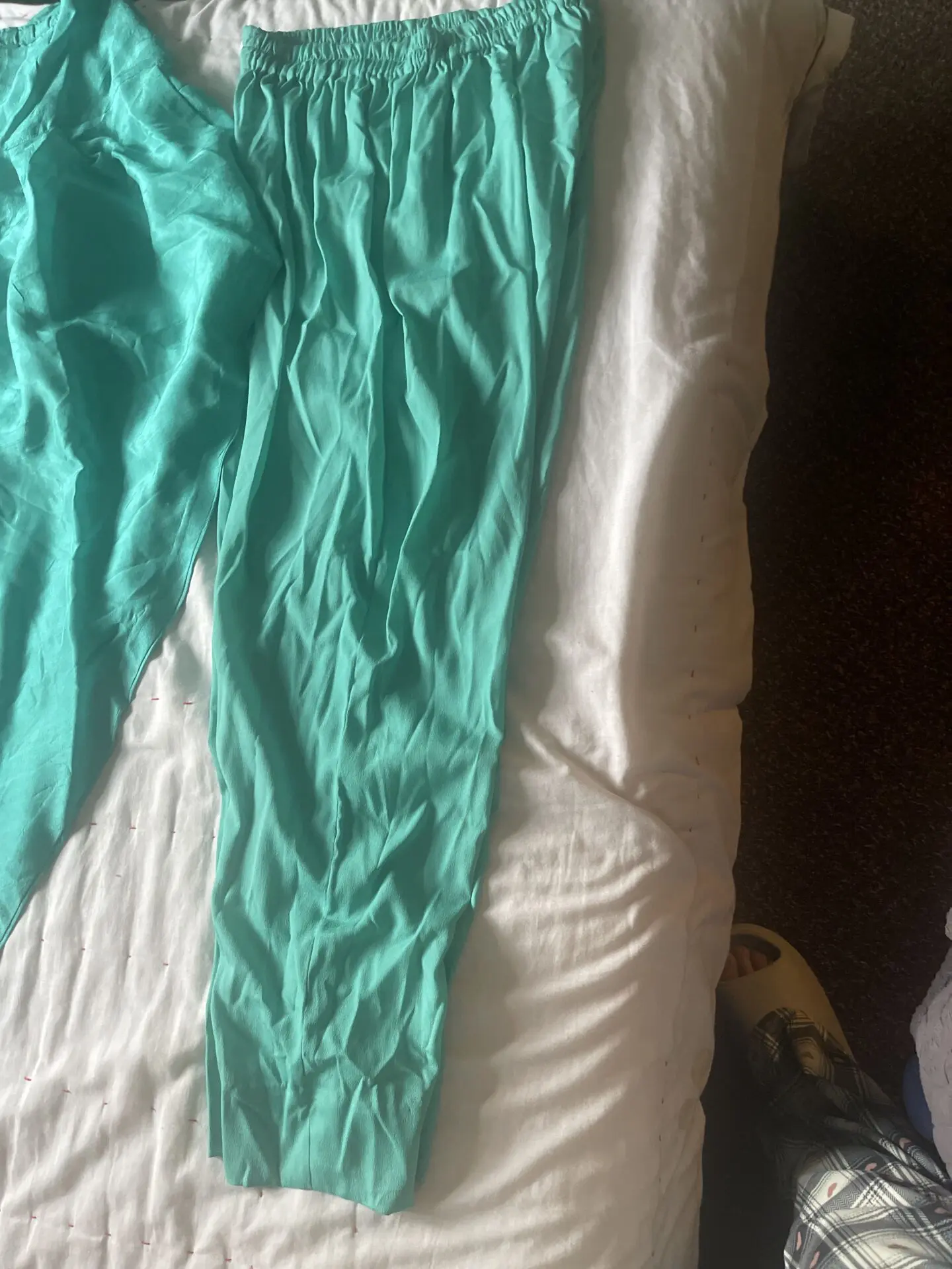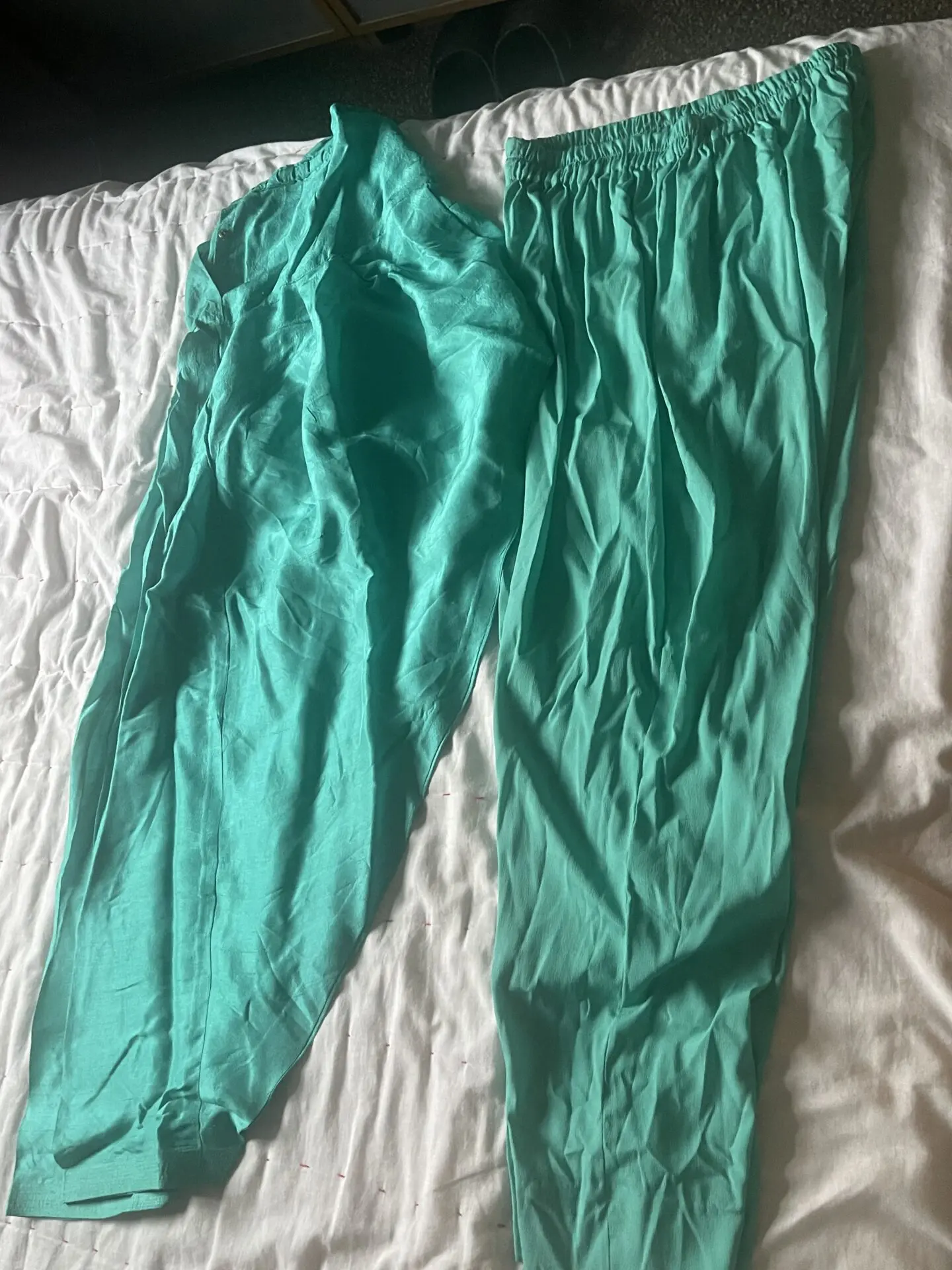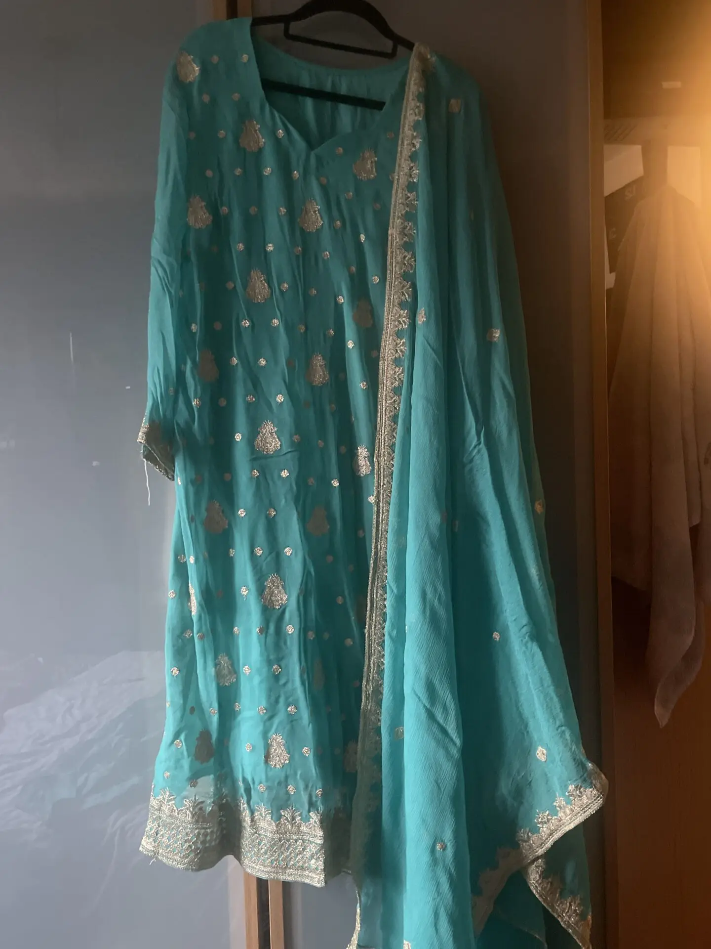 Size 12-14 long shirt Asian suit with back zip. One straight trouser and 37” inches shalwar. Pakistani style with gotta thread work.