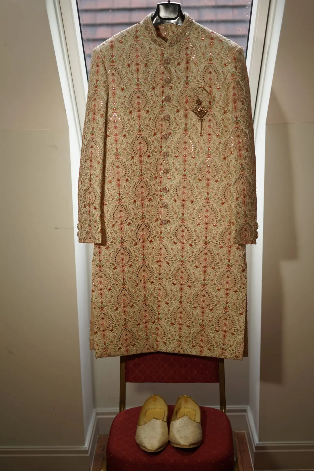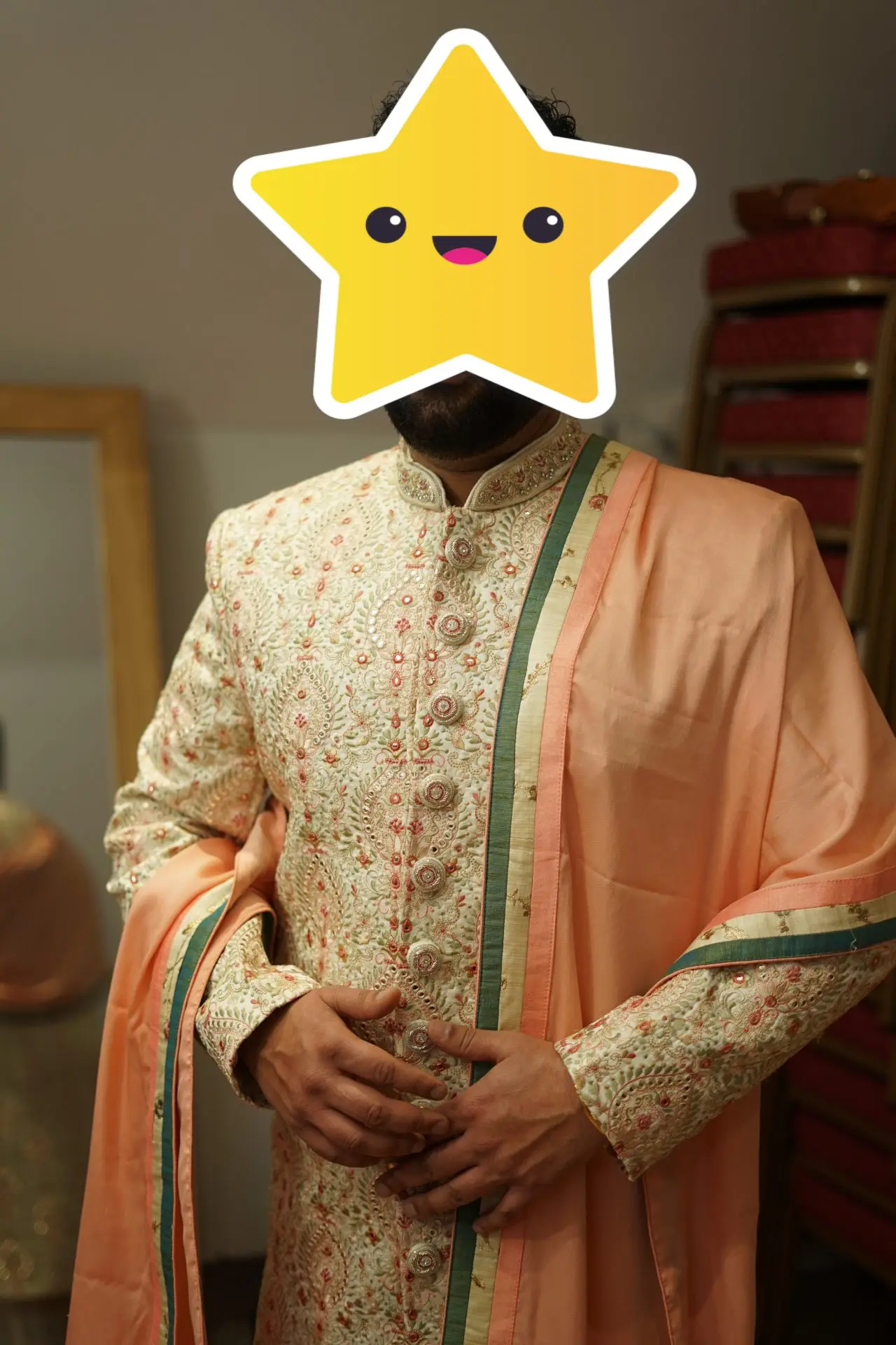 Exceptionally stunning embroidered Groom's Sherwani. The back is the same detail as the front. This pastel sherwani is currently on trend with pastels being in season. The sherwani has only been worn for a few hours. The entire outfit is for sale, this includes the sherwani jacket, trousers, dupatta and brooch. The entire outfit with brooch was bought for £900.