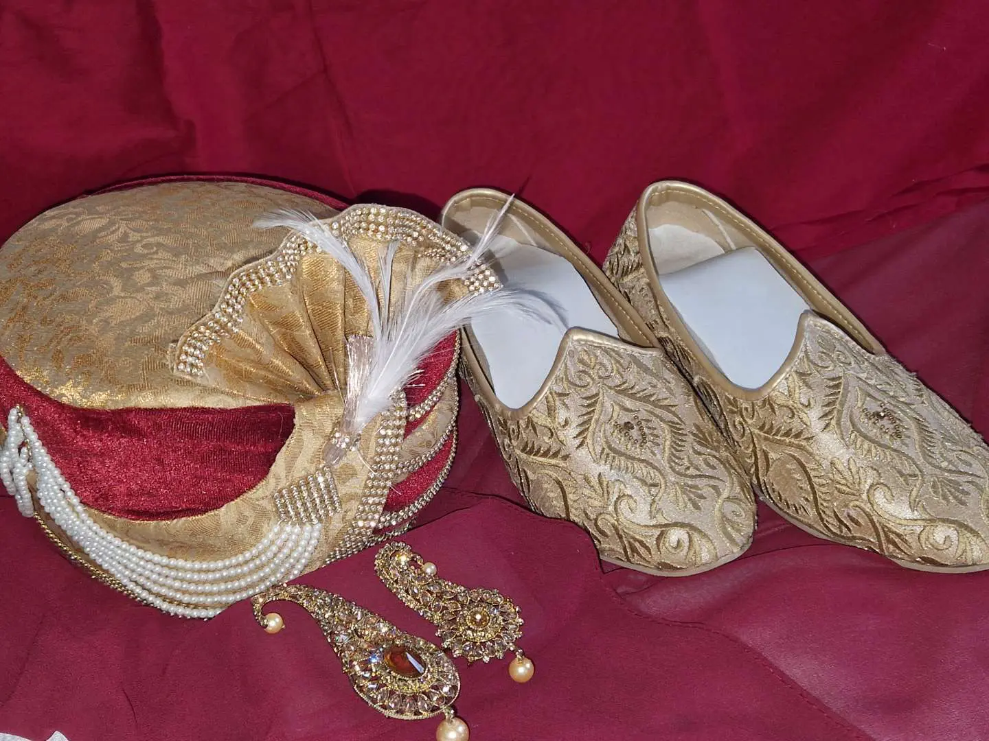 comes with a red material for turban(pagg) and 2 brooches along with a side scarf with golden embroidery and a kulla with gold embroidery and two different colour choori pants