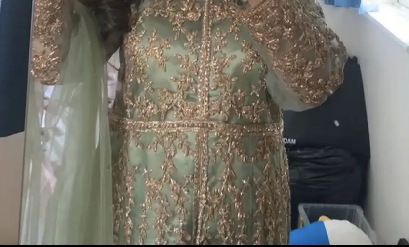 A beautiful khaki green readymade , heavily embroided party/wedding dress , silk lining underneath. Beautifully embroided net arms with silk lining just above the elbows , worn once for a few hours new condition also comes along side a net dupatta.