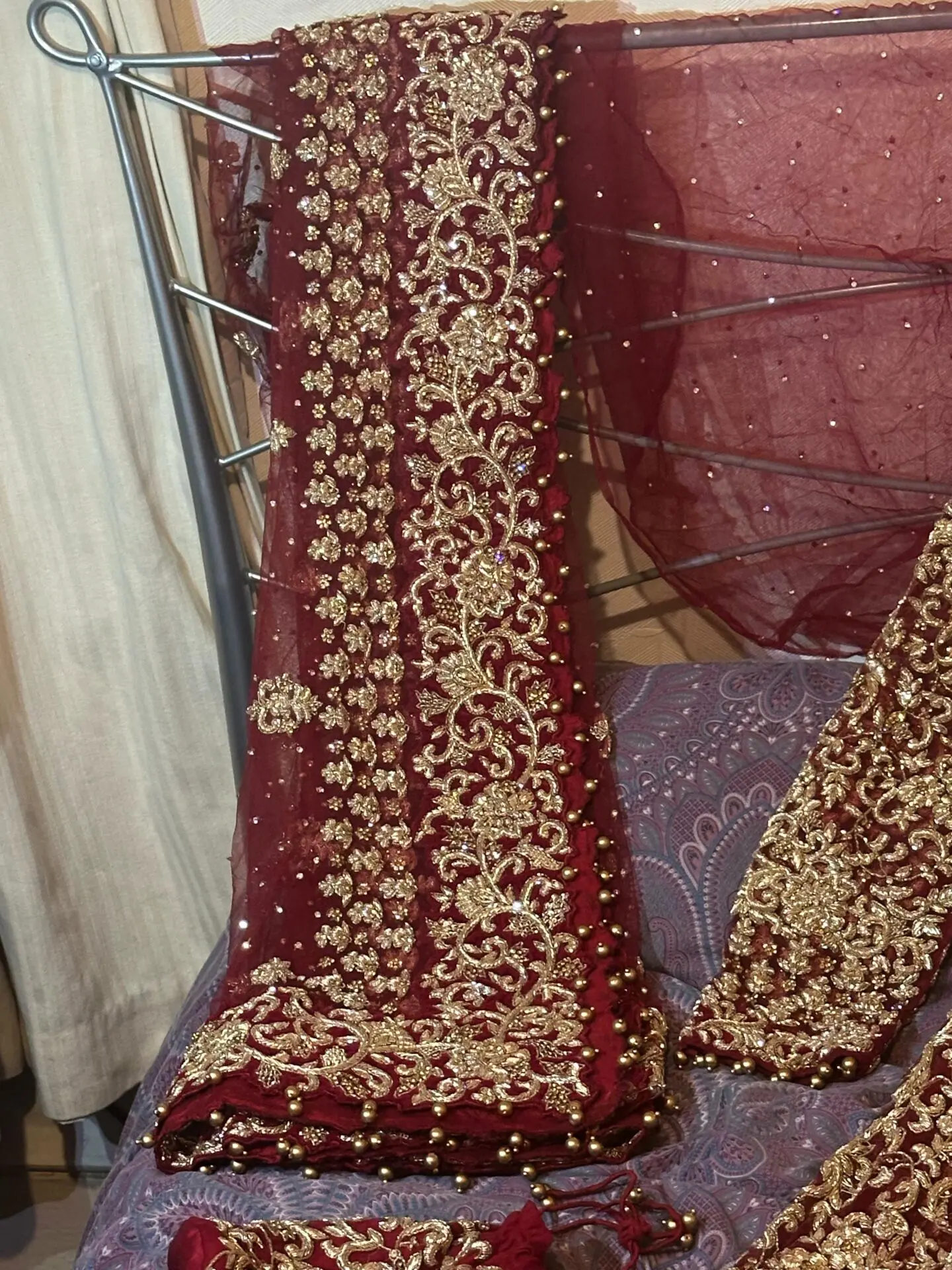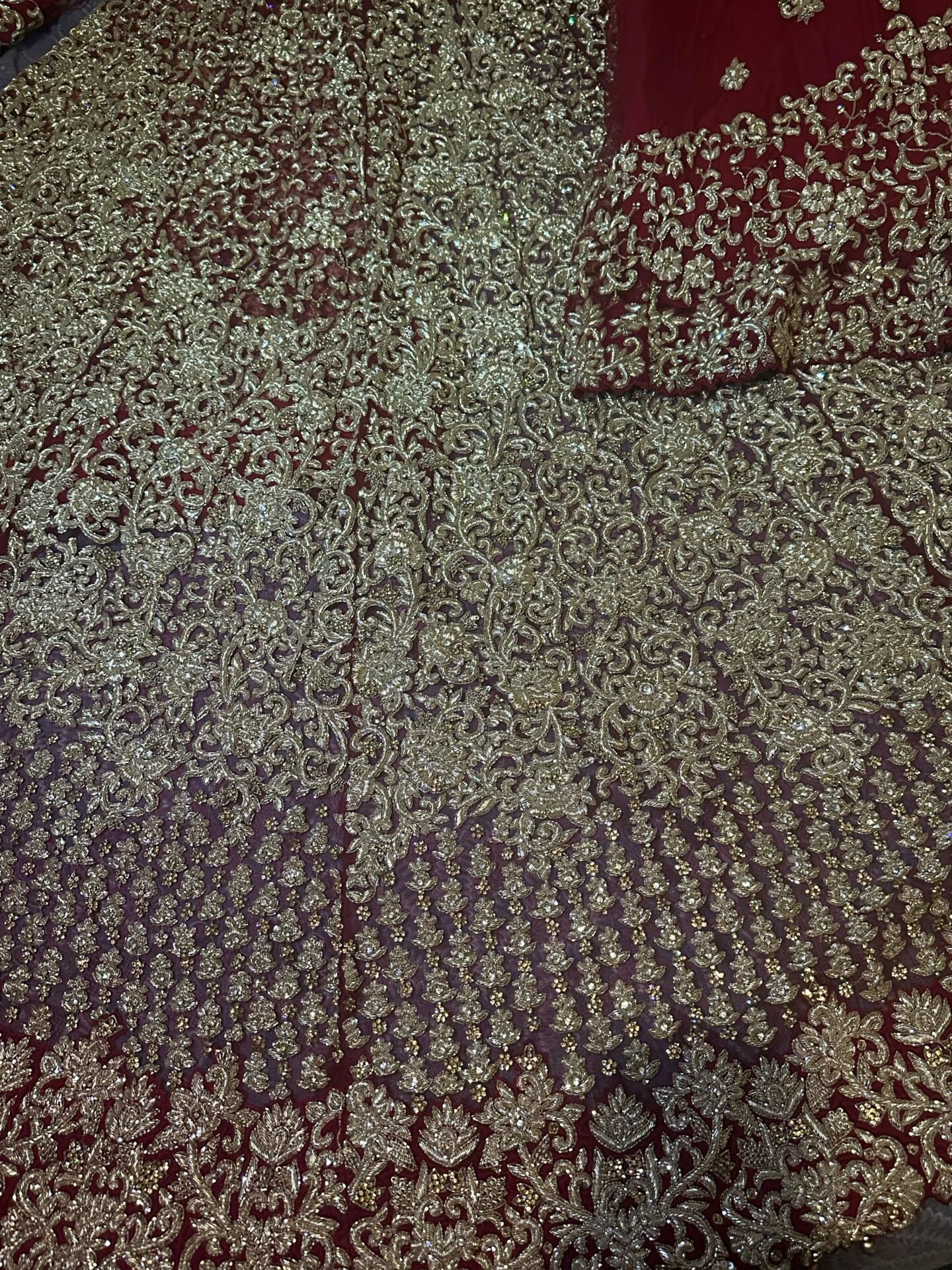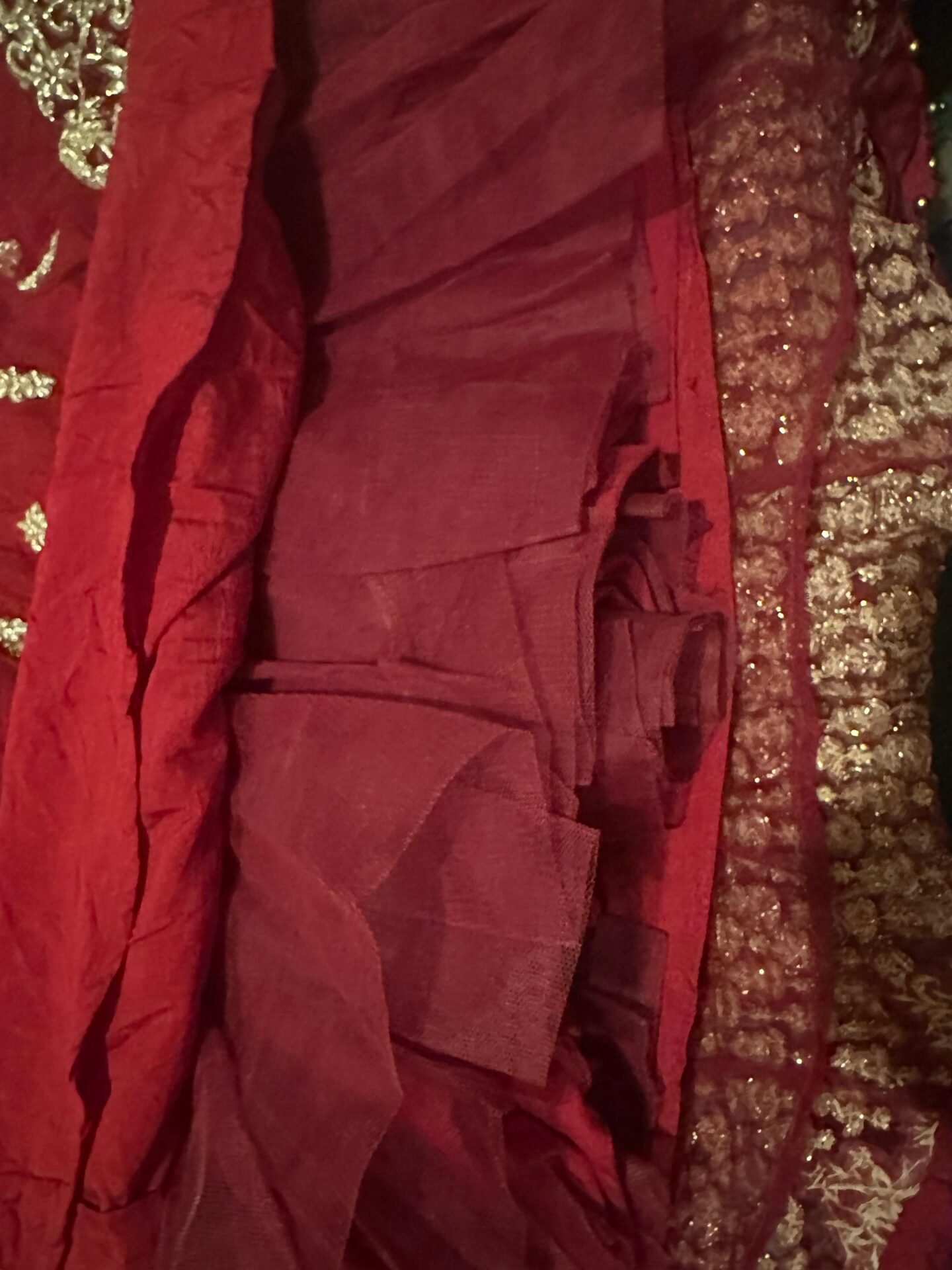 This stunning Asian bridal dress is sure to turn heads on your special day. The dress features intricate embroidery, lace, beading, sequin, and crystal/diamante detailing that adds a touch of elegance and glamour. The dress is made by the renowned designer Doli Bridal and is a size M. The bold red colour is perfect for an Asian nikkah/wedding.