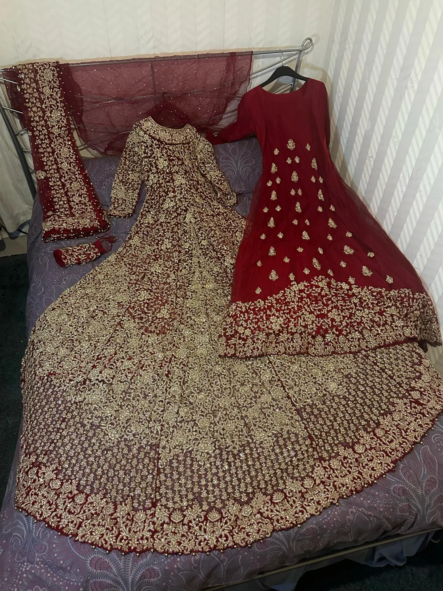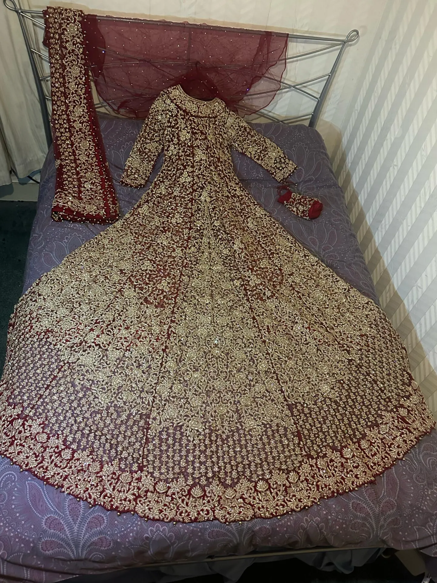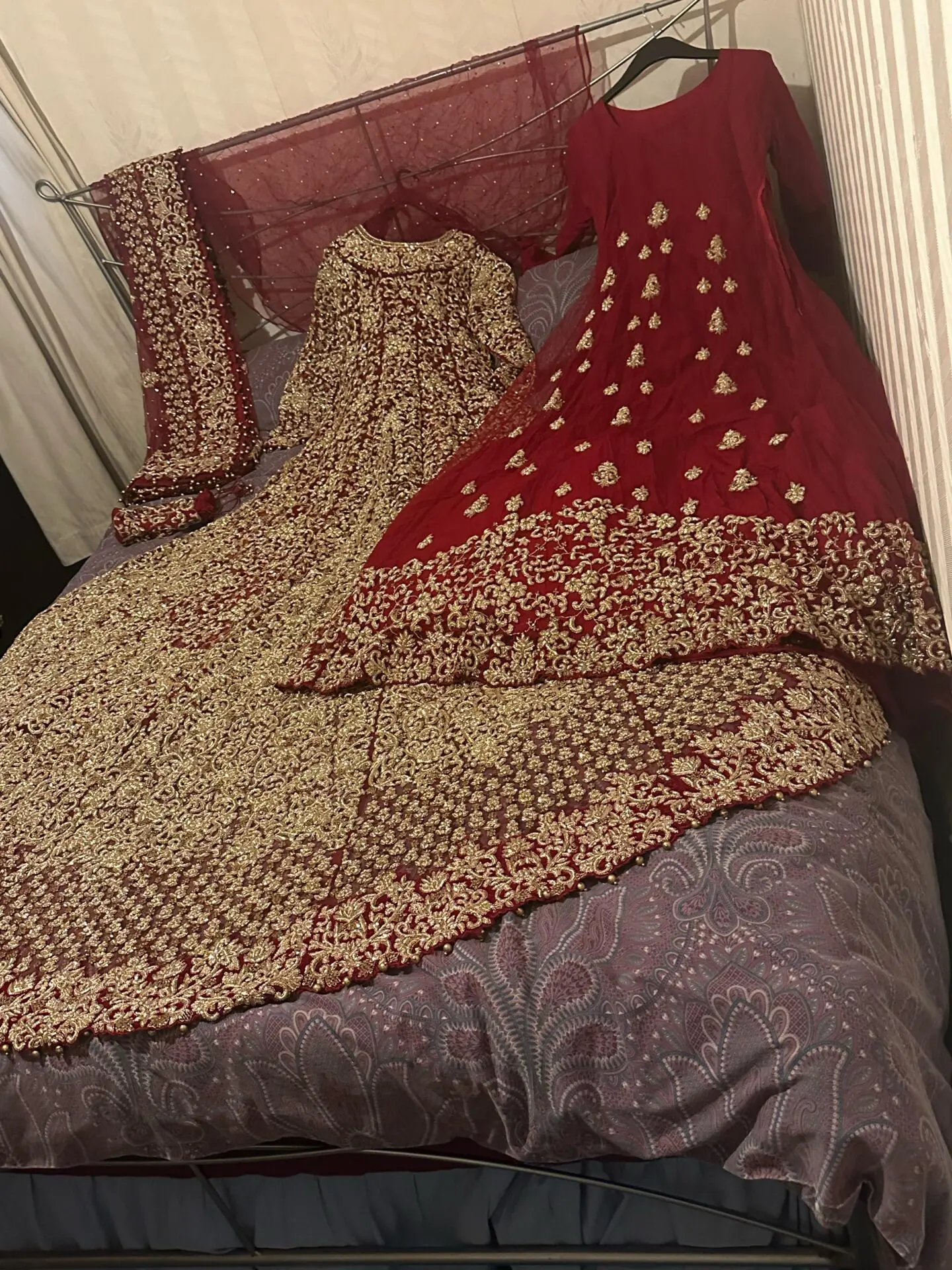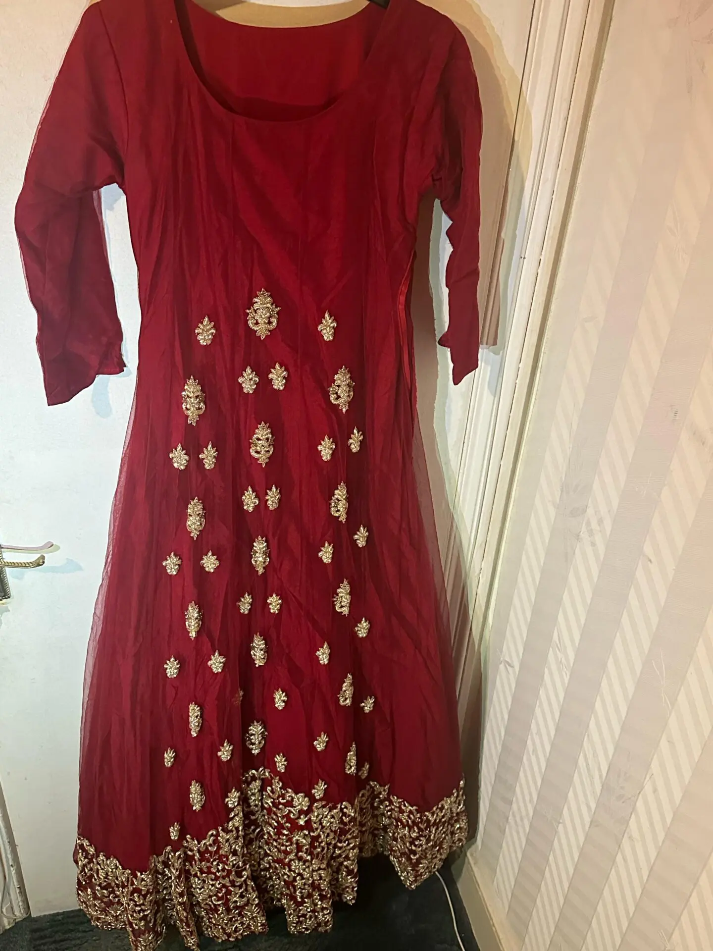 This stunning Asian bridal dress is sure to turn heads on your special day. The dress features intricate embroidery, lace, beading, sequin, and crystal/diamante detailing that adds a touch of elegance and glamour. The dress is made by the renowned designer Doli Bridal and is a size M. The bold red colour is perfect for an Asian nikkah/wedding.