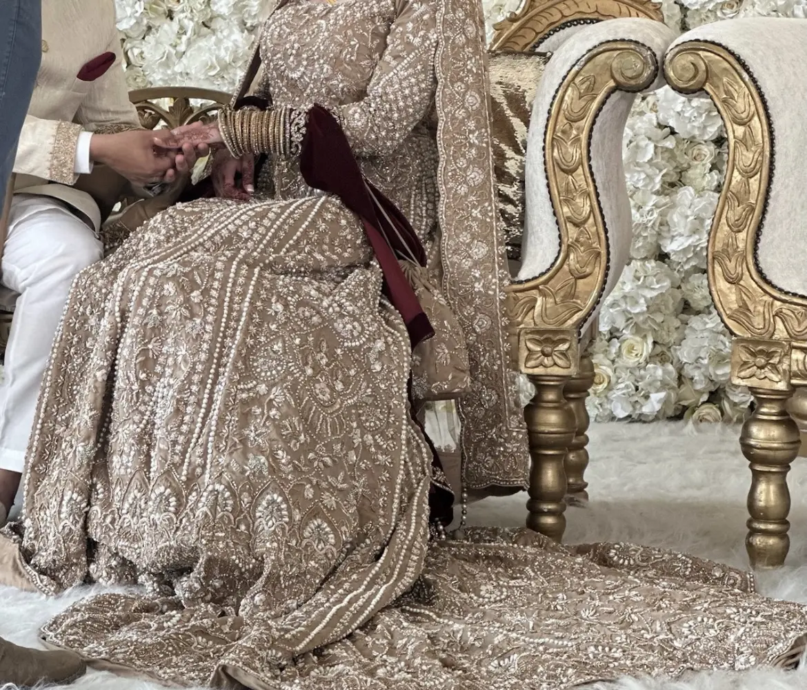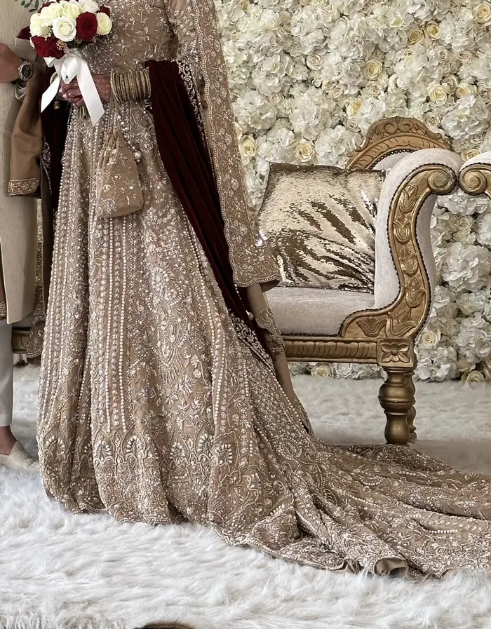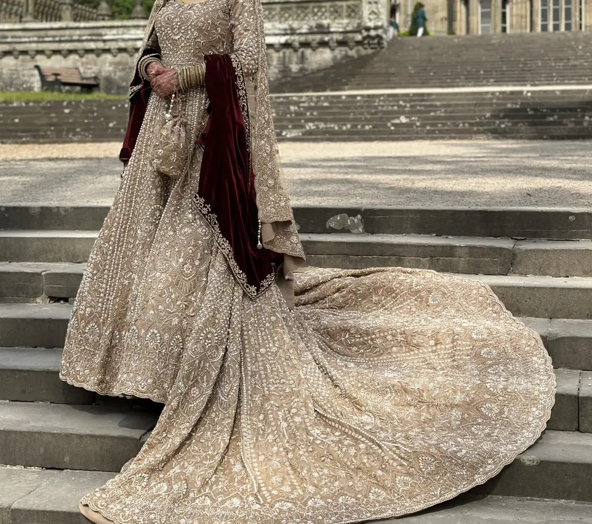 Heavy Pakistani Bridal gown with trail. Size Small, can also be tailored in. Colours- Gold/Ivory. A Maroon Ruksati scarf also available. Small Potli Bag included.