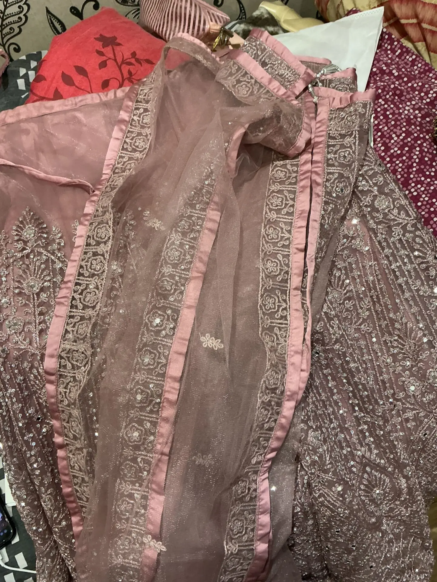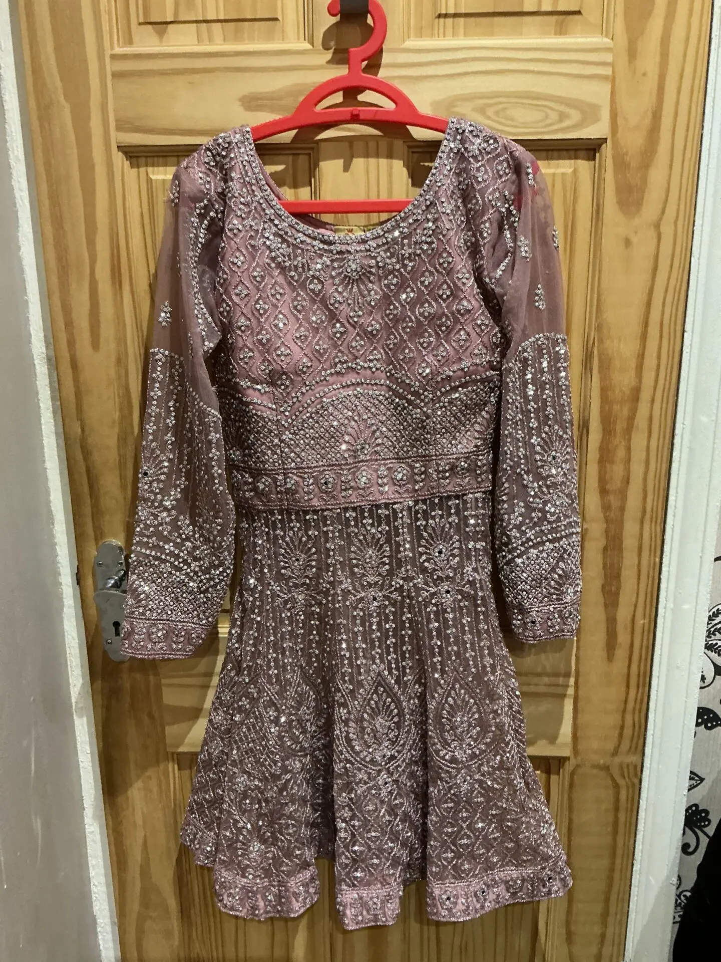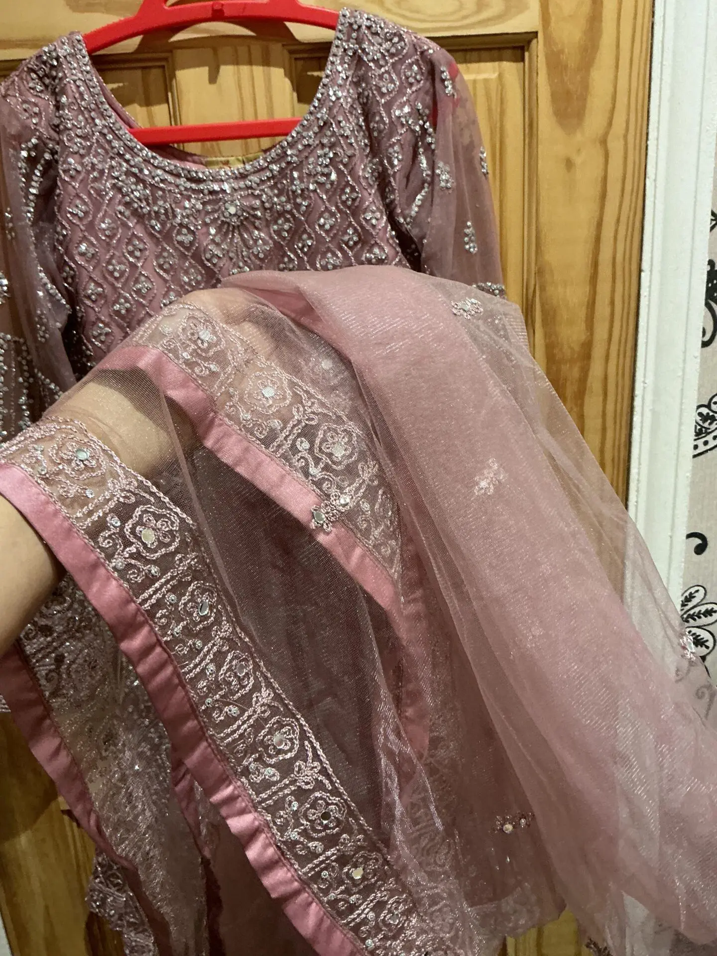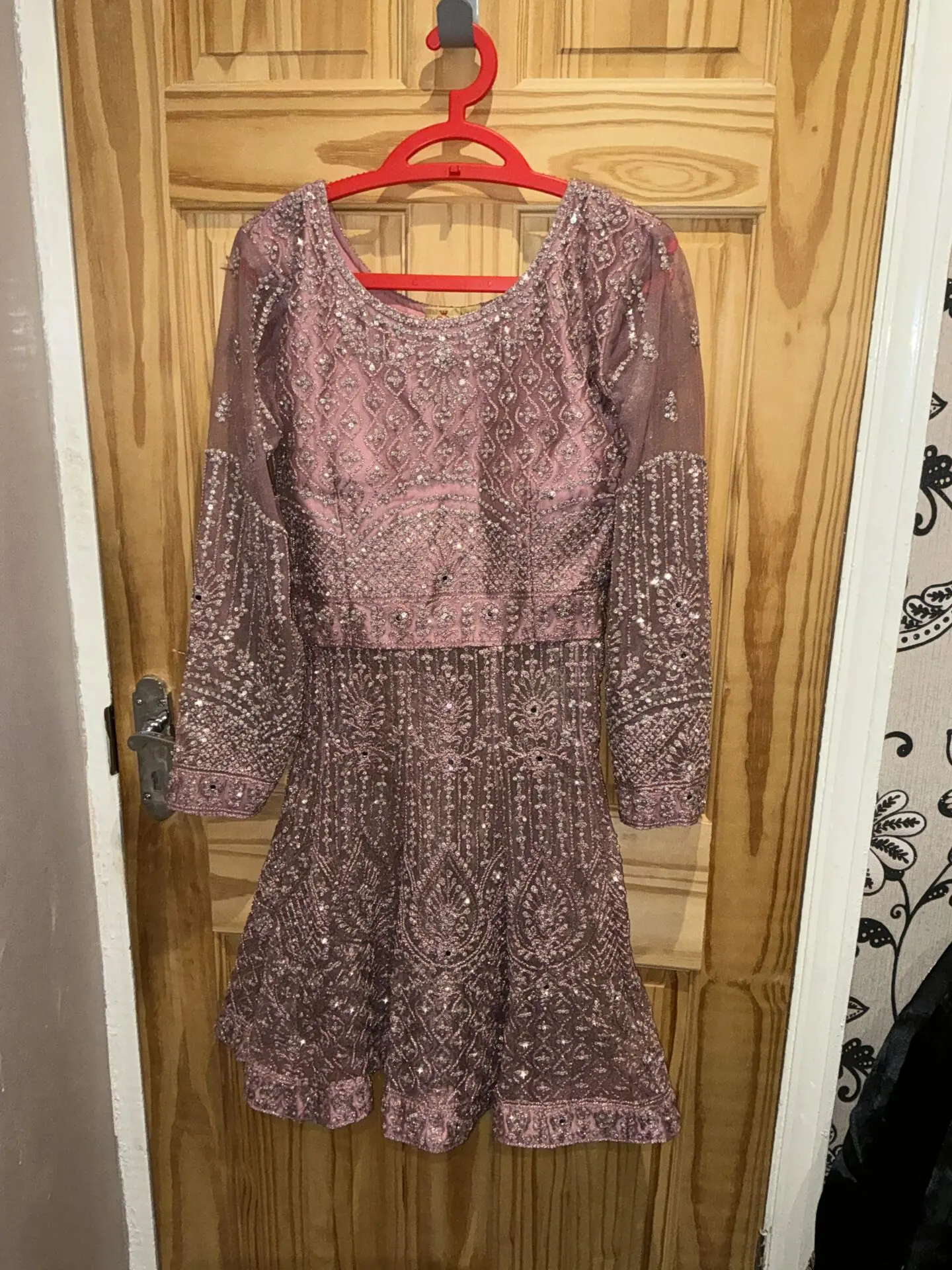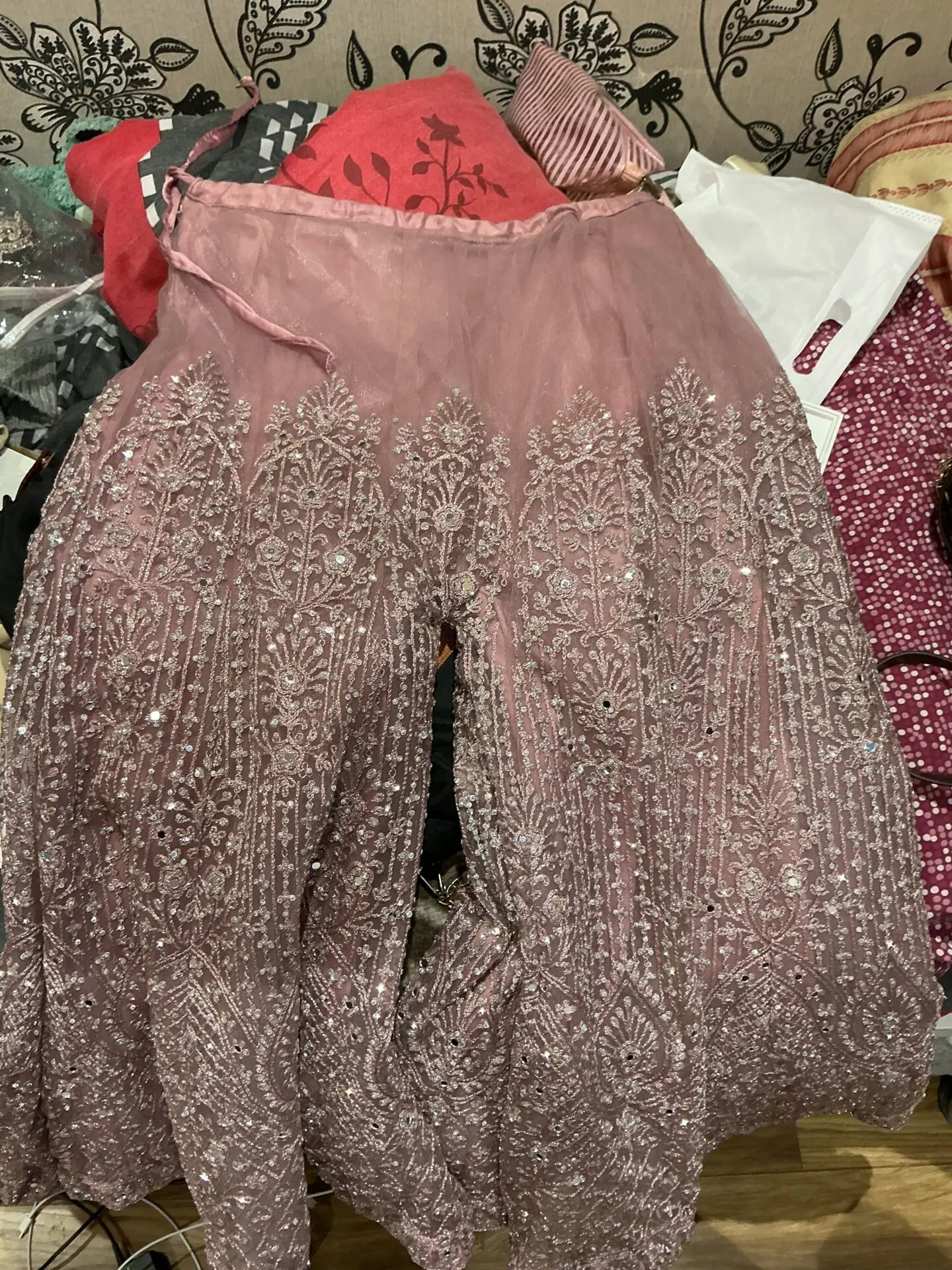 Super pretty sharara in baby pink , very flattering on will fit anyone xs / petite it is tight fitting . So super pretty , and will look so stunning . It is a 3 piece suit and is quiet heavy ! Worn just once , and is in very good condition , i can negotiate on price so message me if you have any other questions