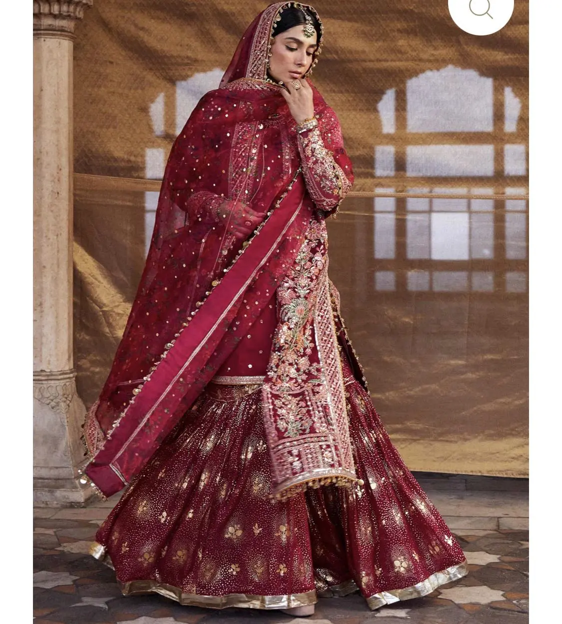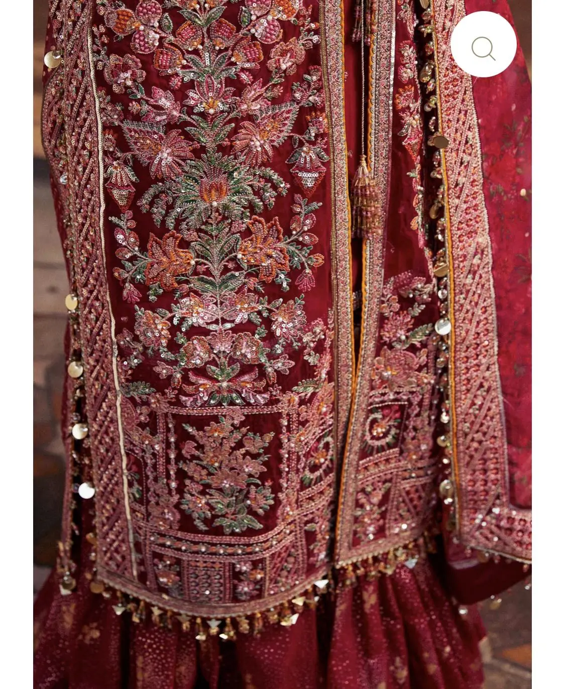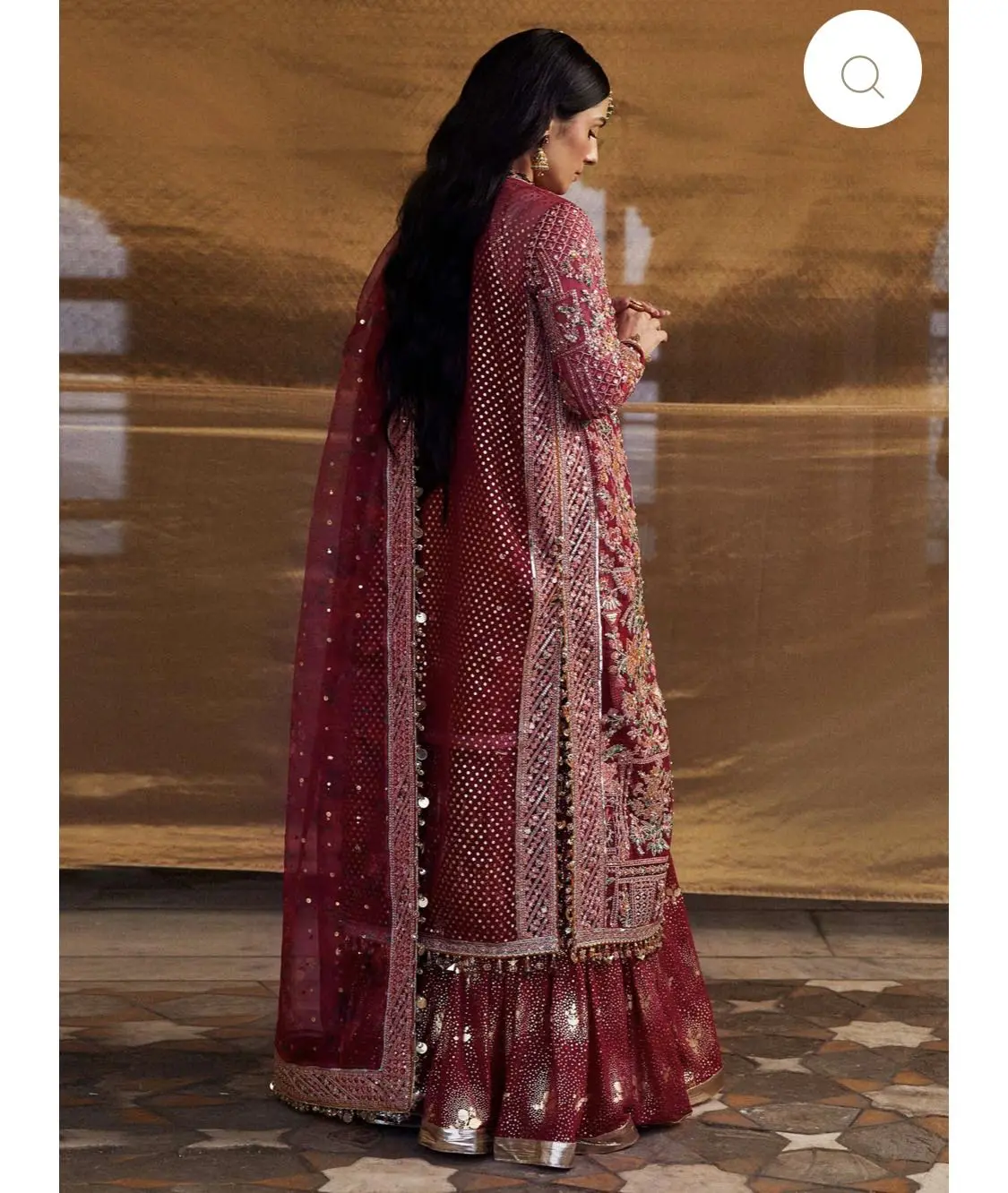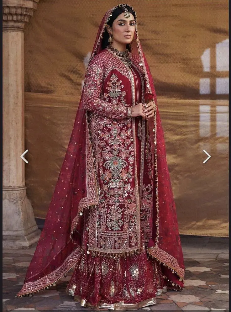 The formal outfit is made of embroidered and embellished organza jacket, giving it a luxurious and intricate look. The inner shirt is a chiffon sequined piece, bringing some sparkle and glamour to the ensemble. The trousers are a chiffon foil print sharara, giving a trendy and traditional look. And the dupatta is an organza digital printed with foil print, featuring beautiful designs, and it's complemented by the four side embroidered borders. This outfit is a perfect blend of traditional and contemporary elements.
