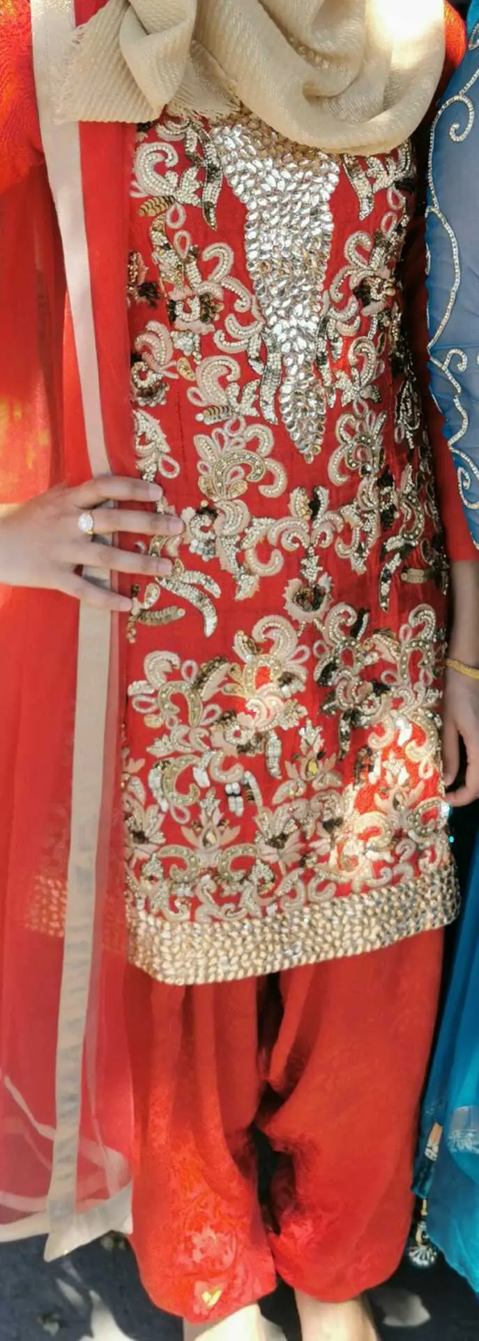 Beautiful red kundan salwar kameez. Good condition. Fits UK size small 8 to 10. Can be altered. Also long sleeves can be made short.