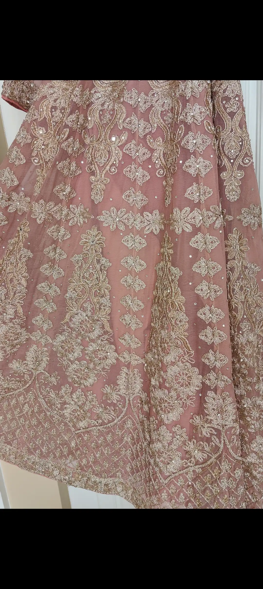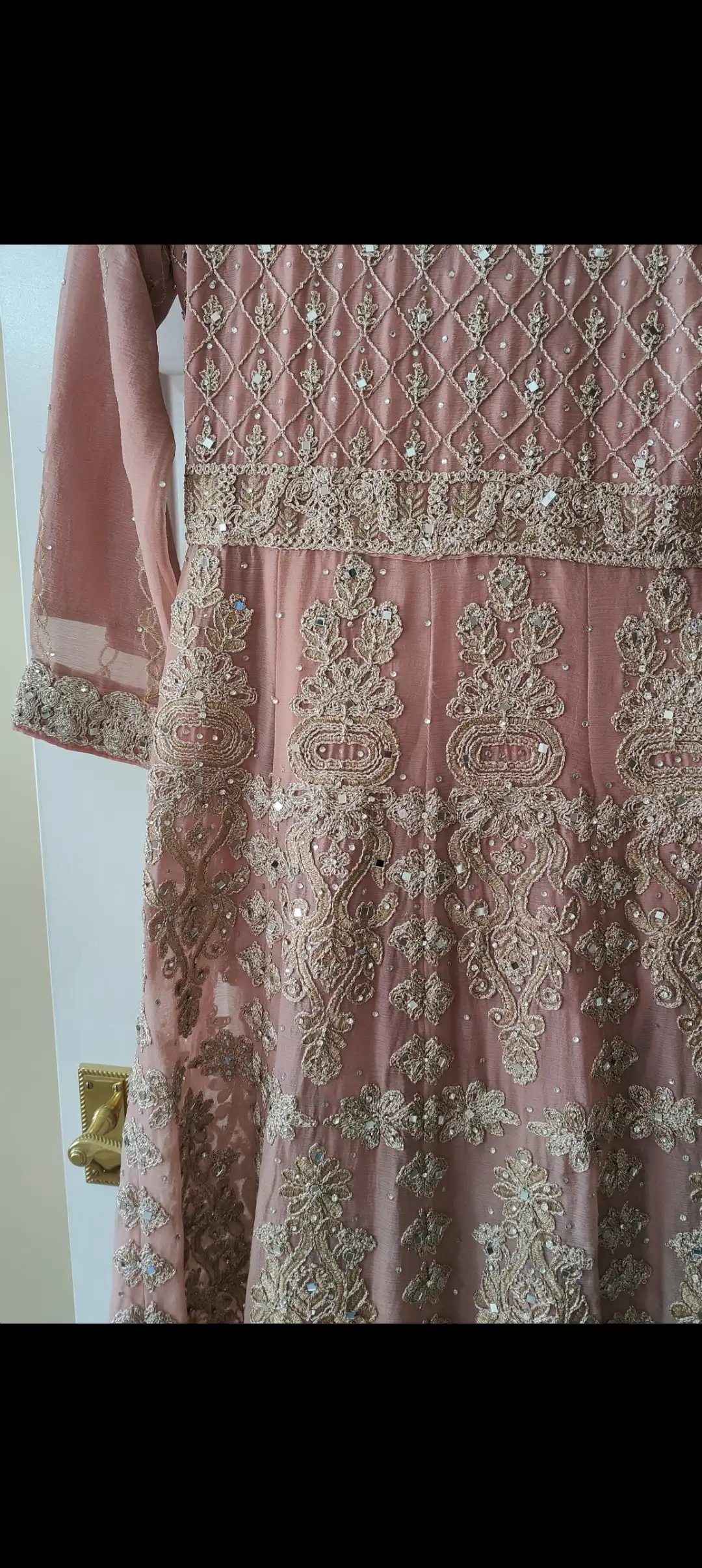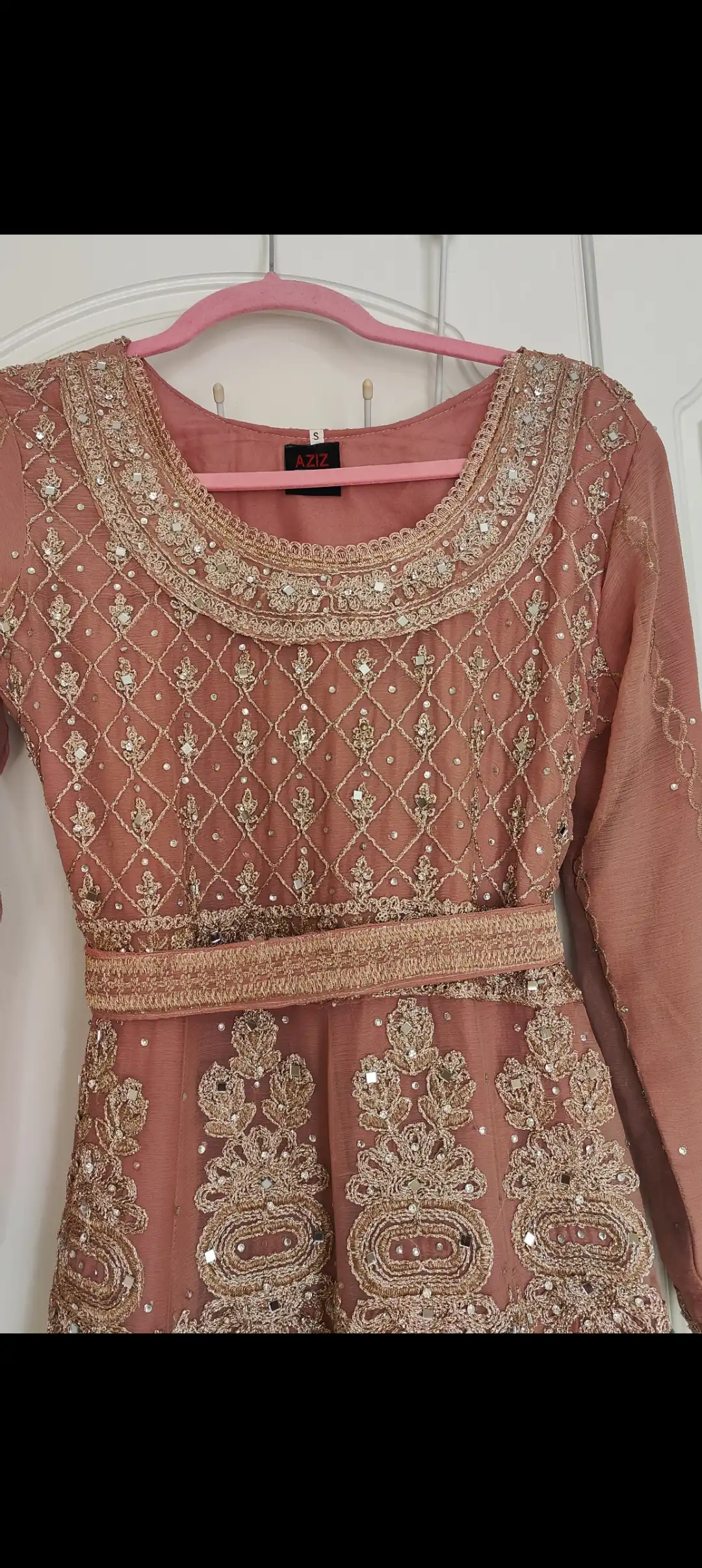Luxury outfit, fully lined dress, not zipped. With belt and dupatta. Small /8 length would suit 5ft 5 and above. Luxury Georgette fabric. Suitable for both formal and semi formal events, the subtle dusky pink colour makes it very easy to wear. Very clean, mark free condition. Looks lovely on, makes the waist look smaller.