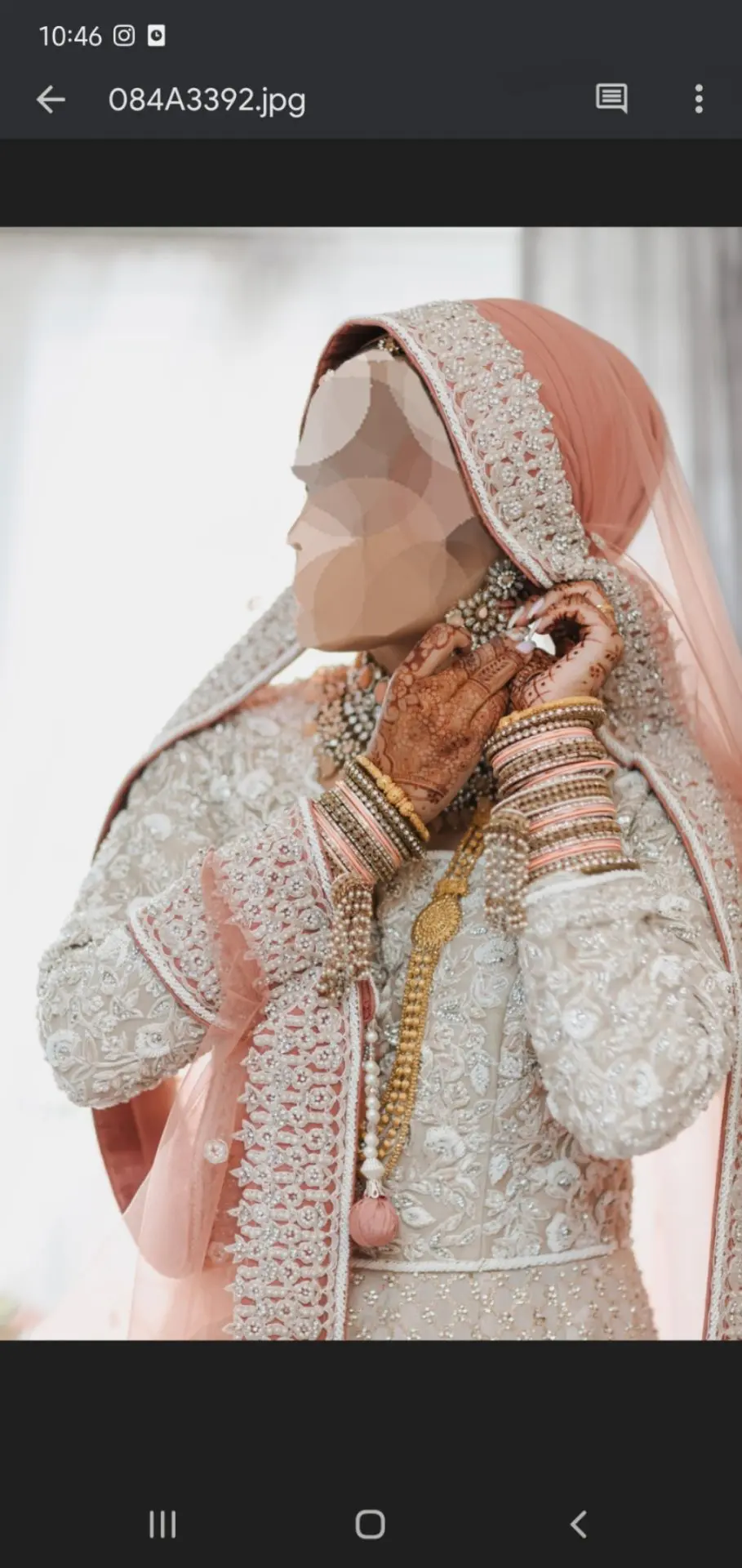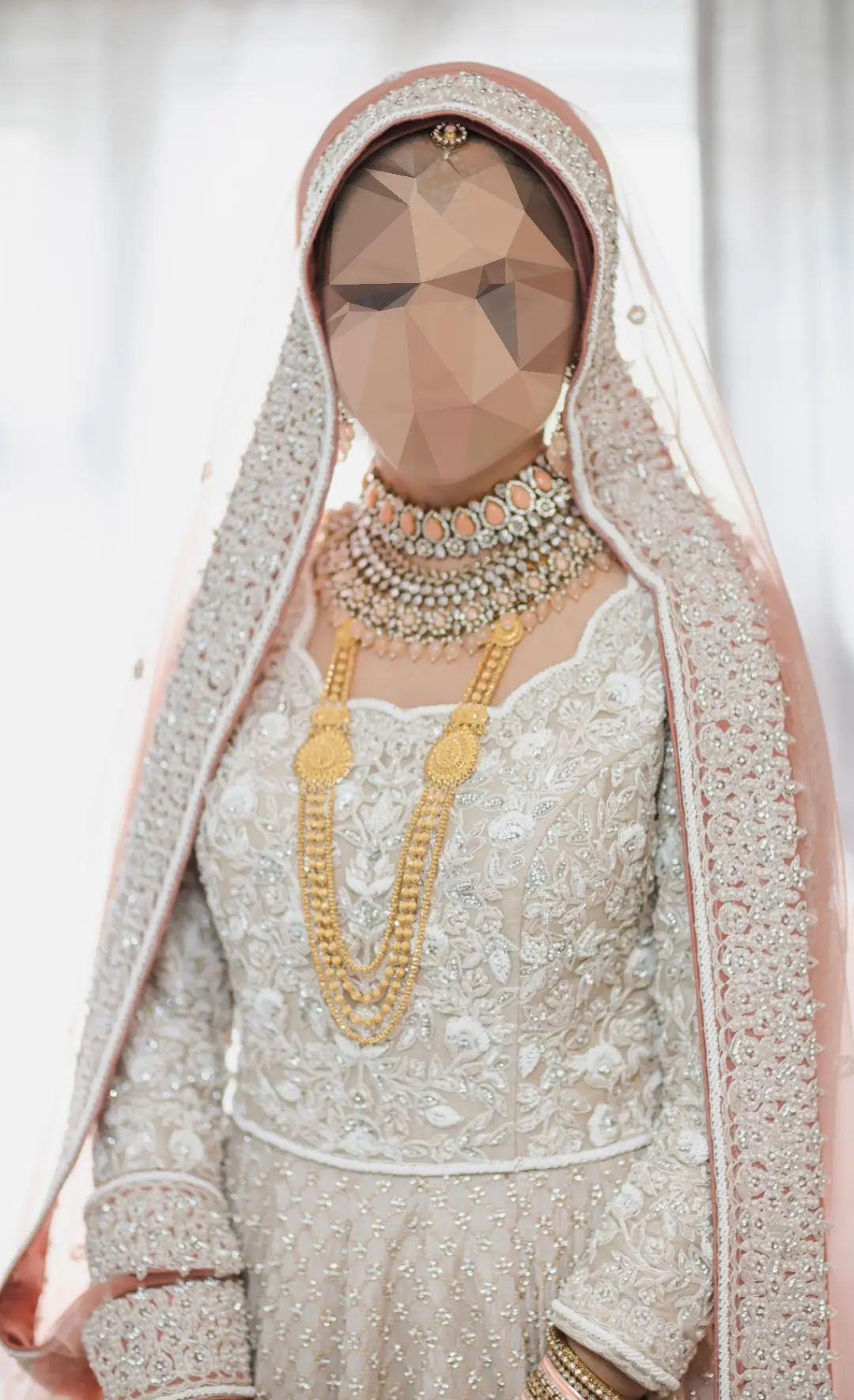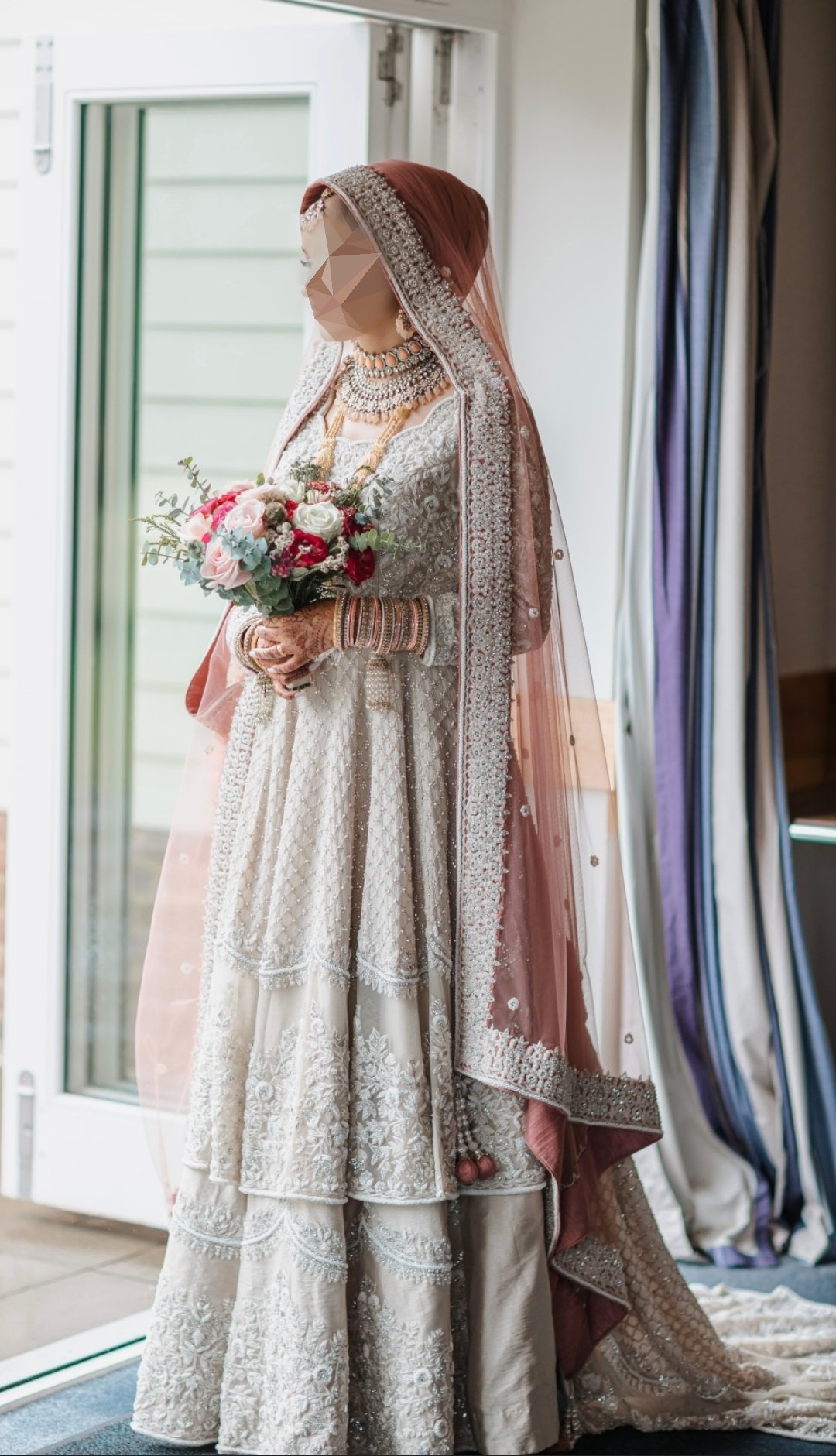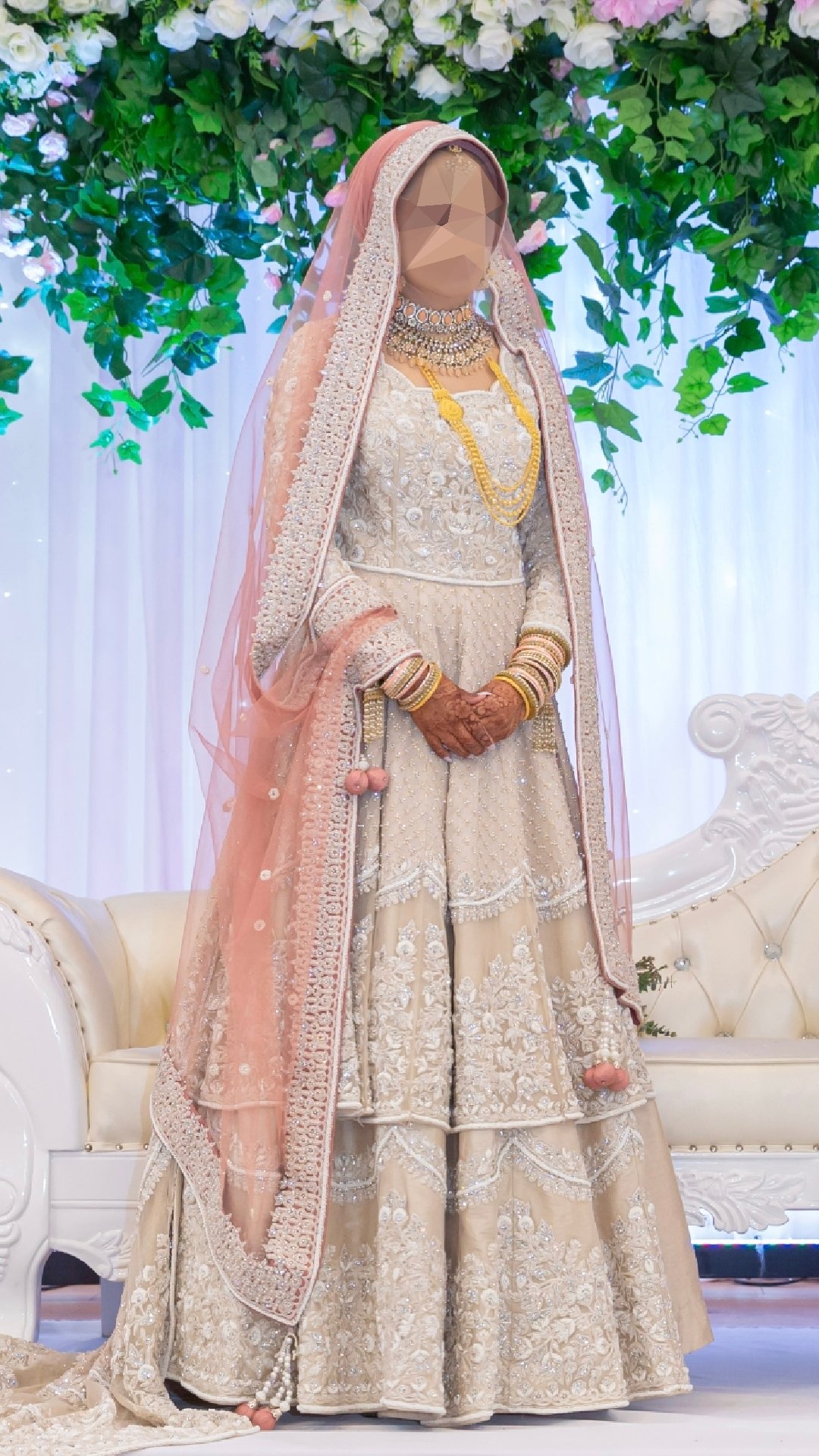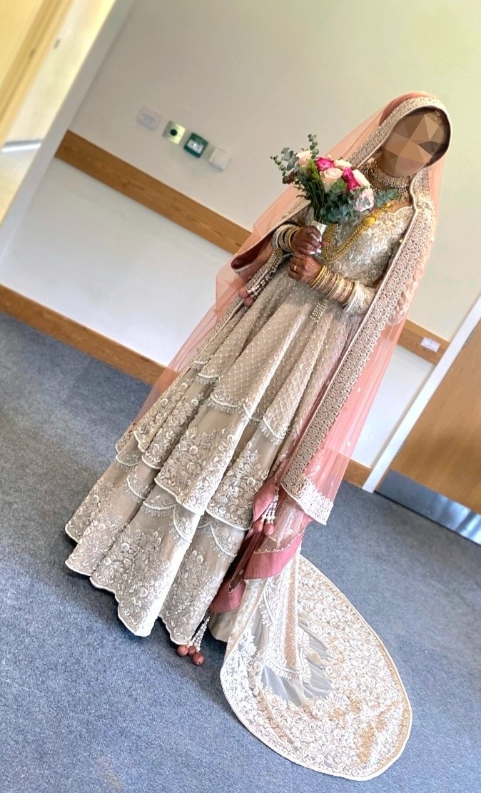 Ivory colour lengha dress, with pearl, ivory and blush pink bead embellishments and diamontes.